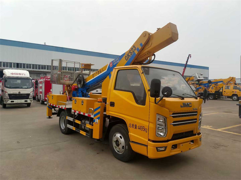 江铃顺威单排驾驶,云内122马力发动机,带原厂空调,方向助力,2800轴距,带ABS等,整车不超重,免购置税上装配置:作业臂采用4节7边形高强钢同步伸缩作业,最大作业高度23米,前V后H形支腿,支腿可单独调节,作业臂360…