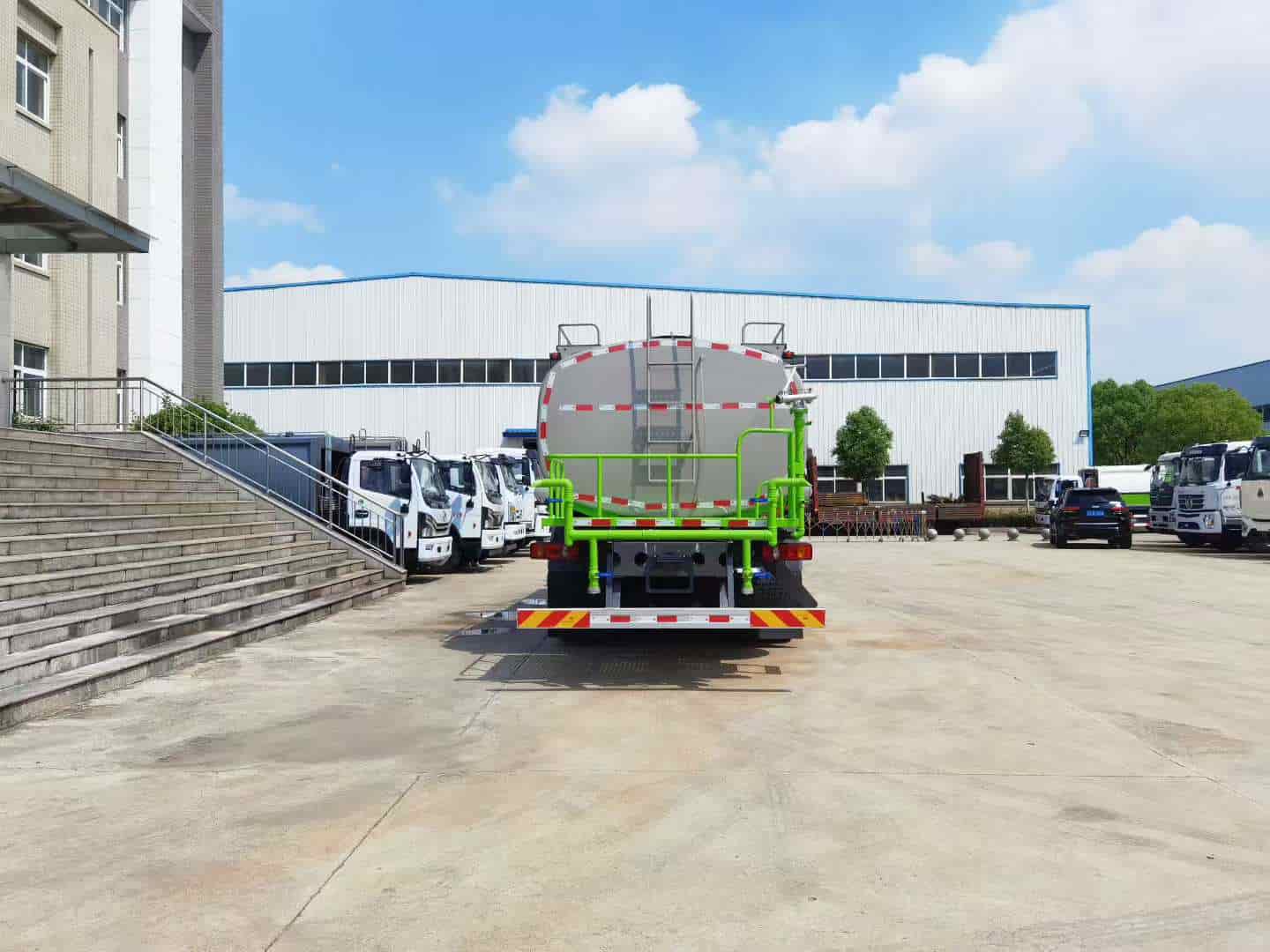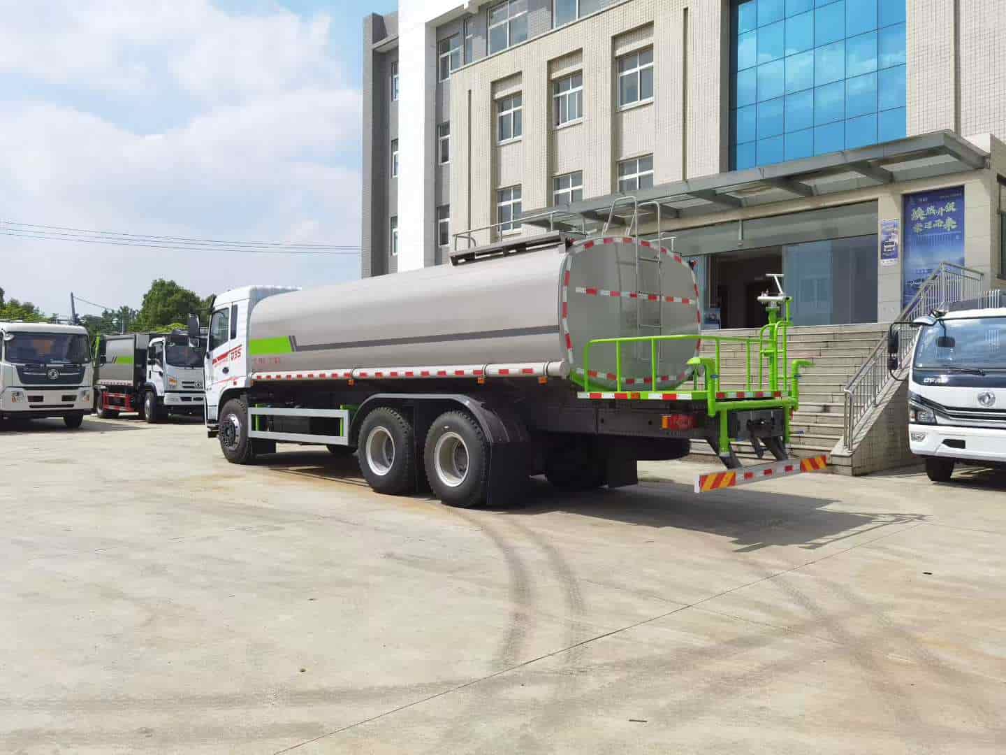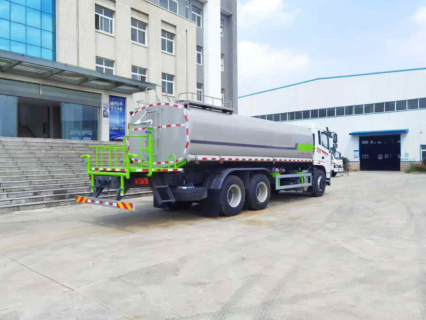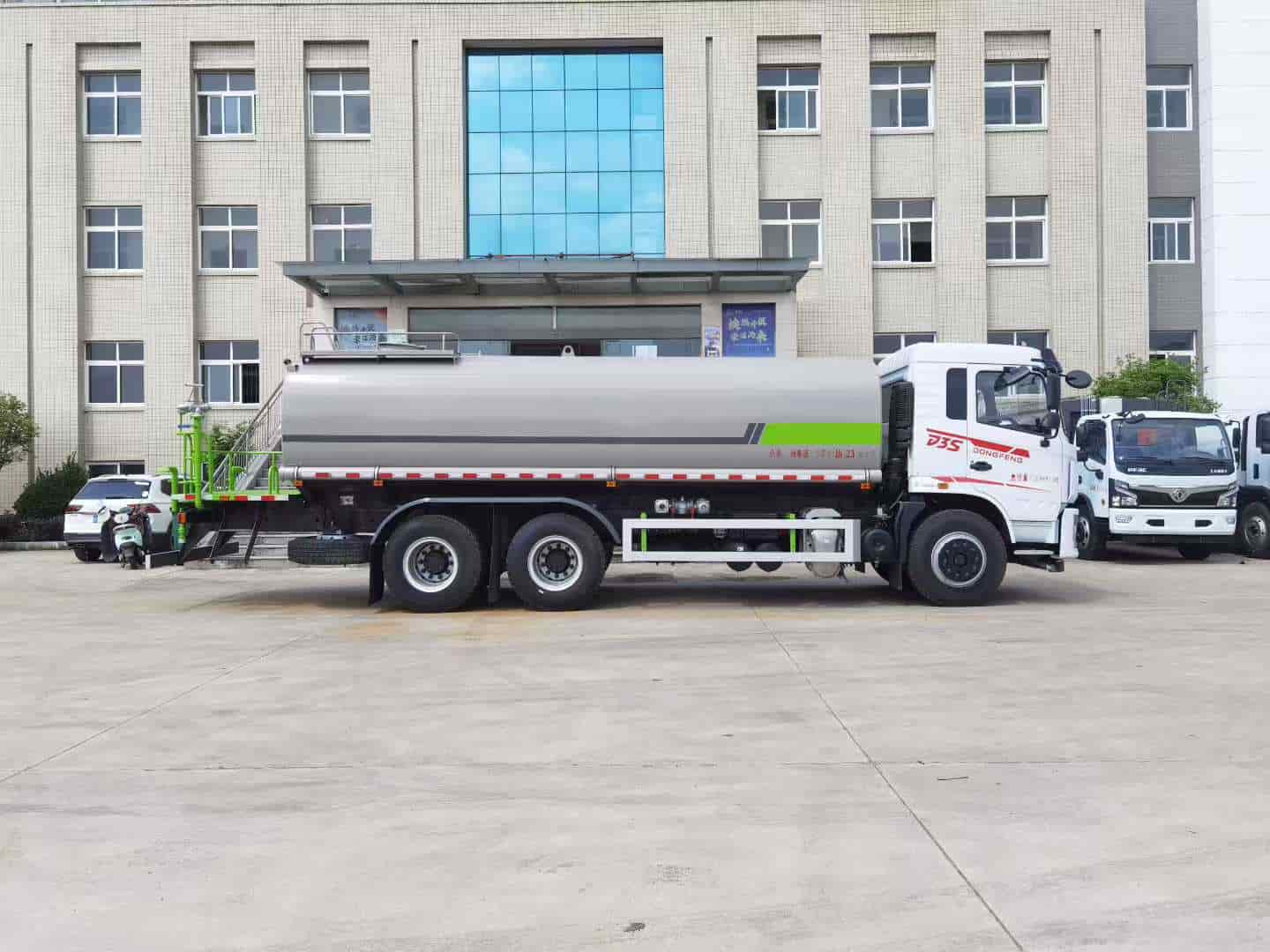 上装配置:罐体采用标准Q235碳钢板制作,罐体可装水22方(公告:罐体总容量18.23立方米,罐体有效容积17.36立方米),配60-90洒水泵,可自吸自排,带前万向对冲,后洒,侧喷,高炮,