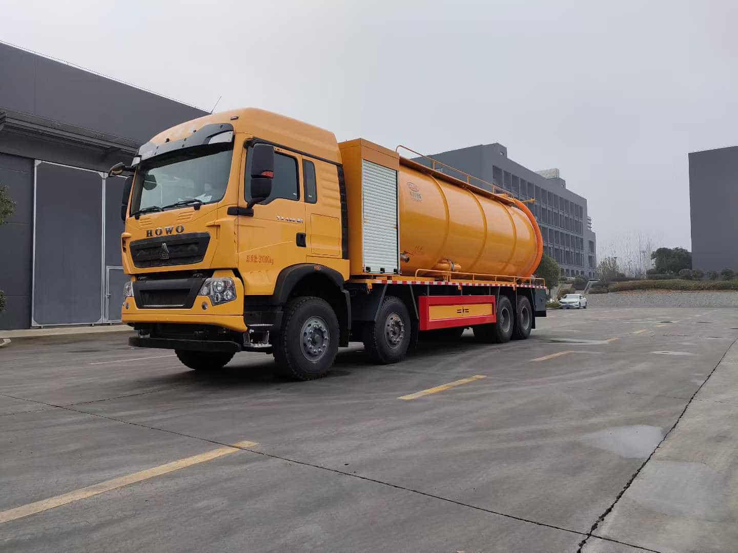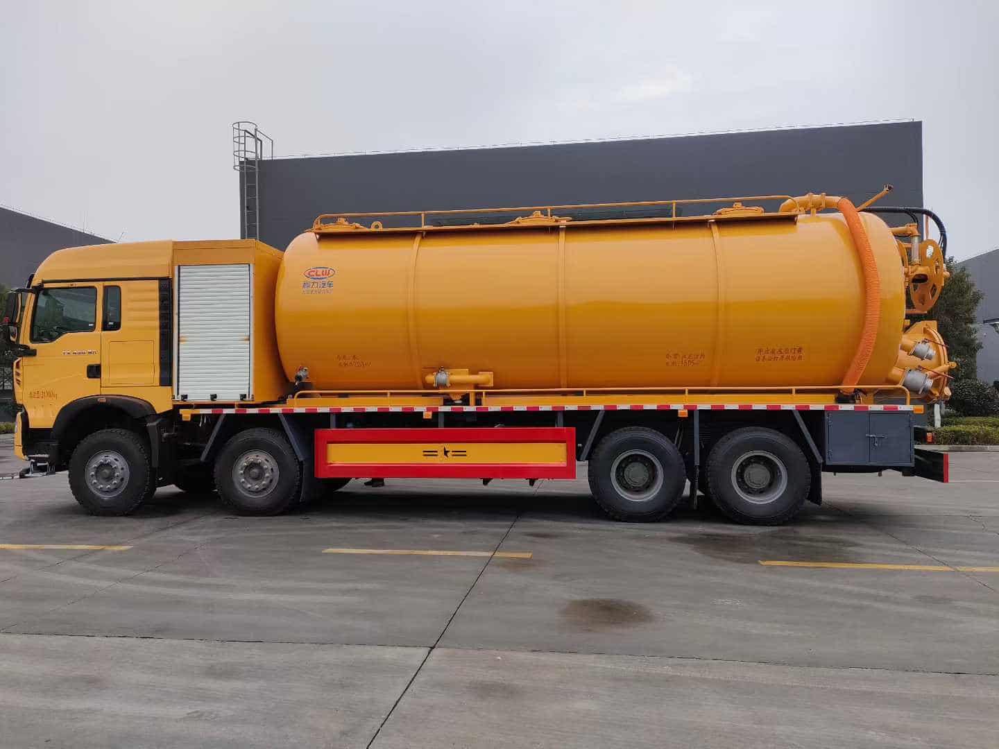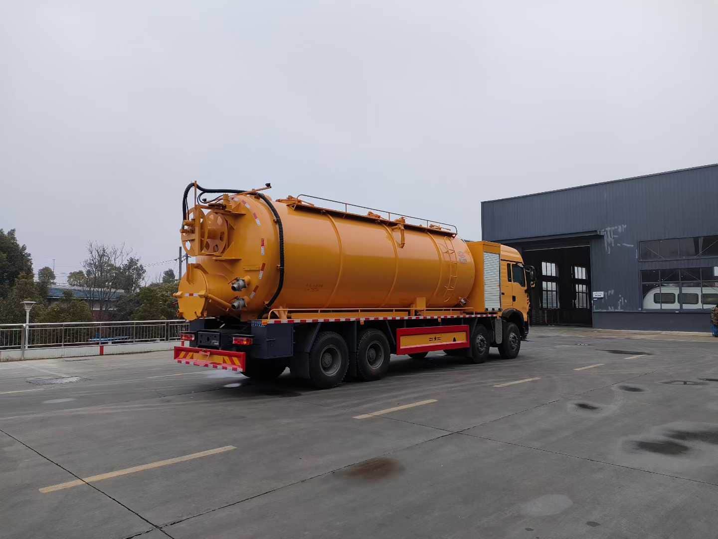 上装配置:罐体总容积约33立方,清水箱约10立方,其余为污水罐,加强大架,自卸设计,两仓互通,采用8mm碳钢制作,吸污部分,副发采用潍柴420马力配SK-258水循环泵,8米吸污管,罐体两侧加宽平台加护栏,后部开一个800mm液压开启排污口,一个150排污球阀,和一个100的排污球阀,100内抽球阀,偷排150球阀,后部左右各一个箭头灯,配品浮350流量,配100米内径25定制耐磨高压管,带卷盘,卷盘液压左右旋转,配10公斤枪头一个。