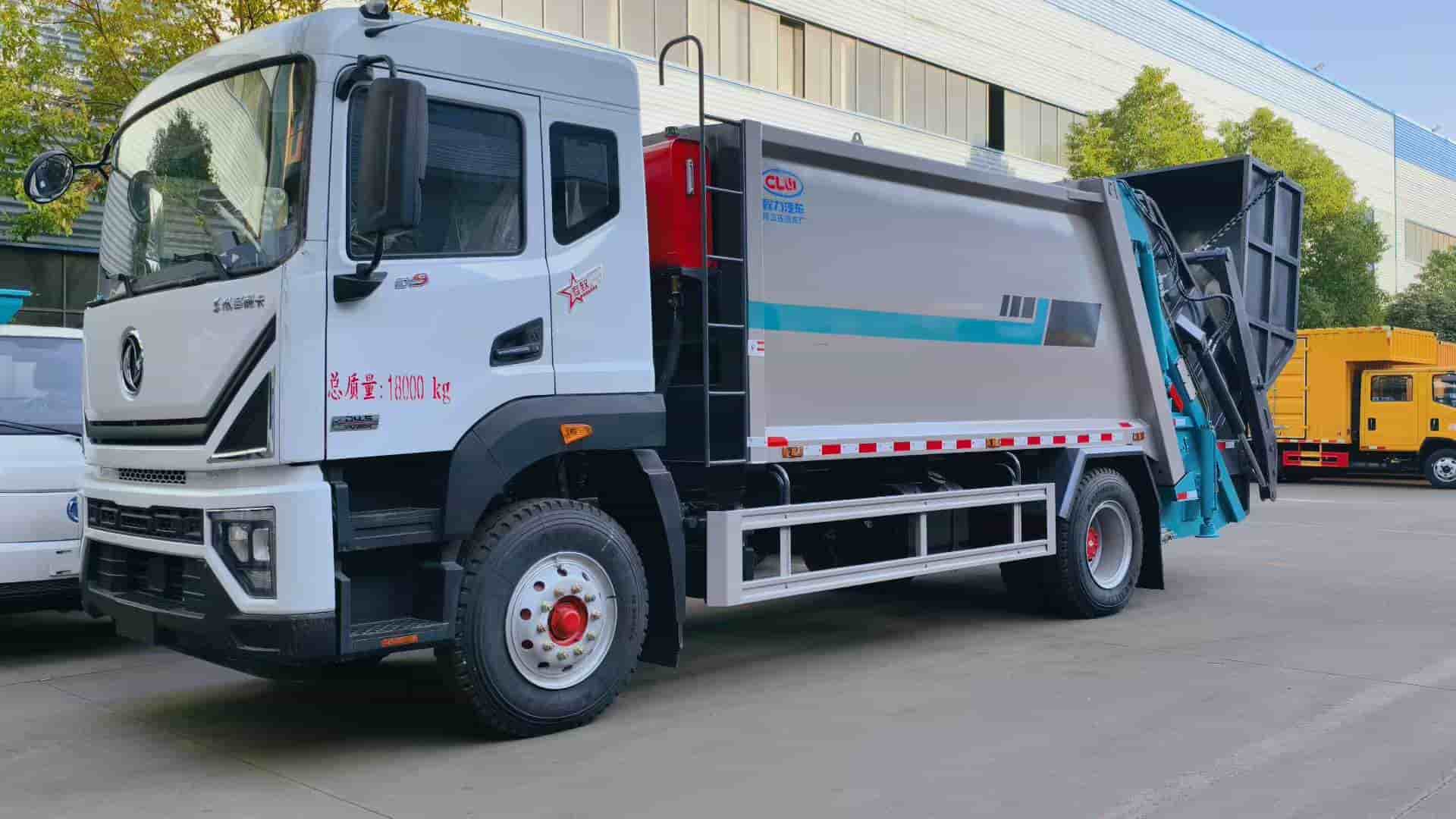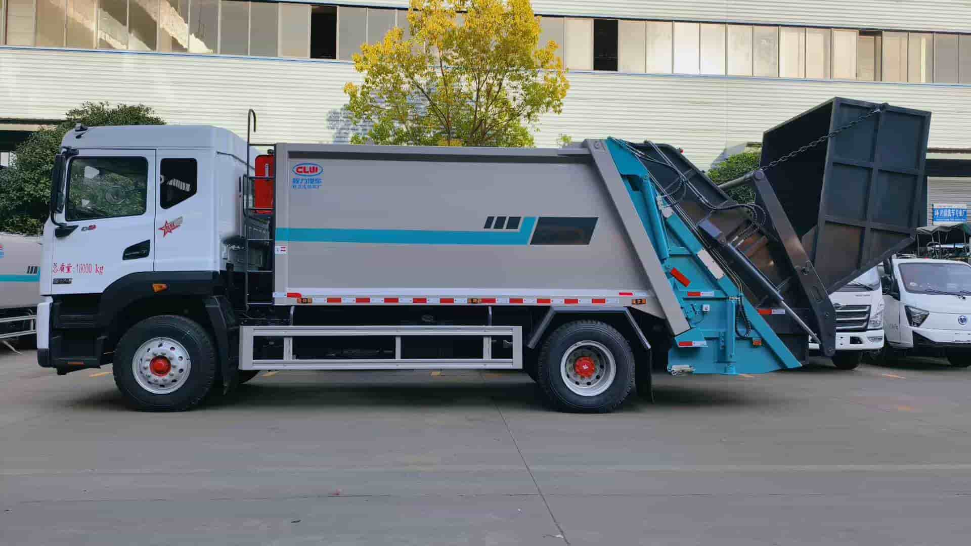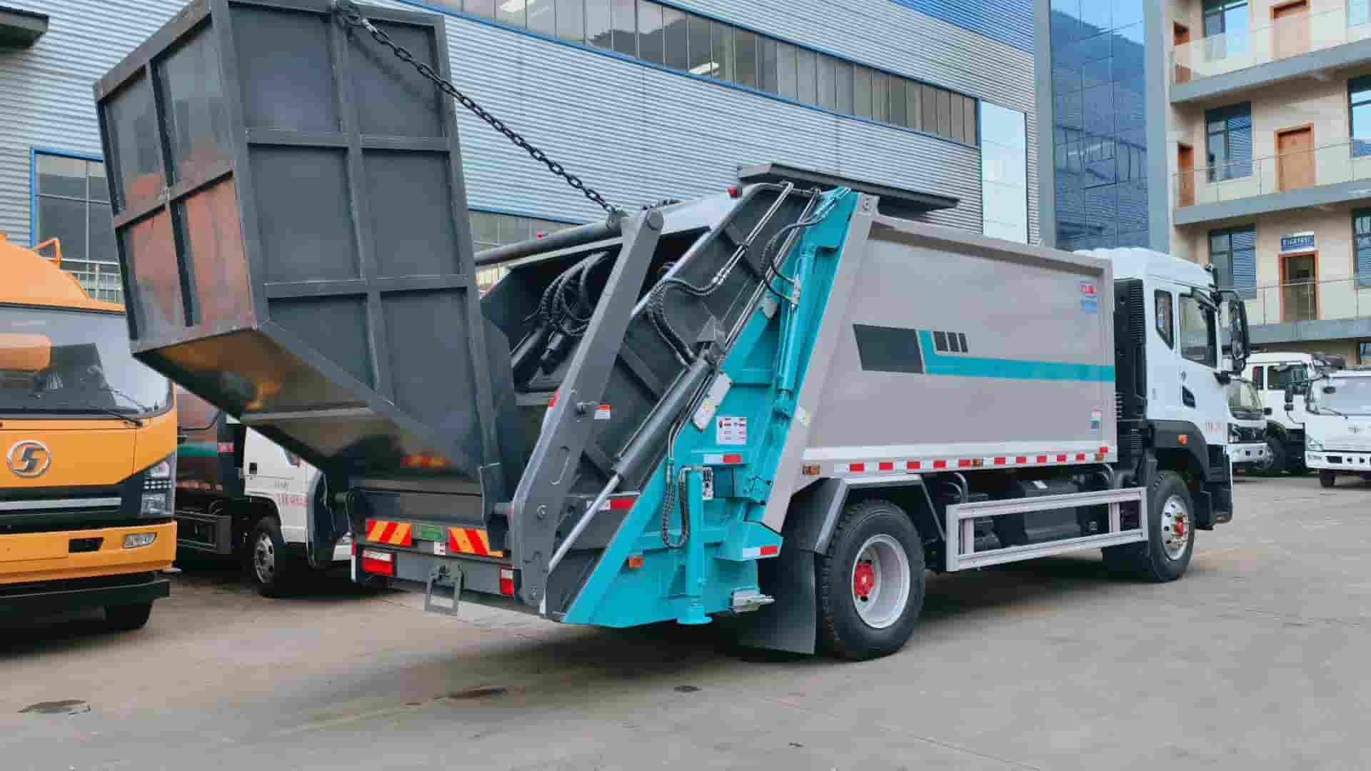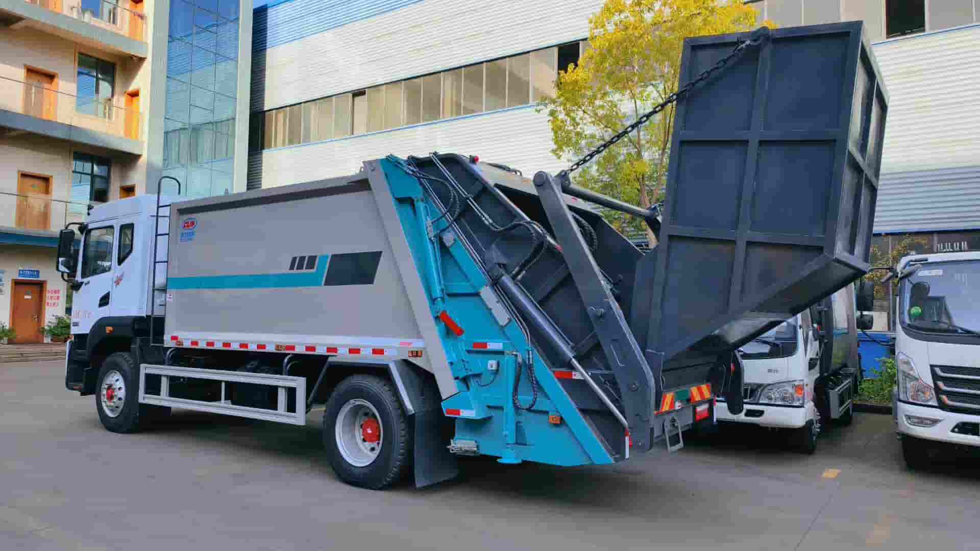 康明斯240马力发动机,陕齿八档变速箱,4500轴距,1000钢丝胎,填装器尾部摆臂翻转机构,带4立方船型垃圾斗