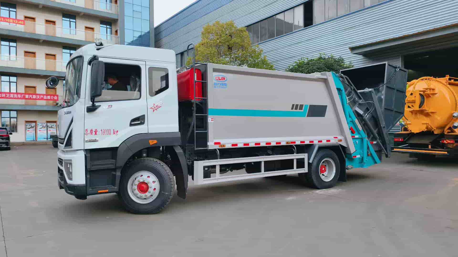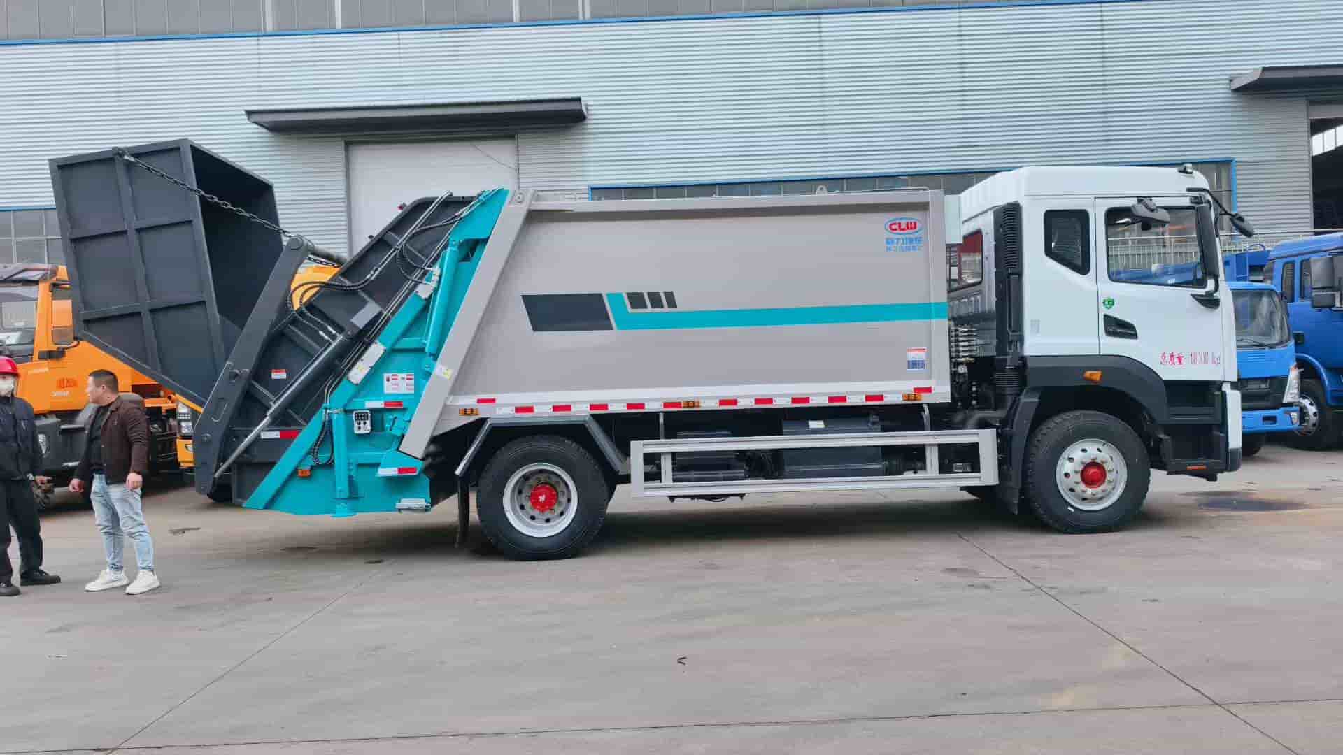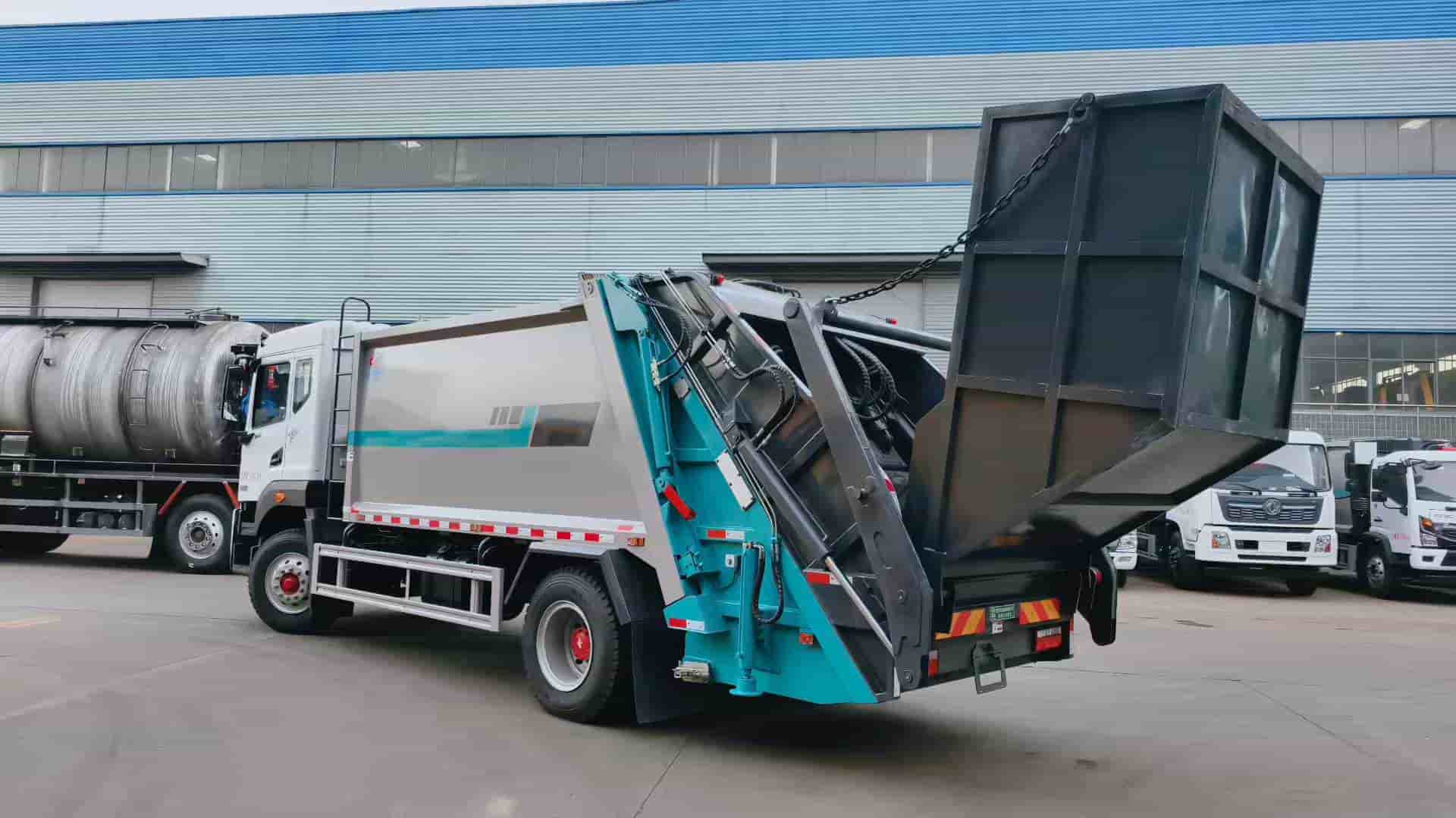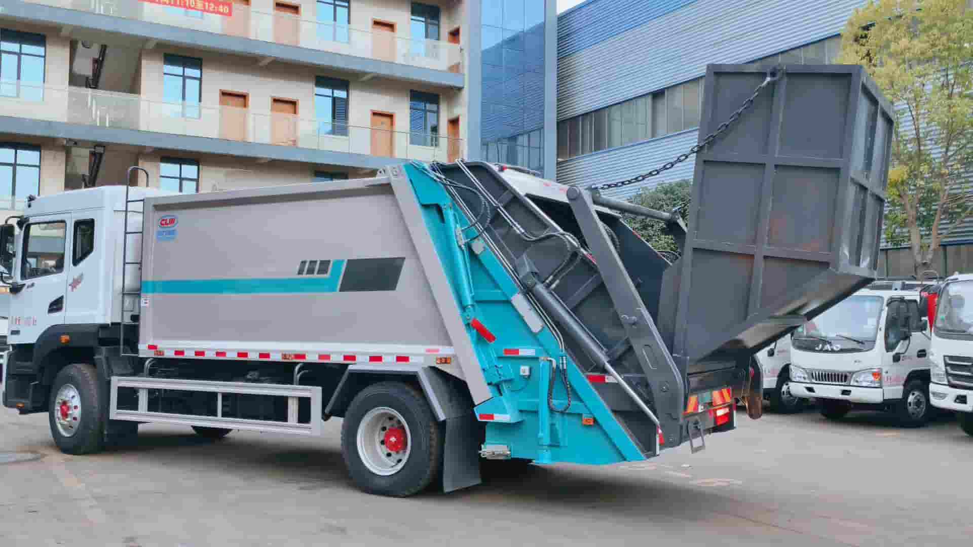 康明斯240马力发动机,陕齿八档变速箱,4500轴距,1000钢丝胎,填装器尾部摆臂翻转机构,带4立方船型垃圾斗