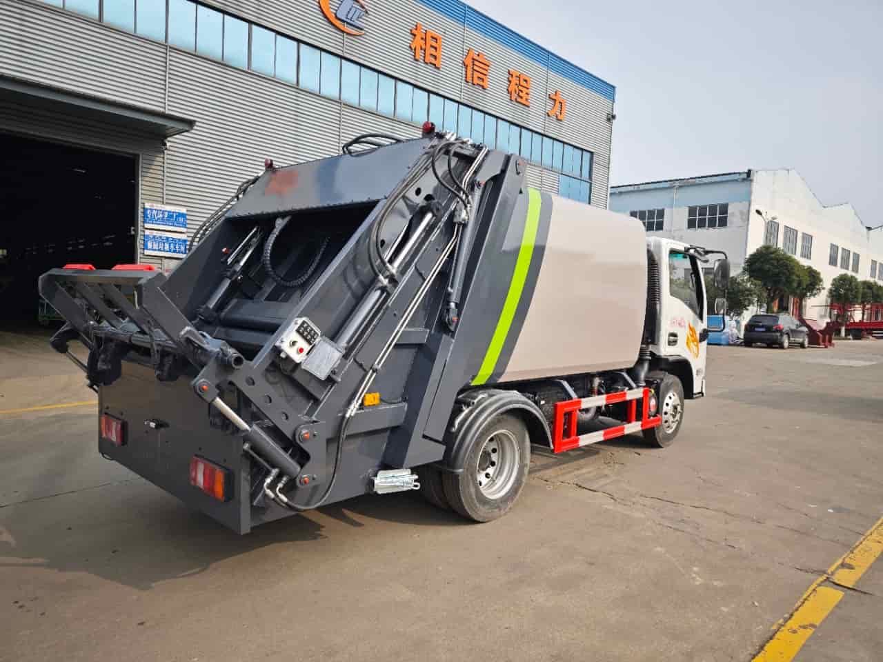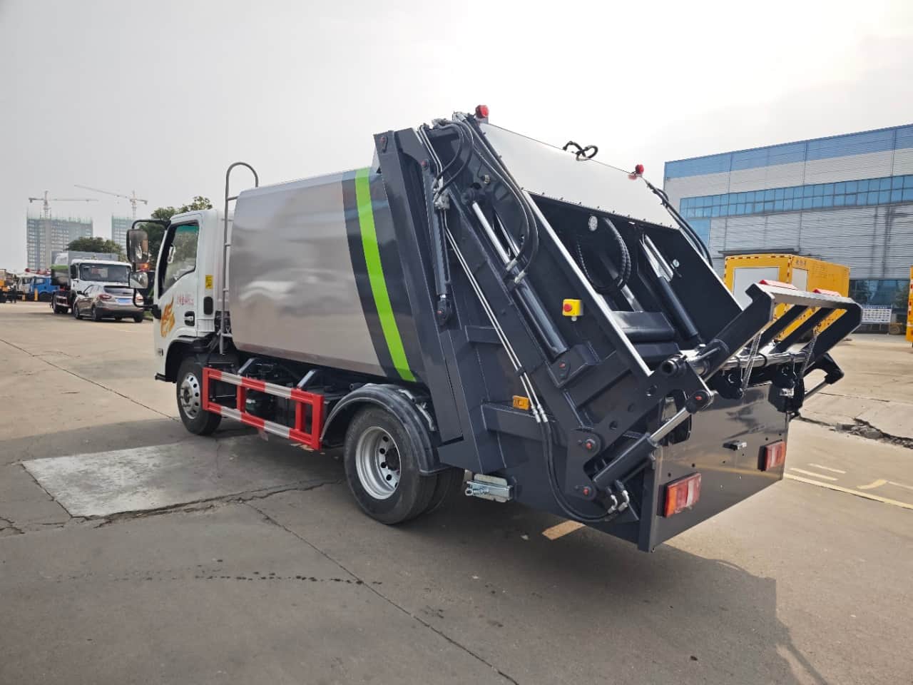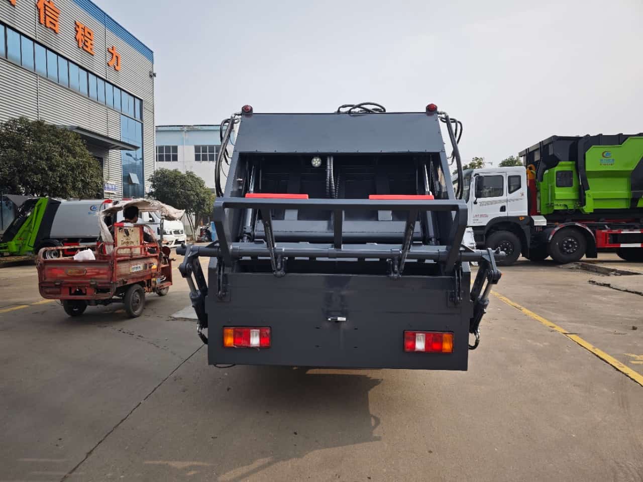 上装配置:箱体容积约6.5立方,新款弧形箱体,采用优质高强度Q345锰钢材料制作,后包采用高强度钢制作,单泵,整体阀;国标240升翻桶架,翻转底座两边采用轴承固定,CAN电控系统,驾驶室内控制面板带油门调节和故障预警功能,尾部带操作盒(副驾侧为手动电控按钮操作,正驾侧为急停开关和装卸载转换开关),带无线遥控器,带被压阀,其他按标准配置。
