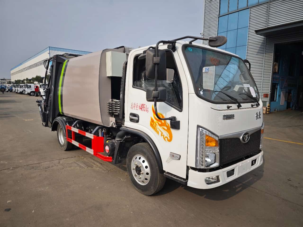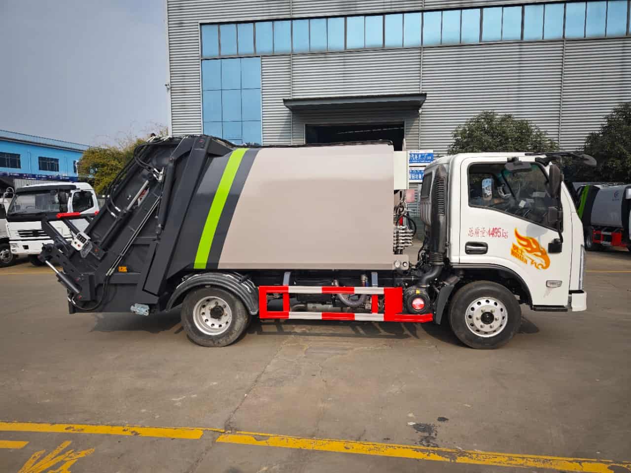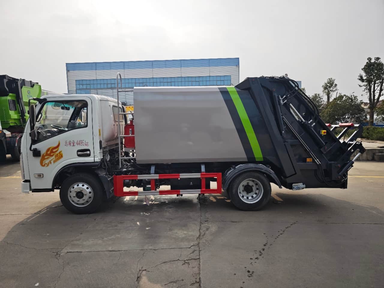 上装配置:箱体容积约6.5立方,新款弧形箱体,采用优质高强度Q345锰钢材料制作,后包采用高强度钢制作,单泵,整体阀;国标240升翻桶架,翻转底座两边采用轴承固定,CAN电控系统,驾驶室内控制面板带油门调节和故障预警功能,尾部带操作盒(副驾侧为手动电控按钮操作,正驾侧为急停开关和装卸载转换开关),带无线遥控器,带被压阀,其他按标准配置。