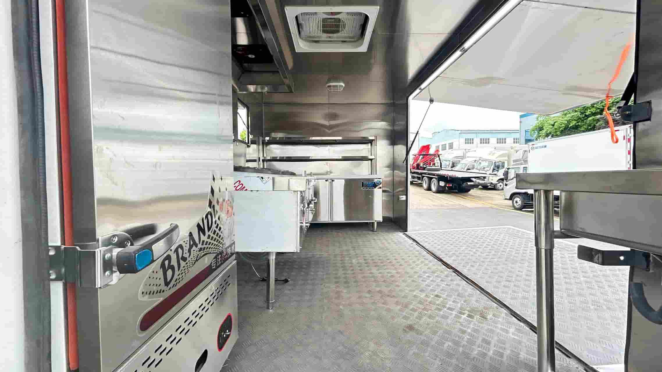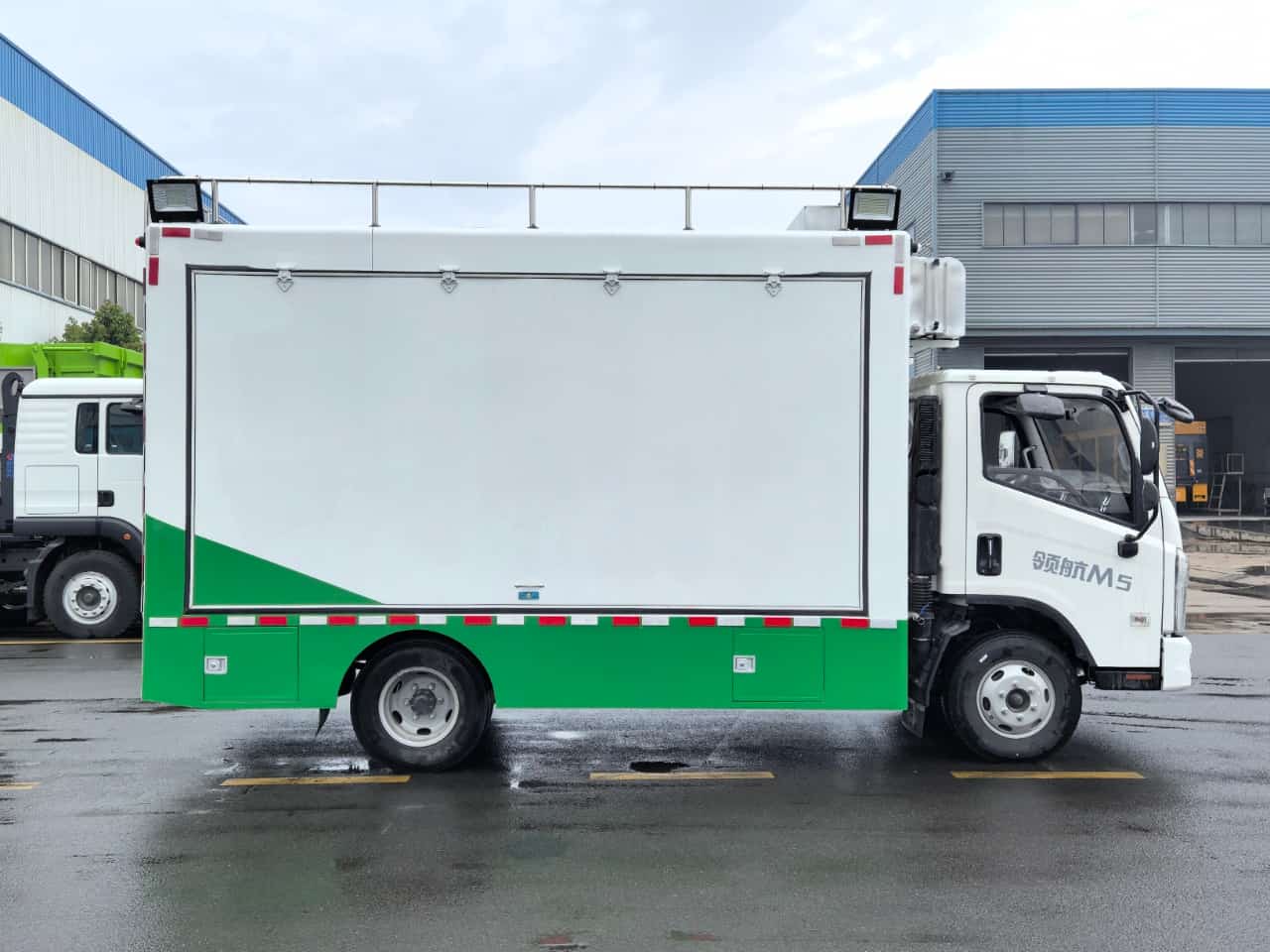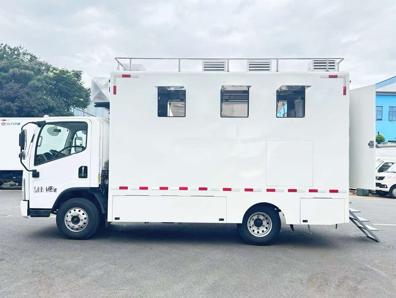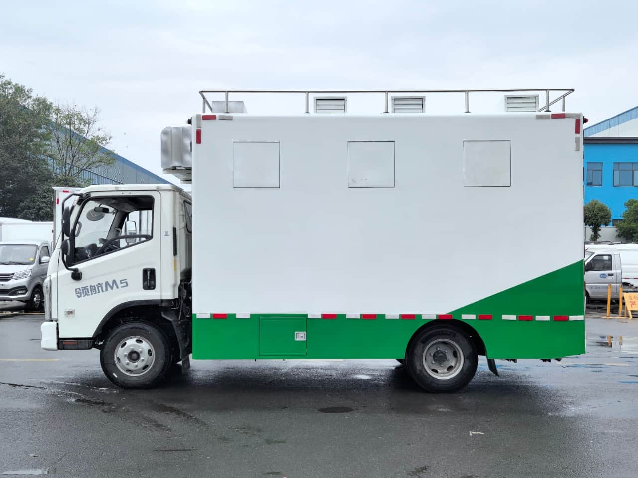 1,箱体材质:采用优质钢骨架,外蒙1.2mm冷轧钢板,内部不锈钢板,中间天窗高性能保温板。箱体圆弧边造型,带下包围结构,根据底盘布局,开设有检修舱门。厢内地板采用竹胶板打底,外饰铝花纹板,箱体防锈处理,外饰专用车漆。