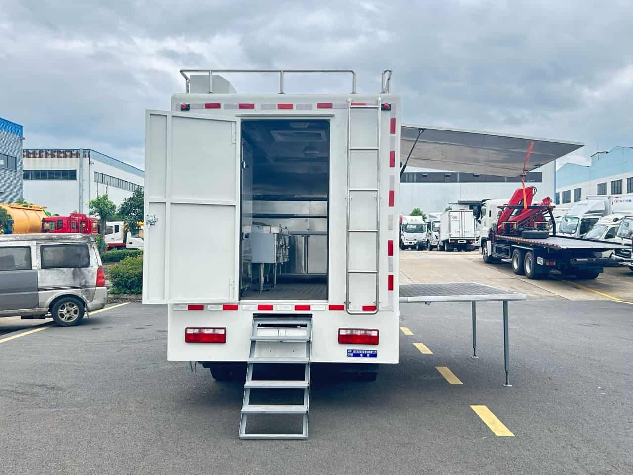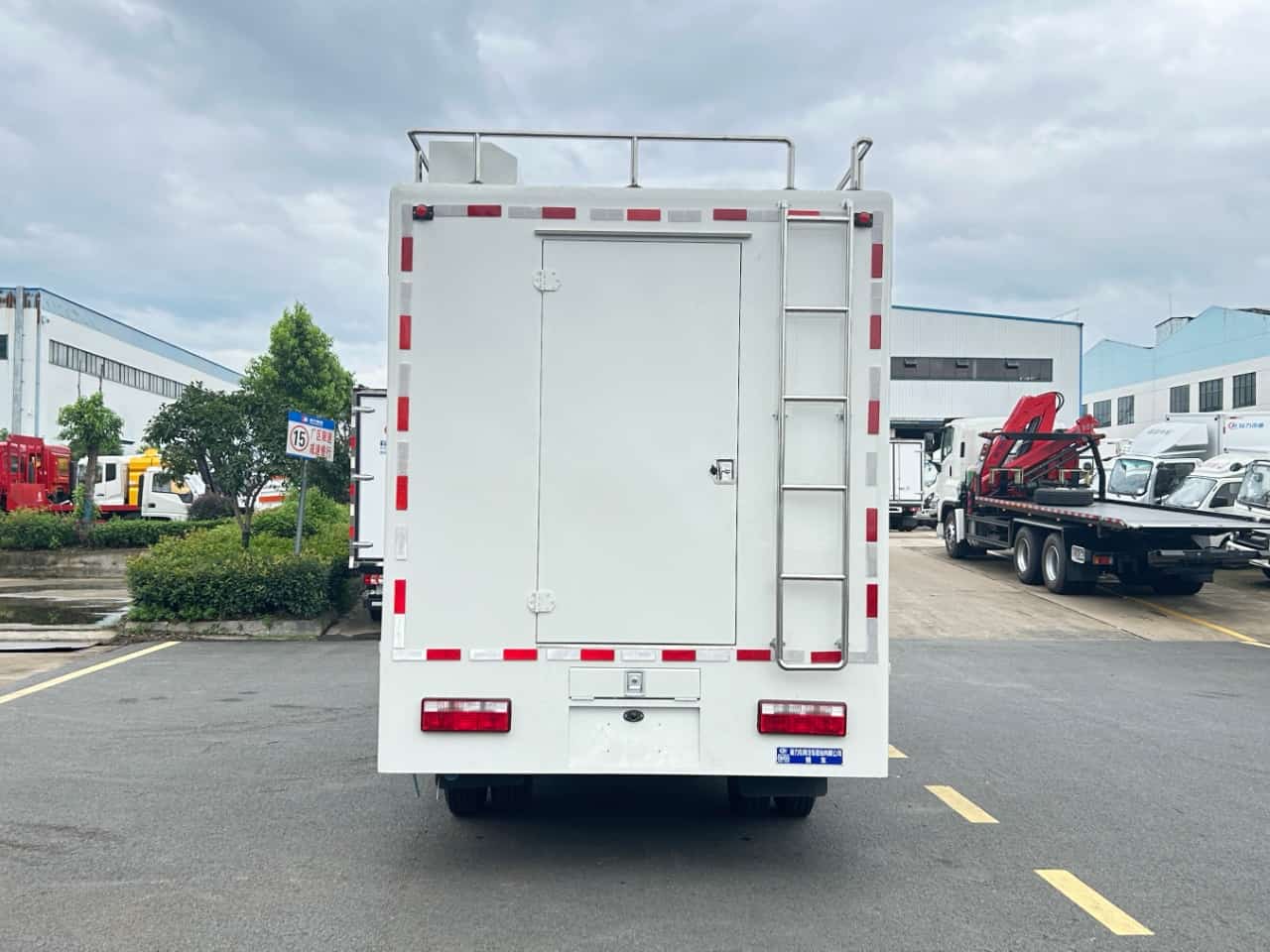 2,箱体结构:箱体一侧为封闭板,开设有透气窗,另一侧展板为手动开启上翻,内置手动翻转扩展平台,尾部为单开门,标配登顶爬梯1个,上车抽拉爬梯1个,顶部四周不锈钢防护护栏。