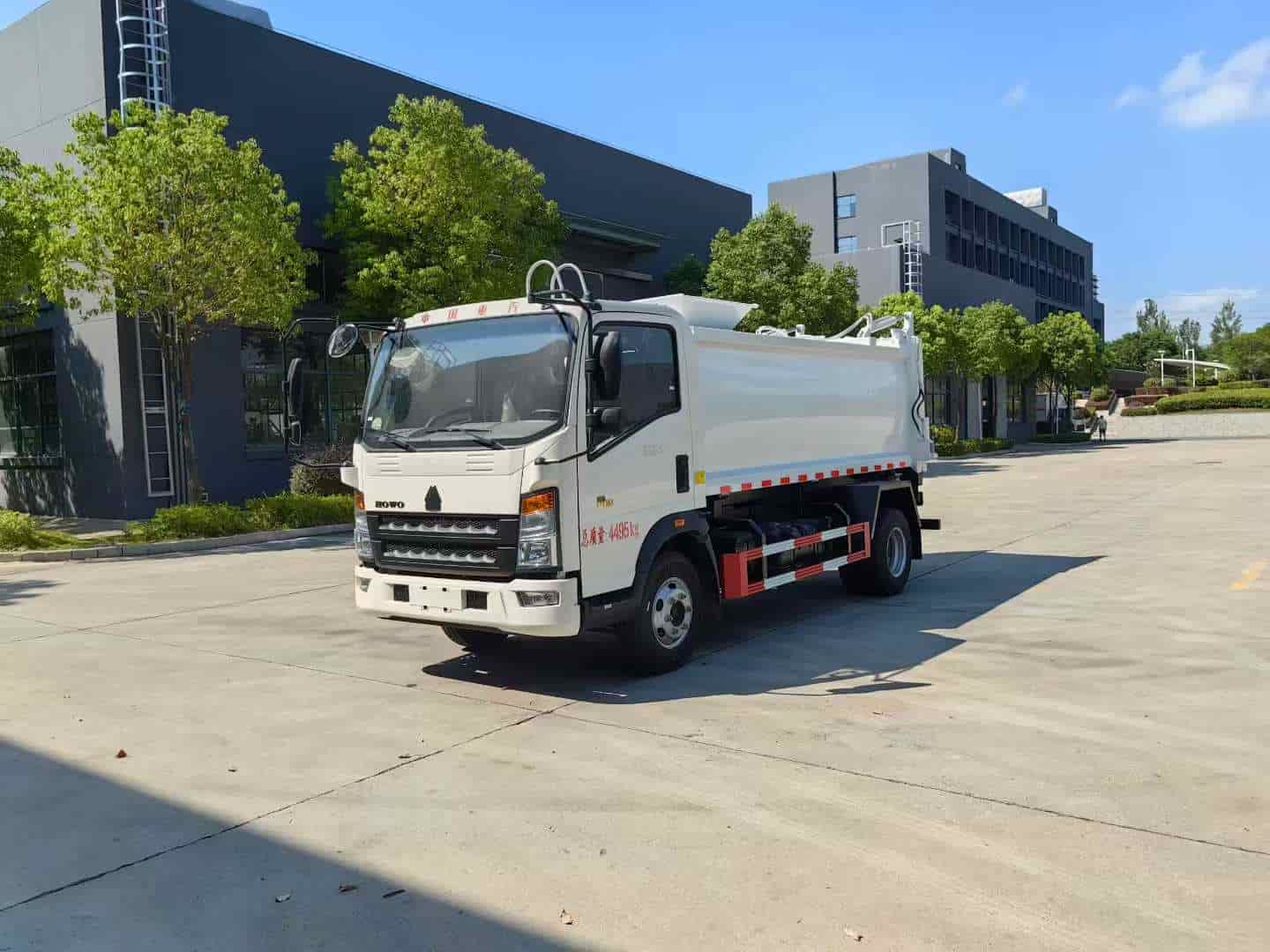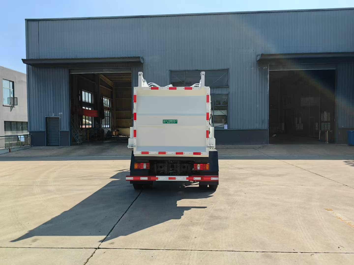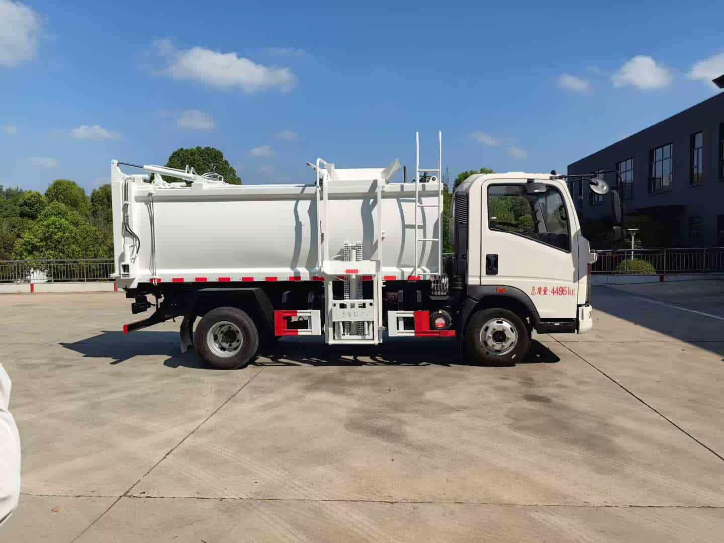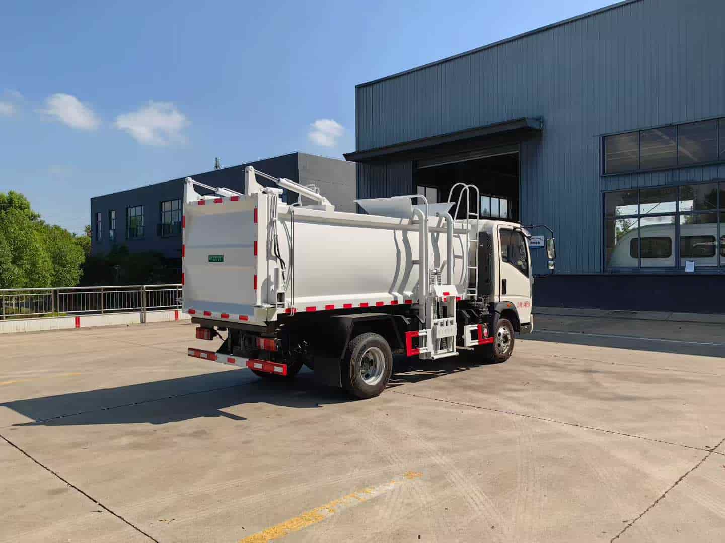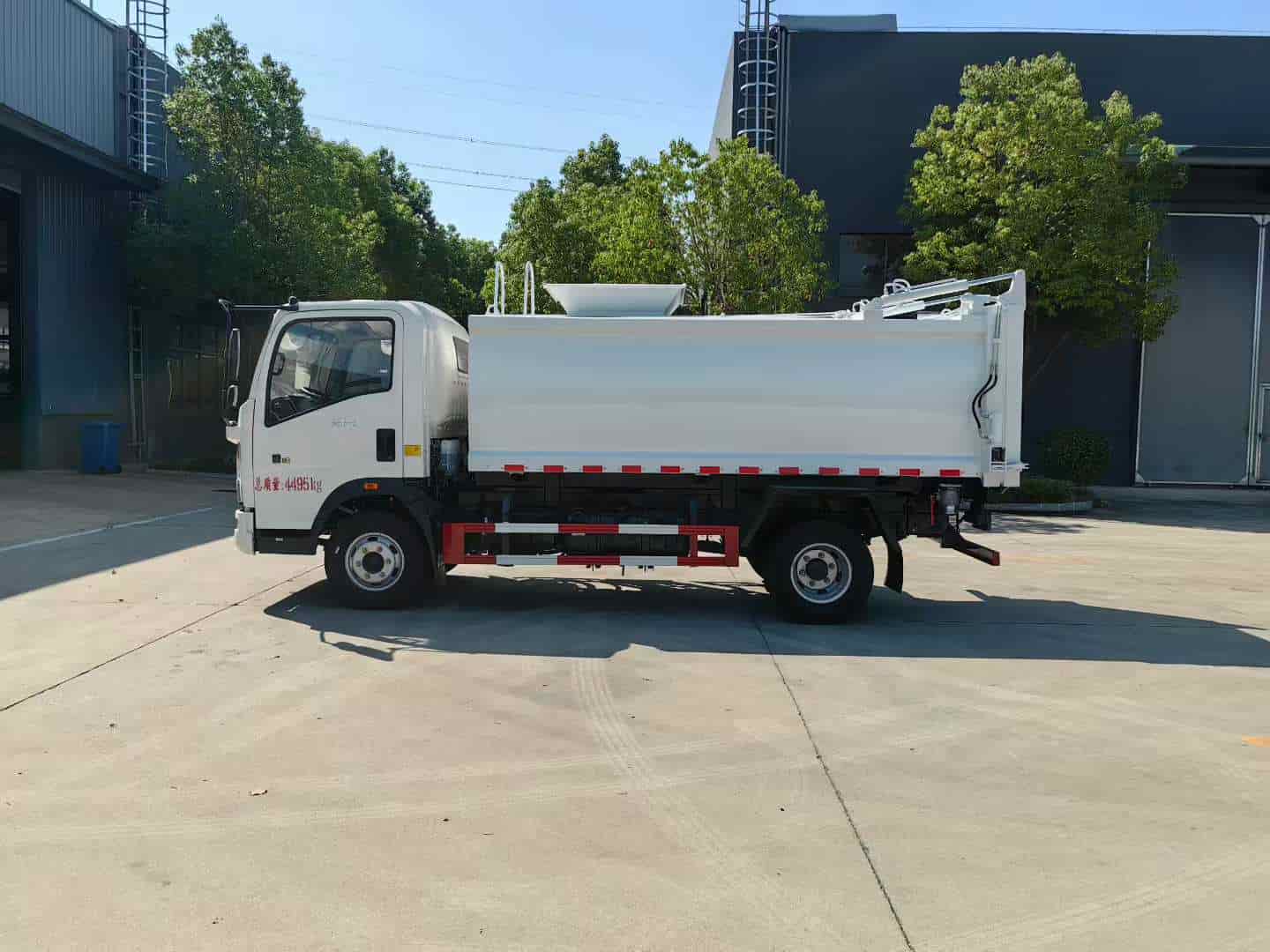 3280轴距,潍柴140,容积约6立方,罐体采用国标边三底四猛板制作,箱体举升卸料,罐体右侧配双链条挂捅提升机构,可挂载120L/240L国标垃圾桶,尾部锁紧加强,尾部配100排污阀。