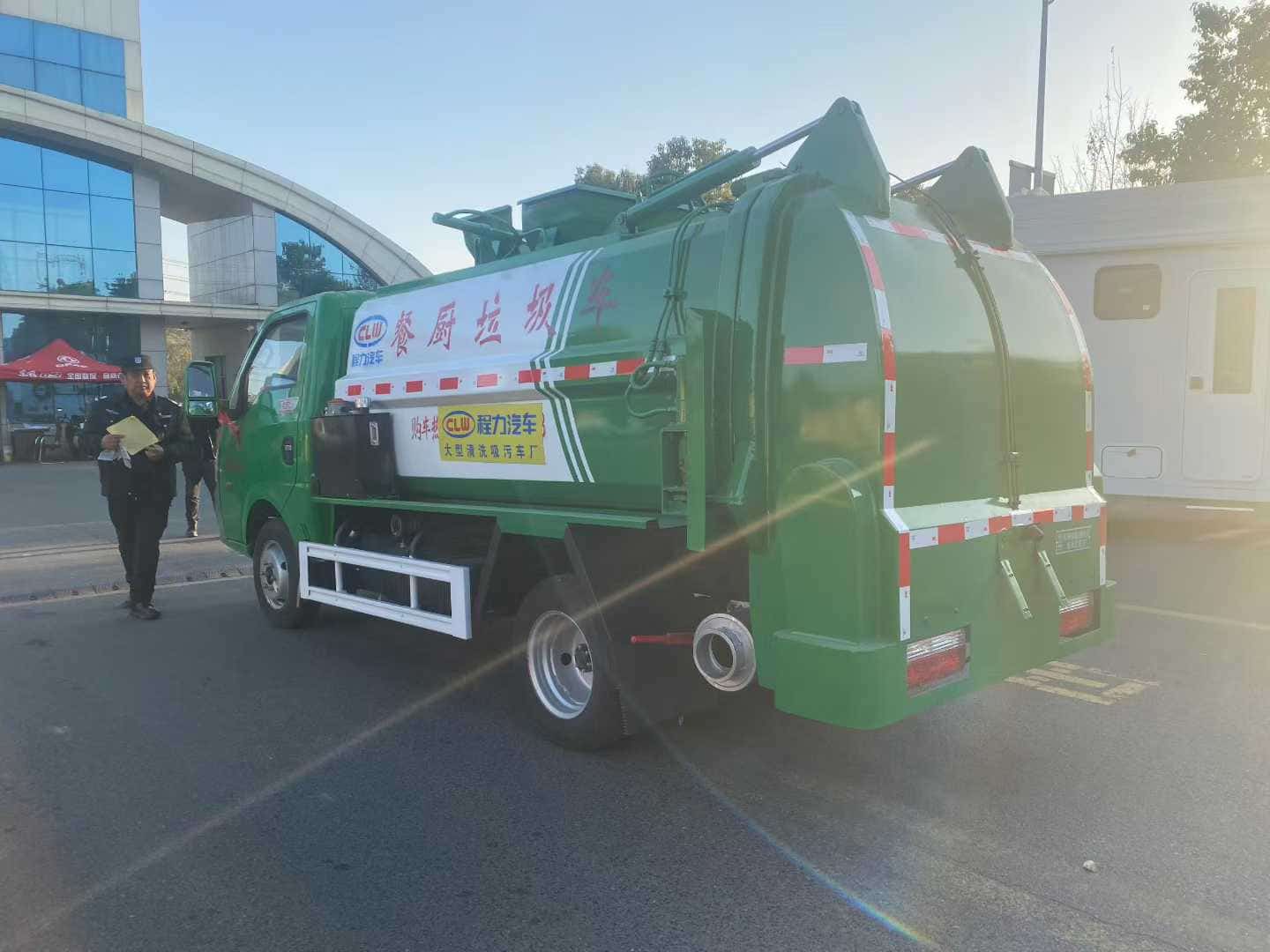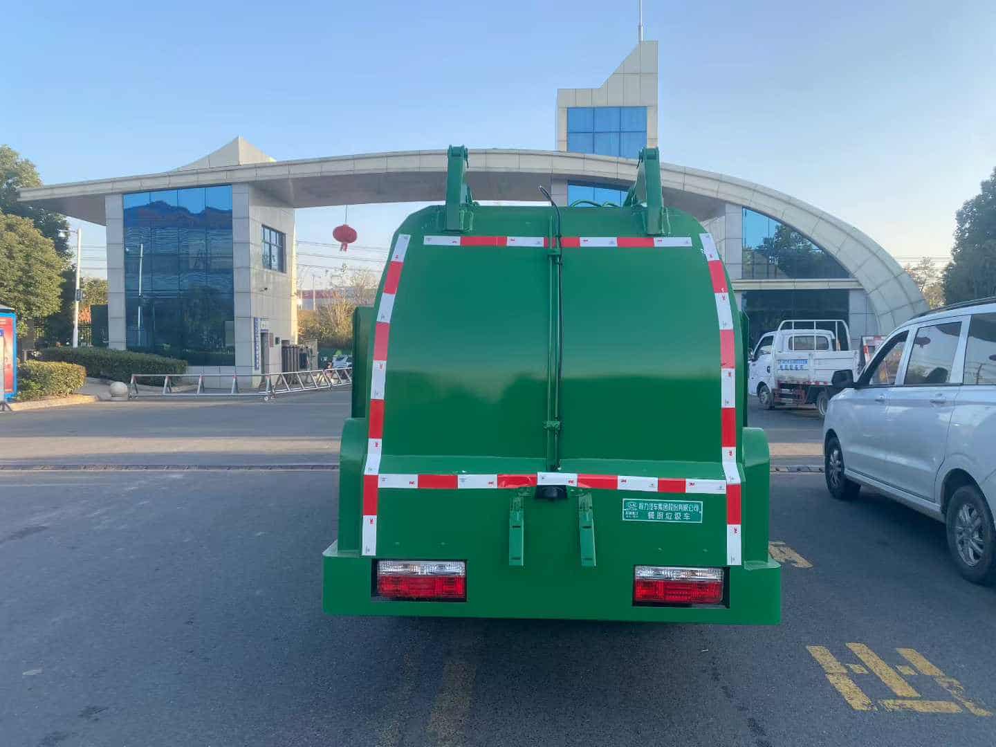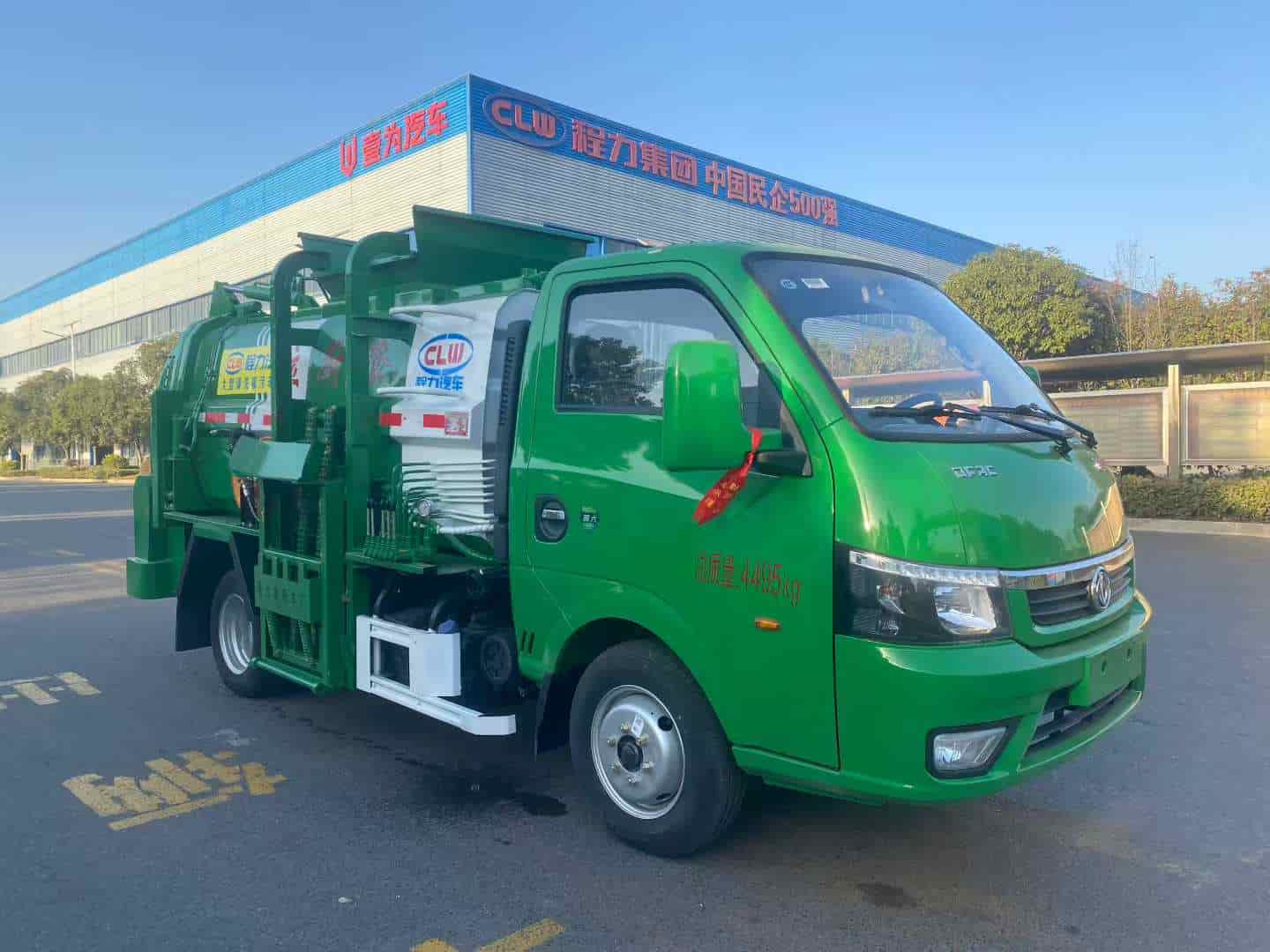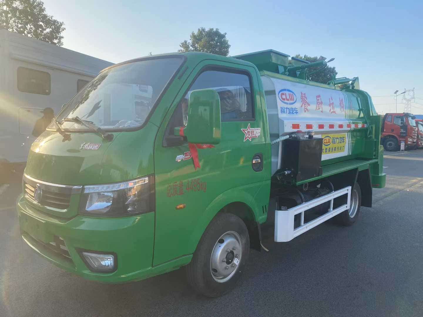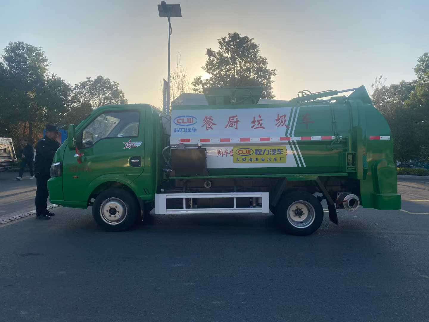 上装配置:(1)、弧形箱体,边三底四。(2)、长源/皖液油泵,中梅多路阀,知名液压油缸。(3)、全推铲卸料(不带举升功能),具有干湿分离功能。液压后盖,后盖配防腐硅胶密封条。(4)、后门液压锁紧。(5)、链条式提升机,可挂120/240L标准塑料垃圾桶。进料口盖液压开关。(6)、驾驶室内电控(提升机外部手动控制),后门锁紧与后盖开关的操作具有防误操作。(7)、箱体带清洗装置(液压马达带动高压泵、带水箱) 。整车颜色:白绿色