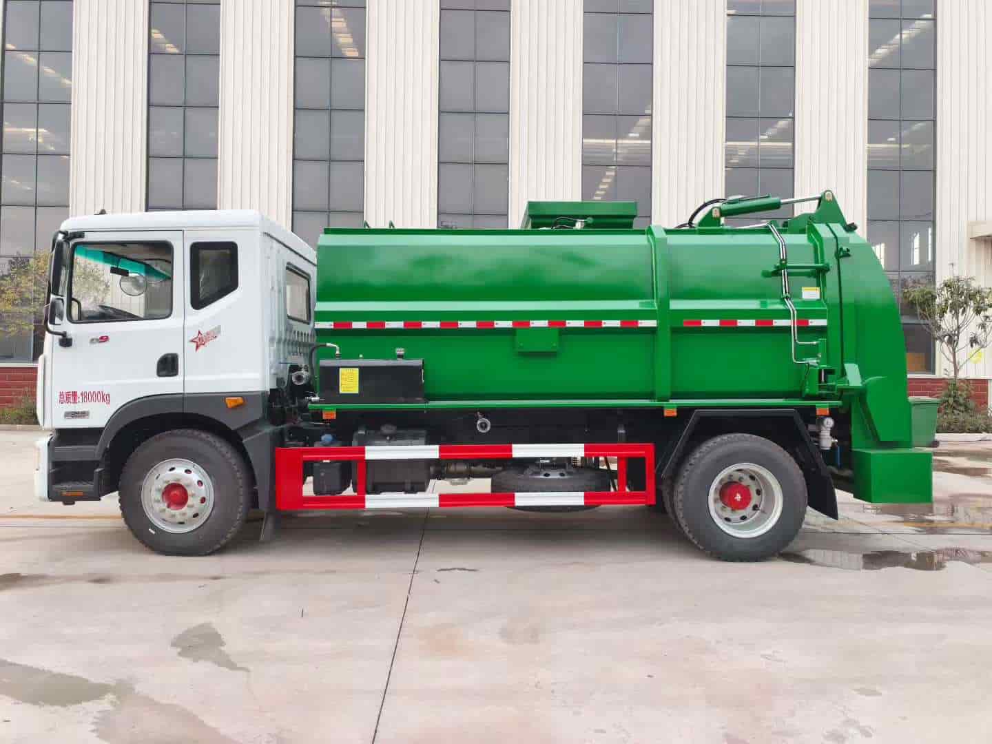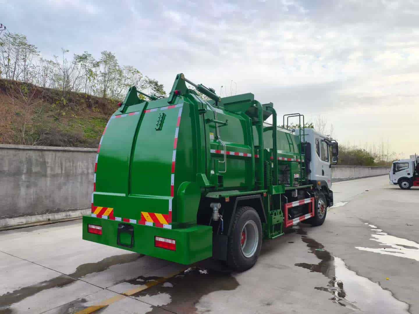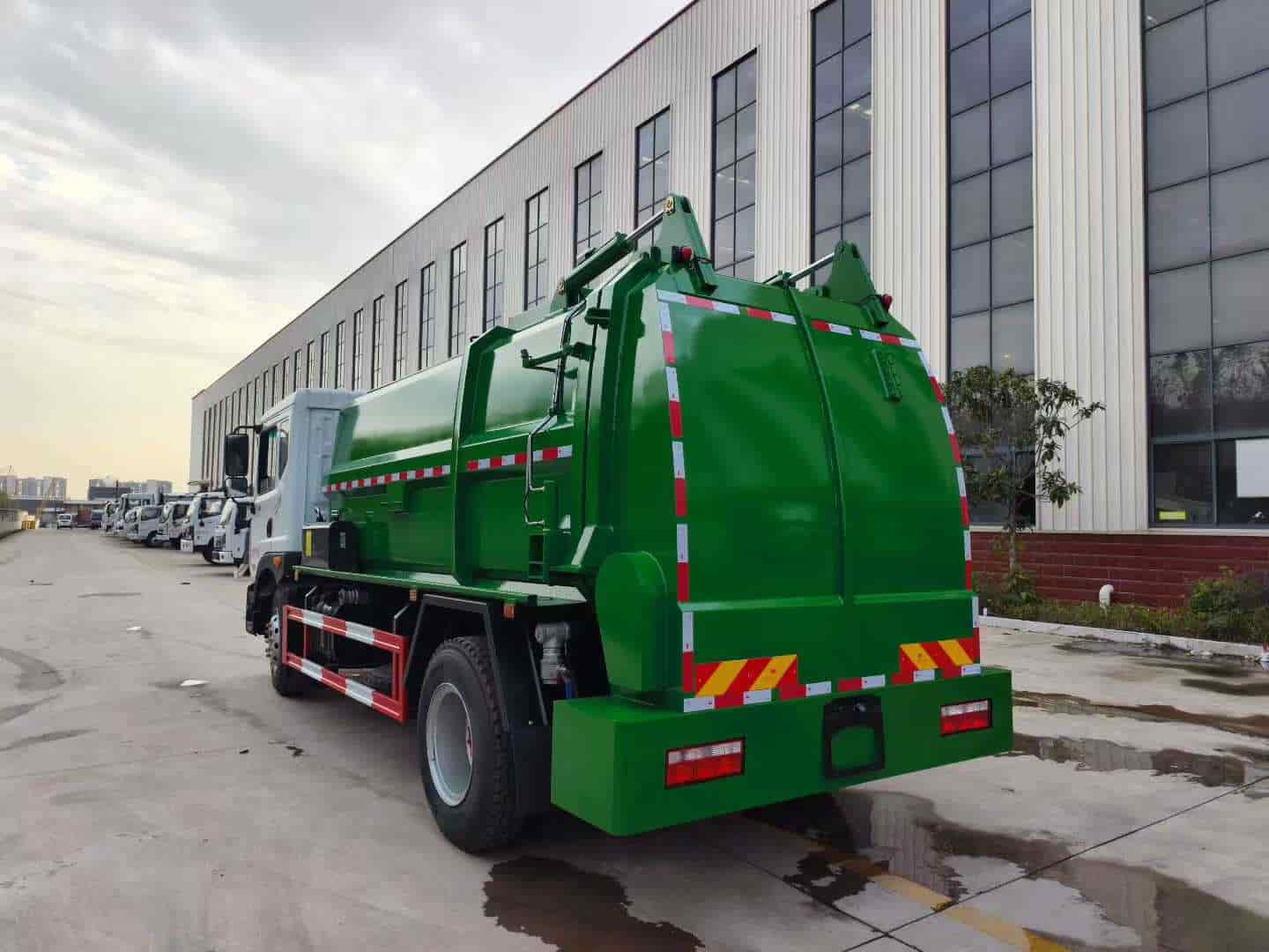 液压后盖;带密封条;后门液压锁紧;进料口盖液压开启关闭,后门锁紧与后盖开关的操作具有防误操作功能;
