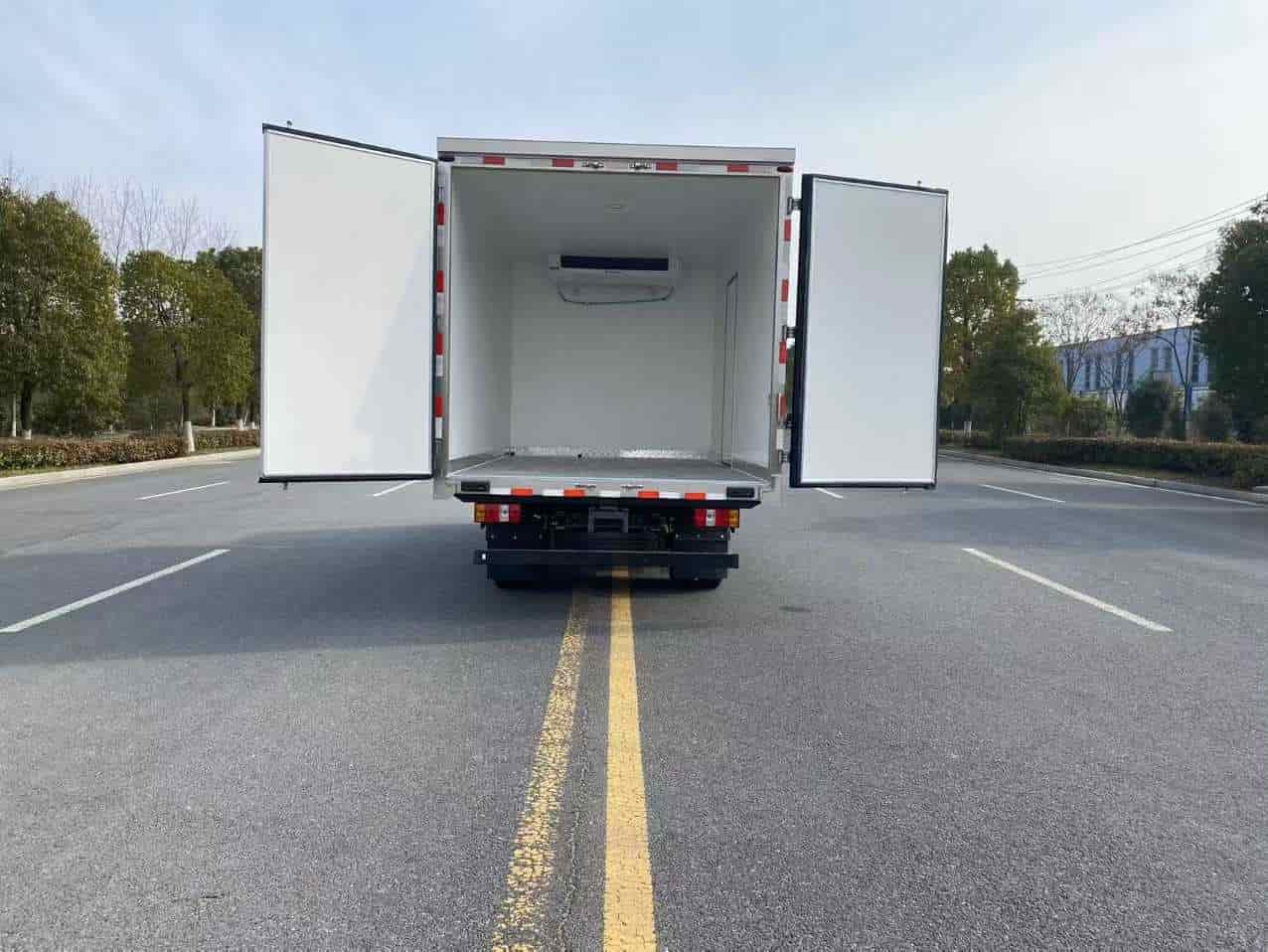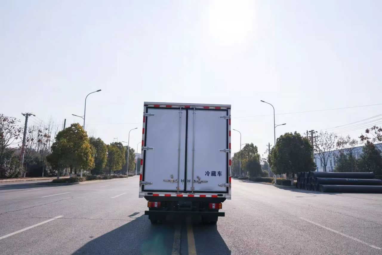 厢体采用内外优质玻璃钢板,中间8CM高密度XPS保温层,厢体骨架采用钢木框架,新工艺断桥隔热保温结构,可选装内不锈钢厢体,门锁及铰链为不锈钢成型件,后双开门,5层迷宫式橡胶密封条,门框断桥隔热处理,高强塑钢花纹防滑底板,底板围裙选用15cm宽铝合金底侧一体式型材,右单侧门,厢内顶部安装照明灯,其他标配。厢体副车架采用特钢折弯贯穿横梁加固,标准件螺栓锁紧。选装肉钩架厢体。