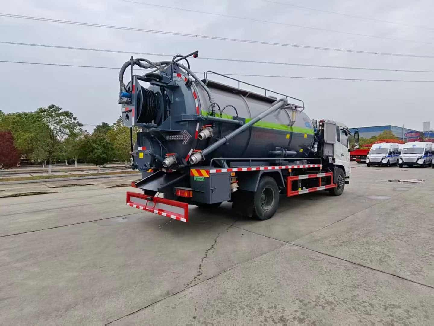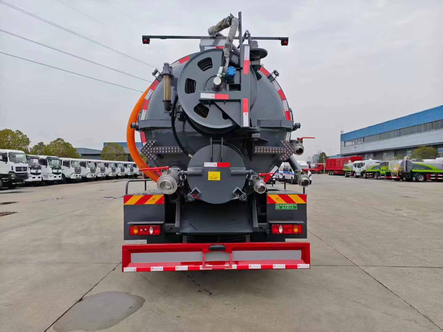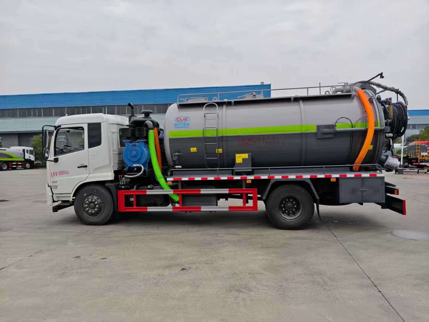 上装配置:罐体容积约15方,8m碳钢板材,清水约4方,清水箱两侧一边一个消防栓进水口,清水罐底部一个65排水阀,安装视粪管,罐顶一个排气阀,其余为吸污,罐顶两个罐口(带爬梯),两仓球阀互通,罐顶一个互通。两仓中间用封头8mm,品孚350流量高压,清洗泵60米25高压管,卷盘装后封头180度旋转,卷盘带液压旋转。375马力配30大功率水循环泵,吸污管道带排气阀。后封头上安装一个600水泥盖放污可液压开启,一个150球阀圆,两个100球阀,后封头一个,罐体尾部箭头灯,带一个视污窗口,后封头一个视粪管,一个工具箱两层,带一根8米吸污管。其余厂内标配。