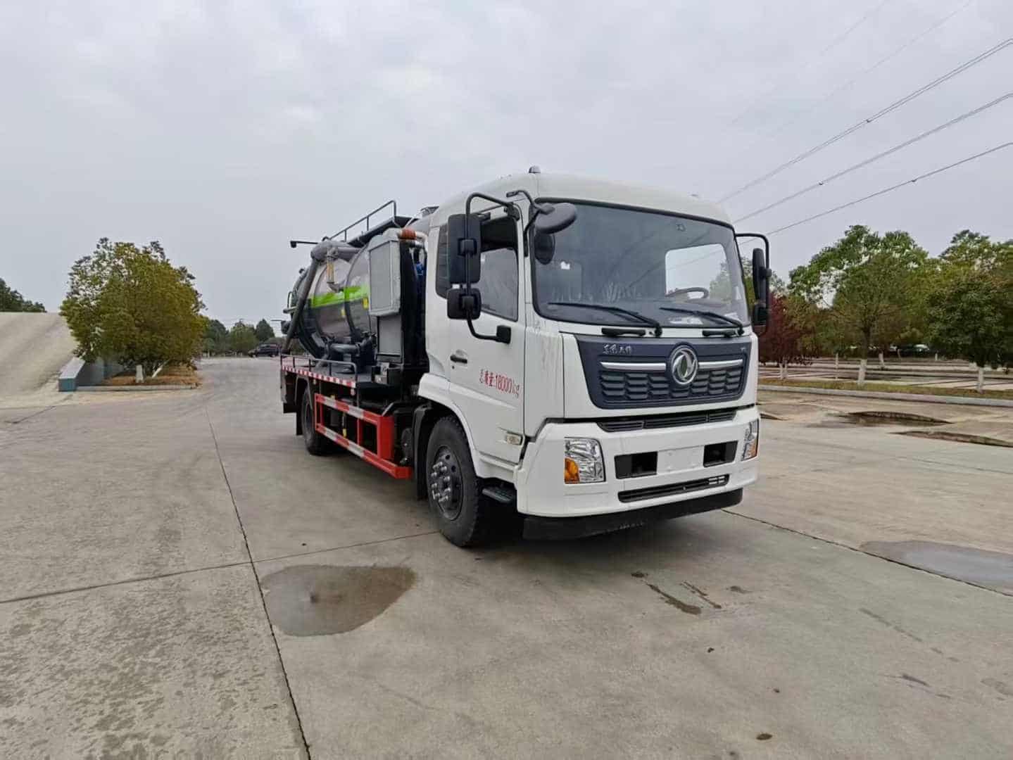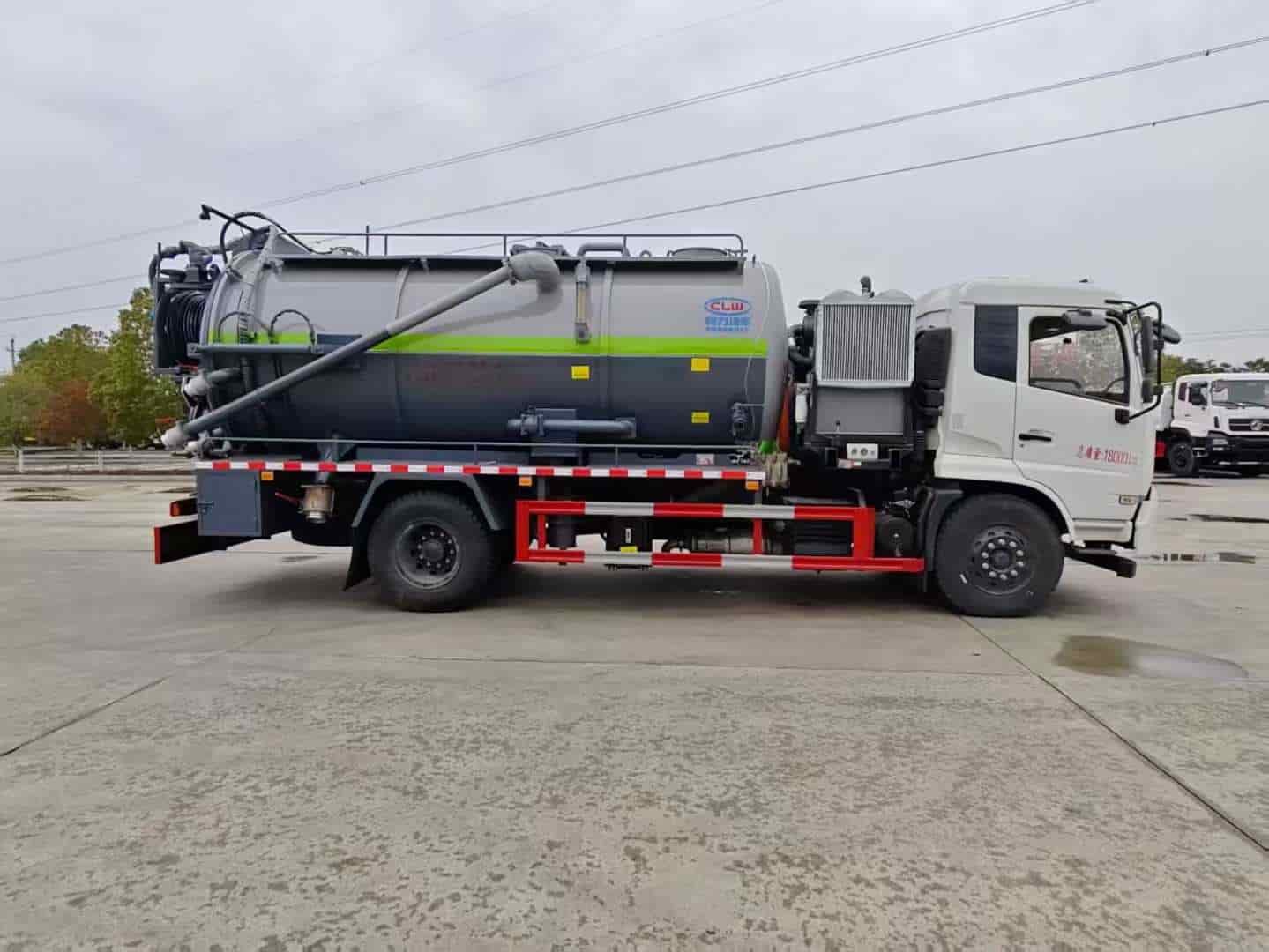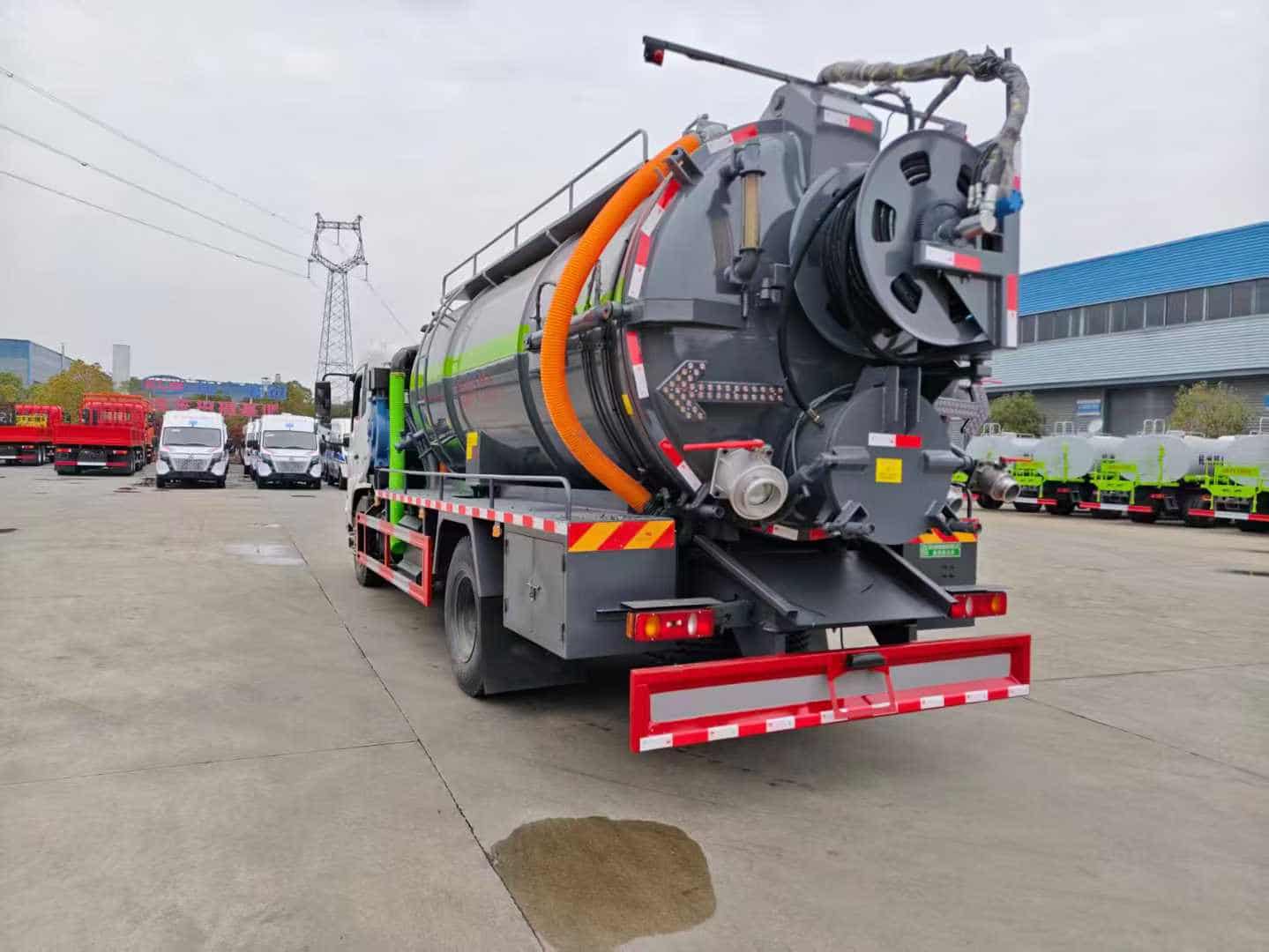 上装配置:罐体容积约15方,8m碳钢板材,清水约4方,清水箱两侧一边一个消防栓进水口,清水罐底部一个65排水阀,安装视粪管,罐顶一个排气阀,其余为吸污,罐顶两个罐口(带爬梯),两仓球阀互通,罐顶一个互通。两仓中间用封头8mm,品孚350流量高压,清洗泵60米25高压管,卷盘装后封头180度旋转,卷盘带液压旋转。375马力配30大功率水循环泵,吸污管道带排气阀。后封头上安装一个600水泥盖放污可液压开启,一个150球阀圆,两个100球阀,后封头一个,罐体尾部箭头灯,带一个视污窗口,后封头一个视粪管,一个工具箱两层,带一根8米吸污管。其余厂内标配。