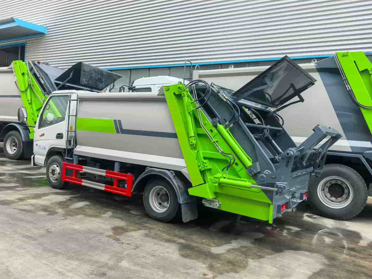 上装配置:弧形箱体,容积5.5方(不限高,高度2400),箱体采用Q345锰板,边3mm底3mm,填充器采用Q710高强钢,弧形底板5mm,滑轨8mm,福建山友定制油缸,中梅多路阀,皖液油泵,填装器举升油缸带双向平衡阀,采用湖南长沙CAN总线电控系统,德国伊顿操作面板,日本川户无线遥控器(采用光电开关,带一键操作、手动操作和无线遥控三种控制方式),操作盒共两只(驾驶室内部及后尾部右侧可操作,填充器左侧安装一个急停开关),后填装器标准下部一只污水箱,带防尘盖,其余按公司标准配置制作。