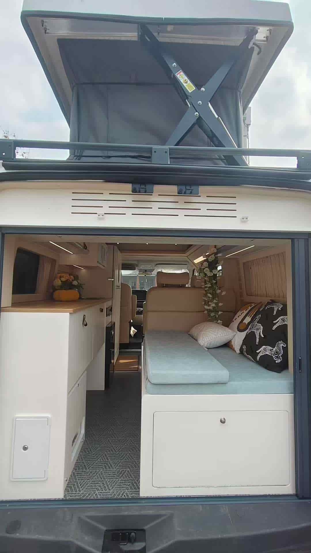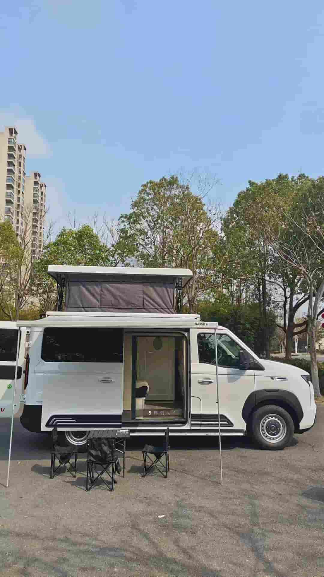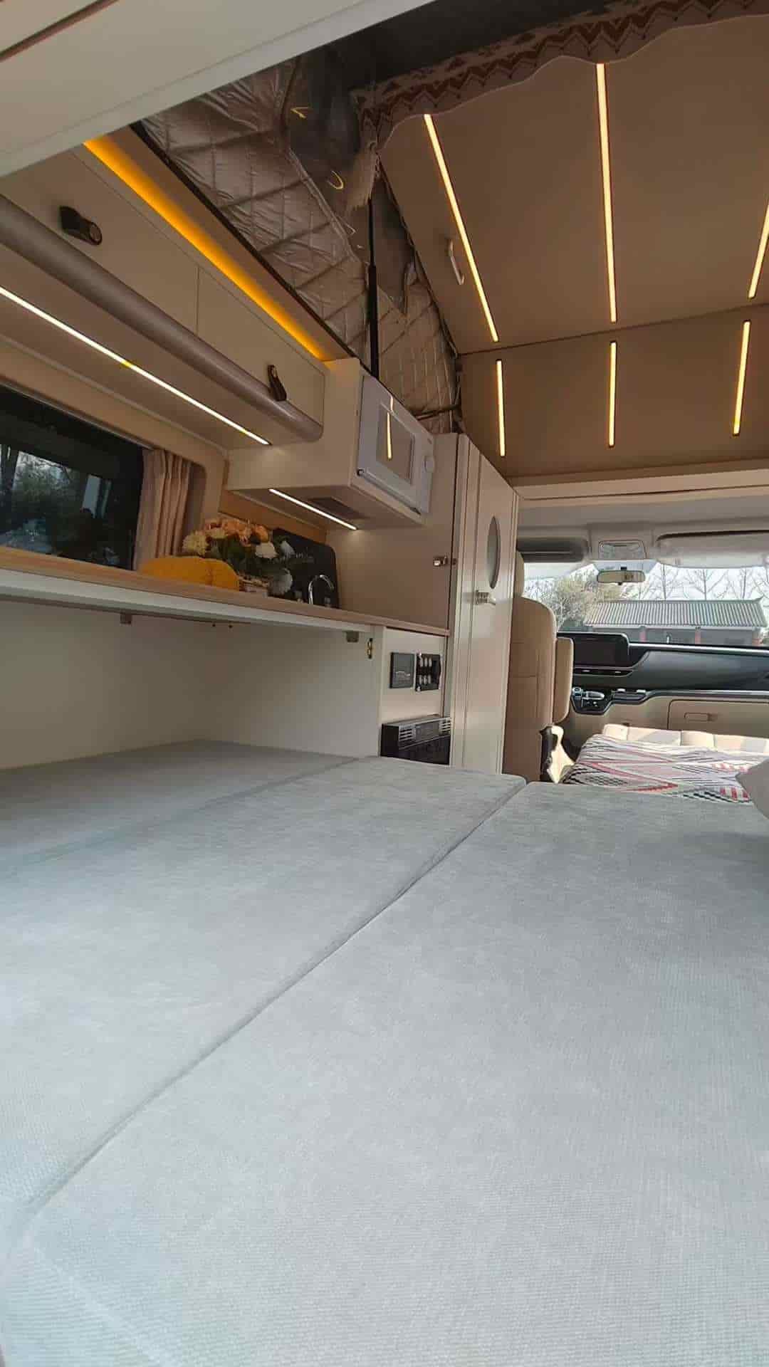 五座带升顶,有独立卫生间,拼床加升顶床,适合2人旅行的小房车