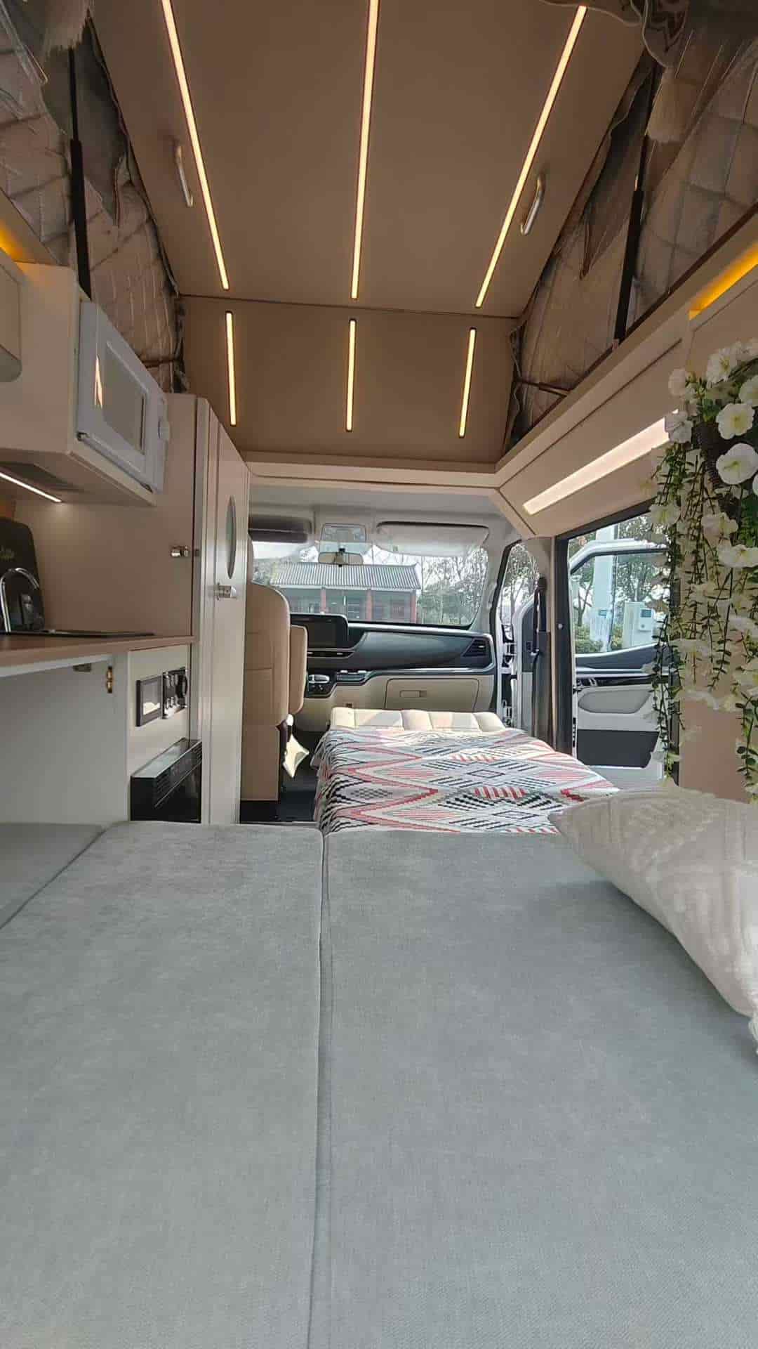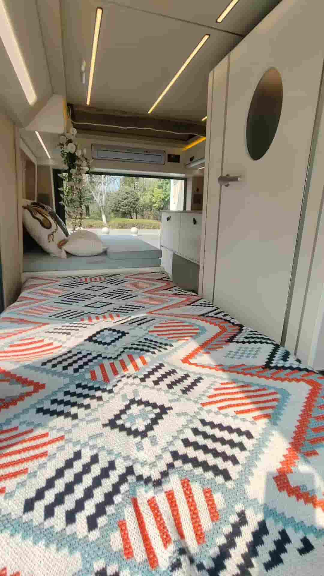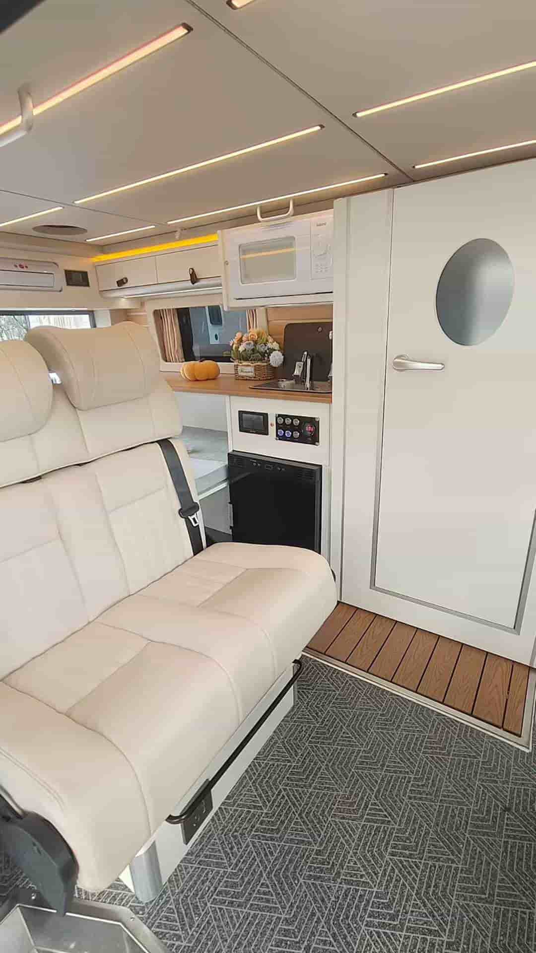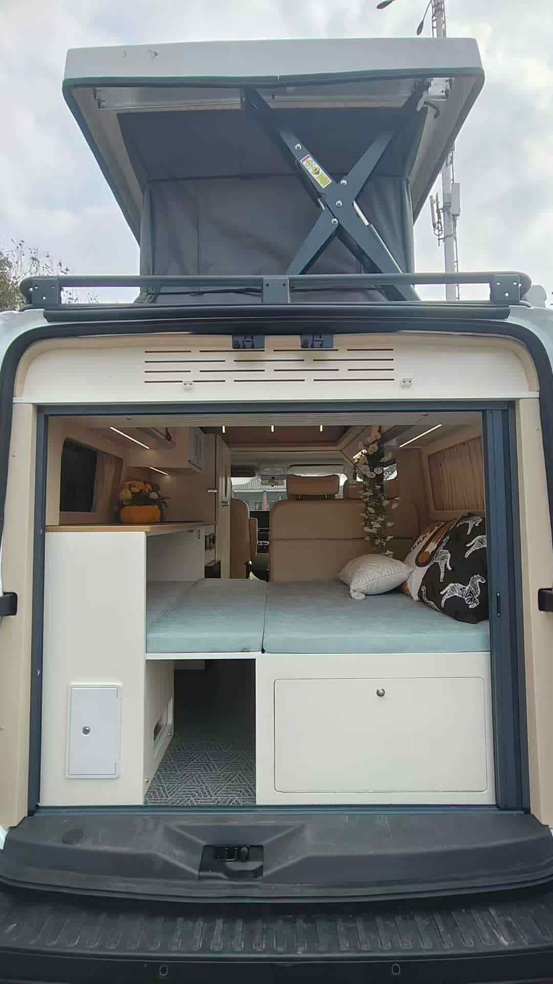 五座带升顶,有独立卫生间,拼床加升顶床,适合2人旅行的小房车