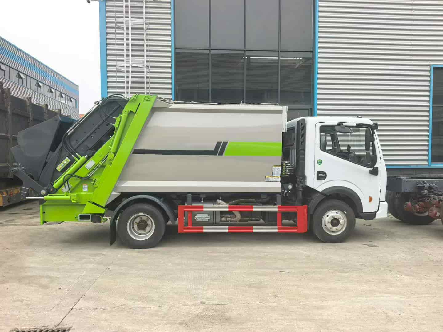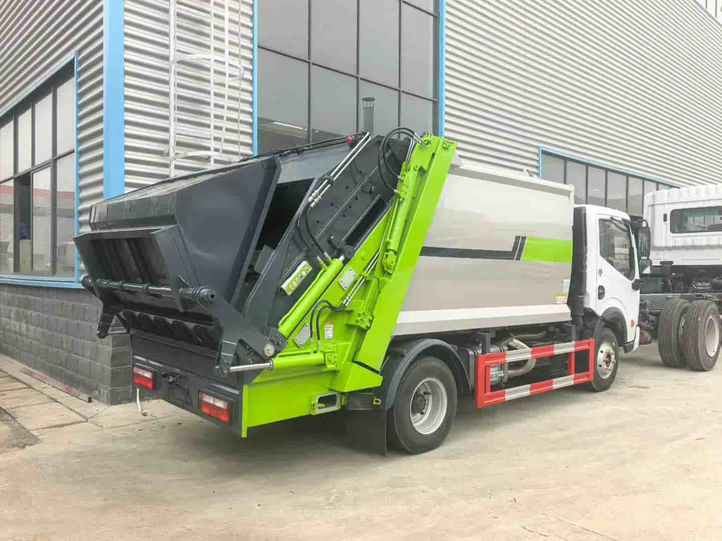 手动操作和无线遥控三种控制方式),操作盒共两只(驾驶室内部及后尾部右侧可操作,填充器左侧安装一个急停开关),后填装器标准下部一只污水箱,尾部三角斗翻转机构 ,加装侧污水箱,