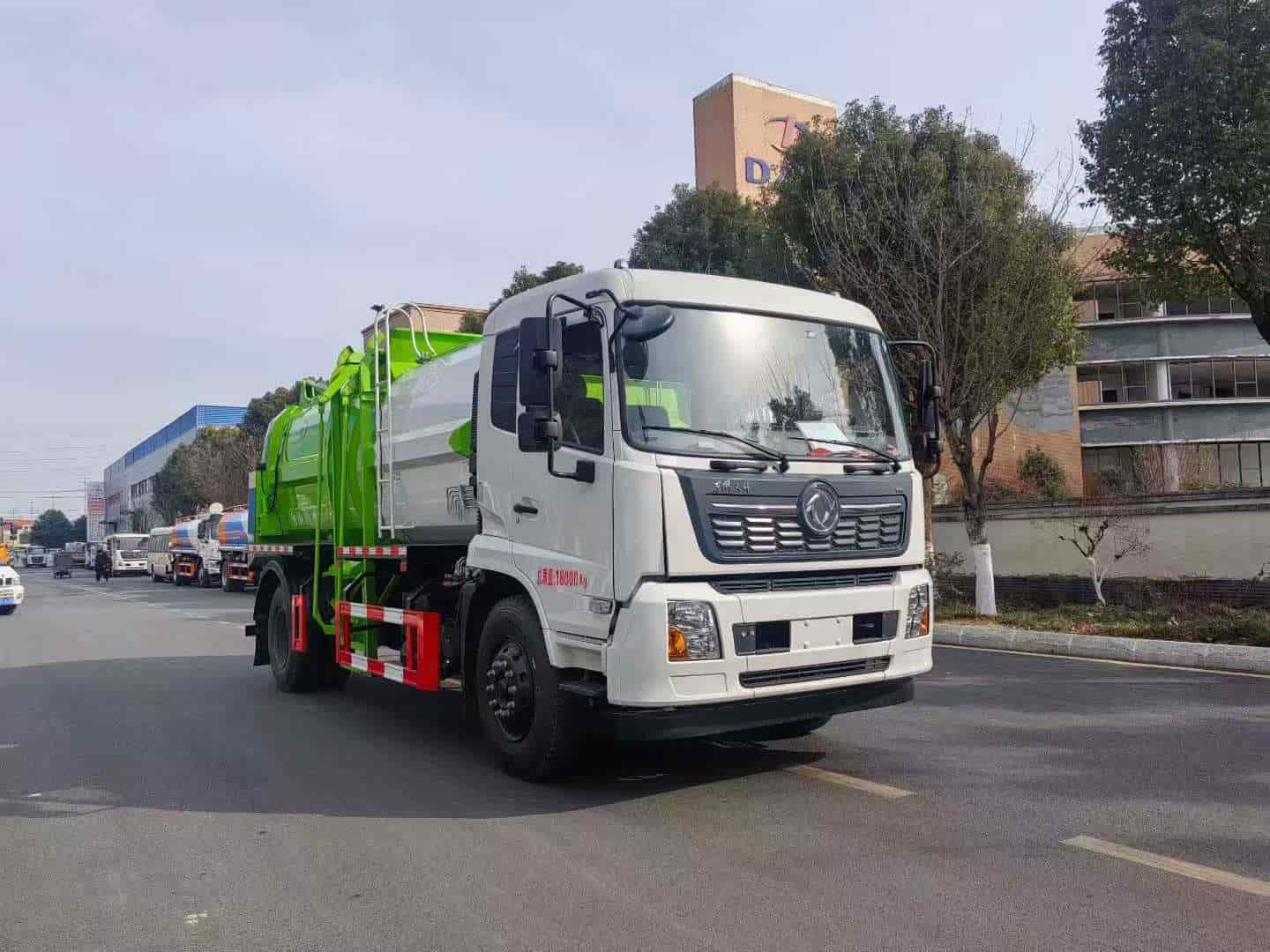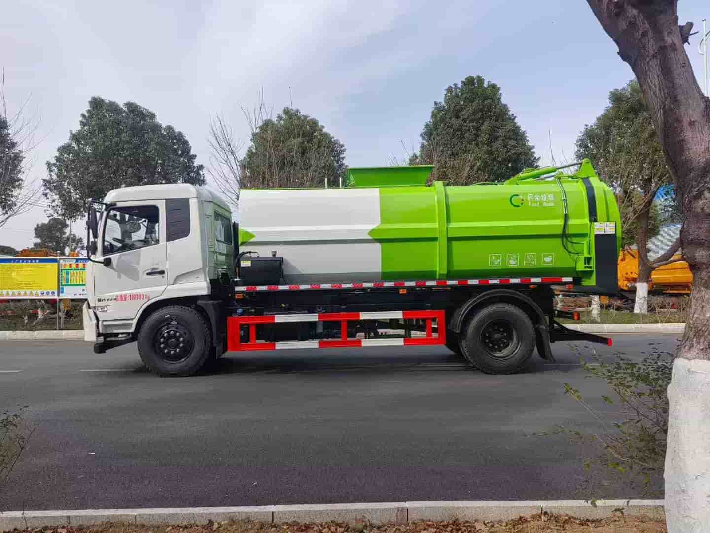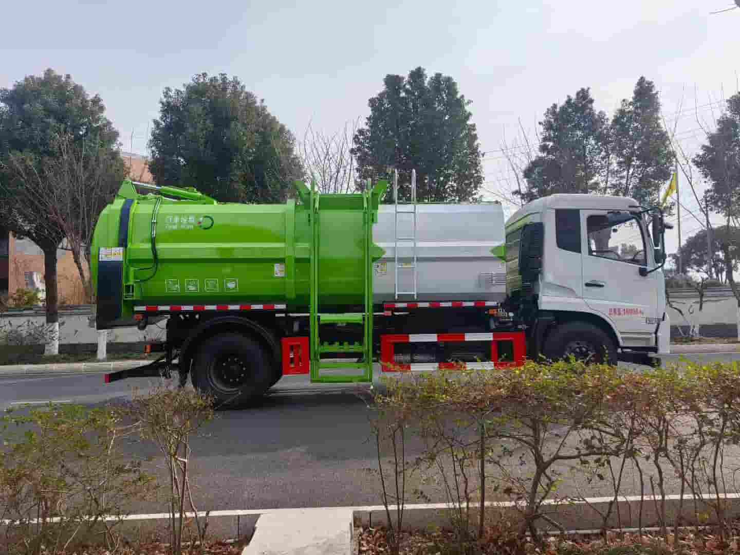 东风天锦14方餐厨垃圾车,康机230/260马力可选,轴距4700,6缸机,拉杆提升机,举升自卸,后门液压开关,液压锁紧。