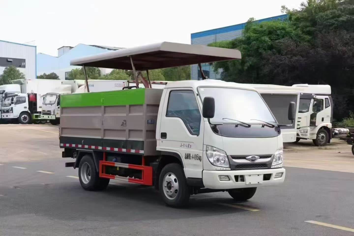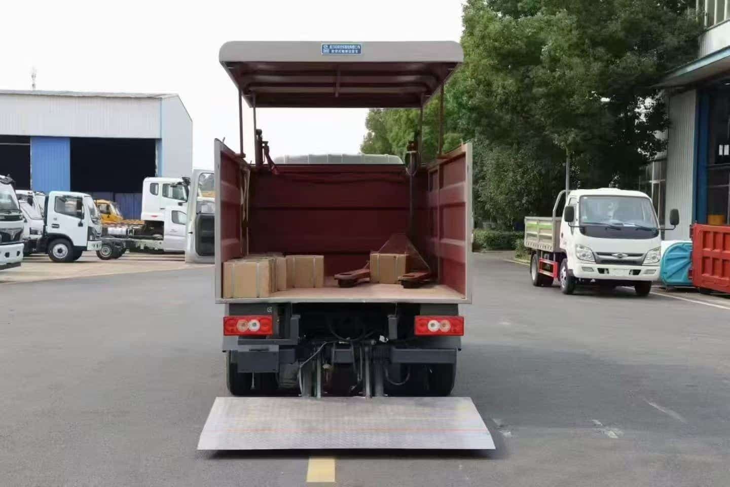 上装配置:货箱采用优质碳钢板制作,密闭式箱体,带侧开门,顶盖液压液压开启,可装载240L垃圾桶15桶,尾板采用知名品牌凯卓立液压式升降装置(全国联保),一次能装卸多个垃圾桶,设有固定式和有线式两种电控操作方式,尾板设置独立电源开关!