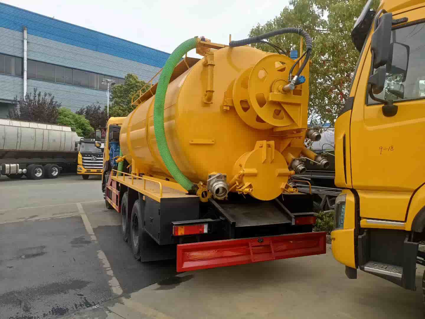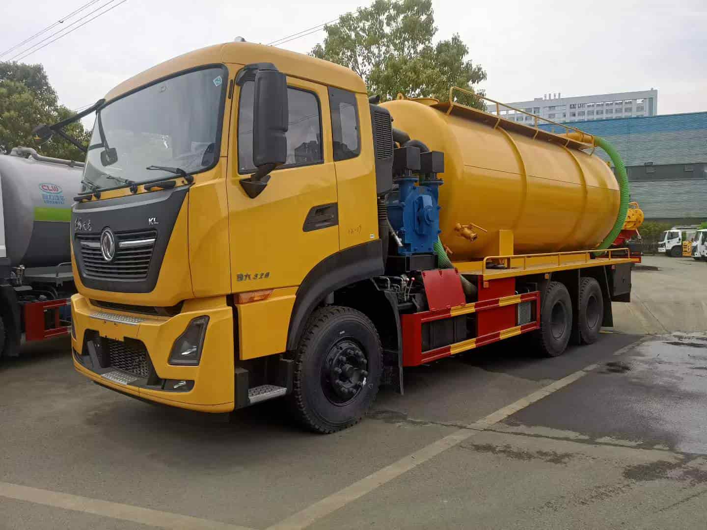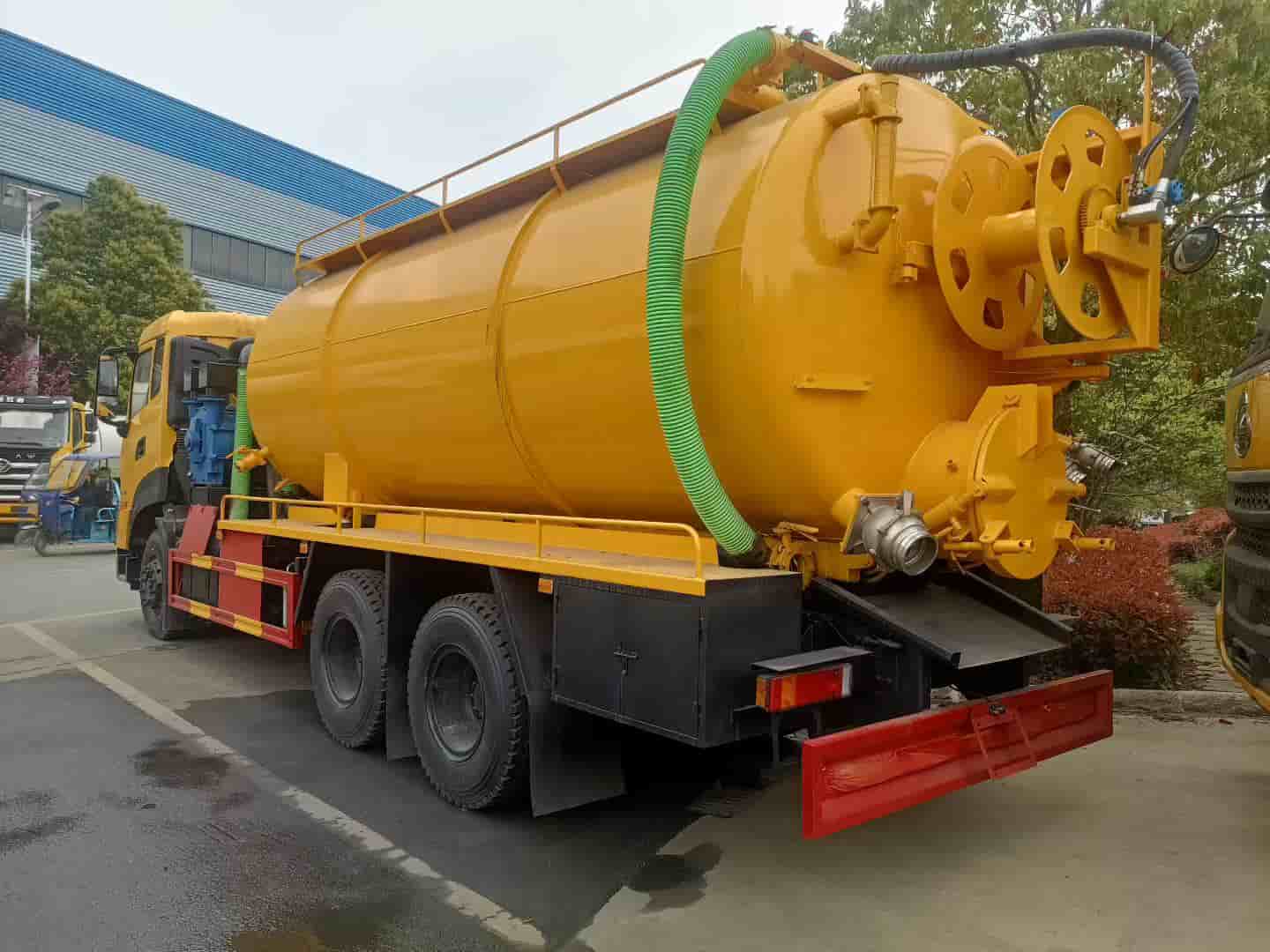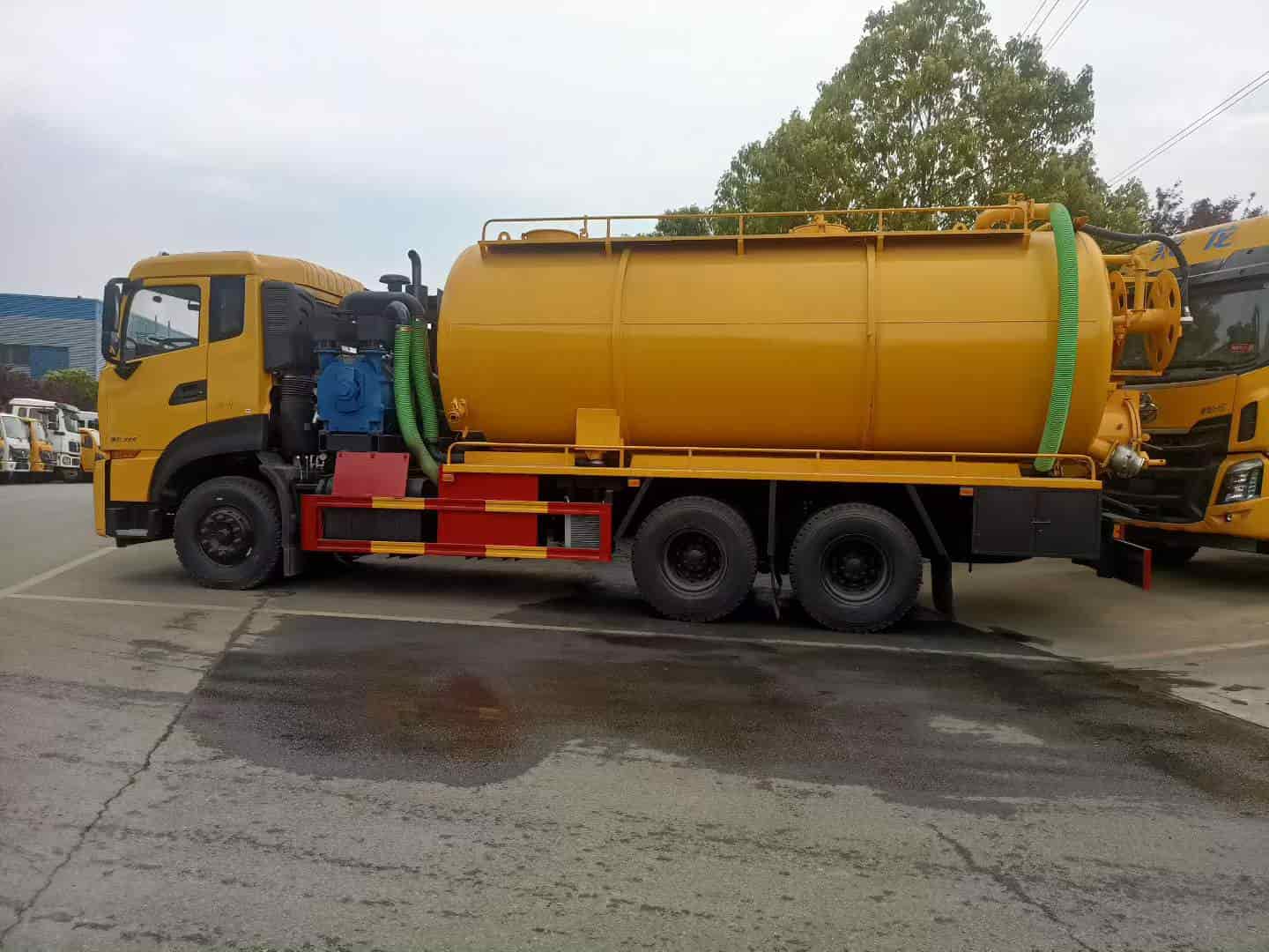 上装配置:罐体容积约22方,8m碳钢板材,清水约5方,其余为吸污,两仓球阀互通。两仓中间用封头,品浮350流量高压清洗泵,配100米高压管。258水环泵配420马力副发。卷盘装后封头180度旋转,后封头液压打开。后封头上一个800水泥盖放污,可液压开启,侧面一个150偷排球阀,后封头一个150出口球阀,一个100球阀,罐内铺不锈钢板,整车重载版设计,罐体尾部箭头灯,带一个视污窗口,带8米吸污管,其余厂内标配。