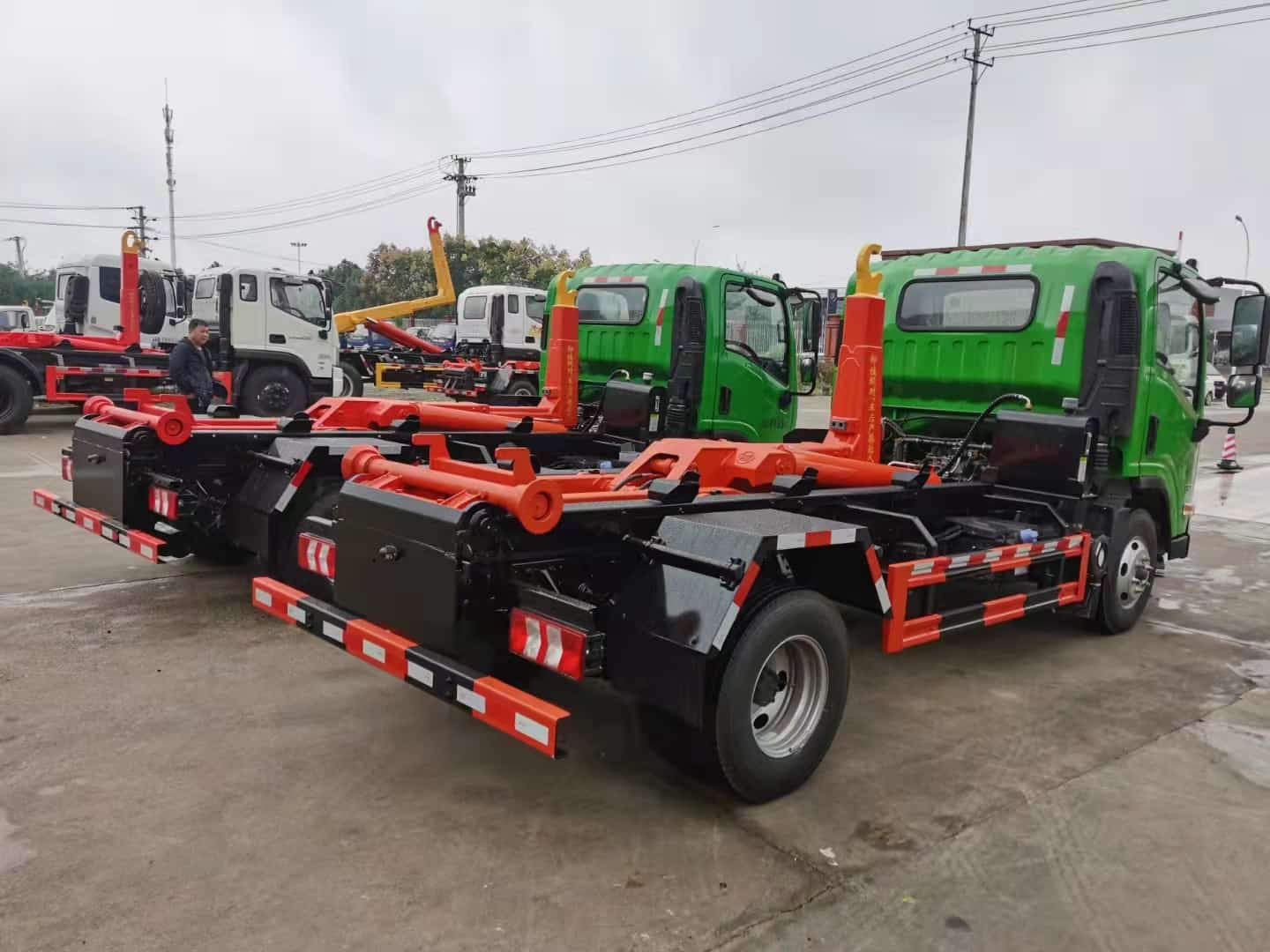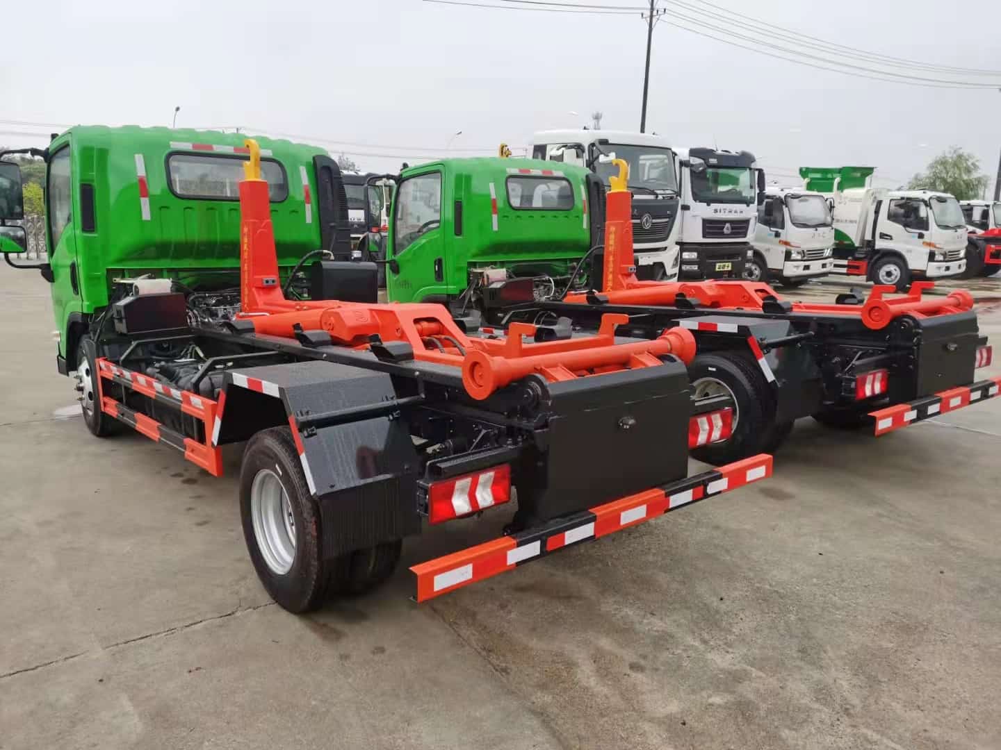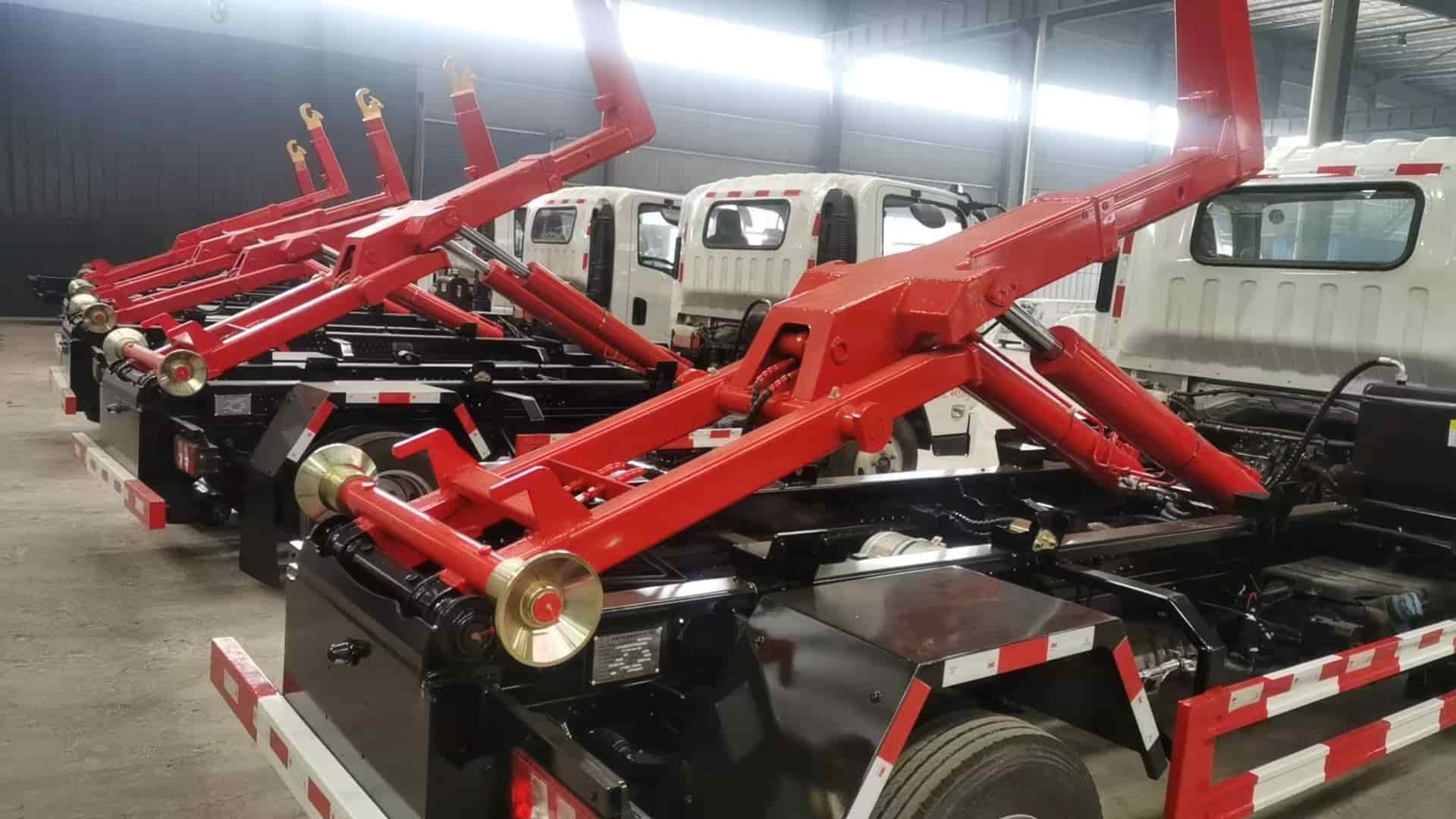 基本机构: 1. 拉臂机构 : 由底架 、翻转架 、拉臂钩和锁紧机构组成 ,可完成对密封 式垃圾车厢的钩装、钩卸和卸料作业。2.液压系统 该系统由液压齿轮泵 、多路阀 、油缸等组成 。通过该 系 统为 拉臂 机构 提 供液 压 动力 。3. 控制系统通过多路阀手柄,控制相应的液压执行元件工作 ,实现垃圾车作业时所需动作要求。4 垃圾厢为该车配备的垃 圾箱为密闭式结构 ,车厢配有后门 ,打开后门,举升厢可用来卸垃圾。车厢后门配有优质密封条,能有效防止脏水外泄 ,消除二次污染,可选装液压锁紧后门 。