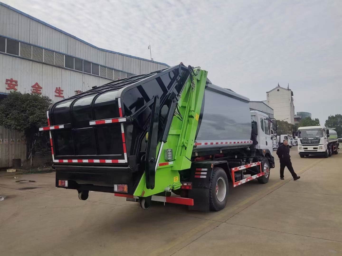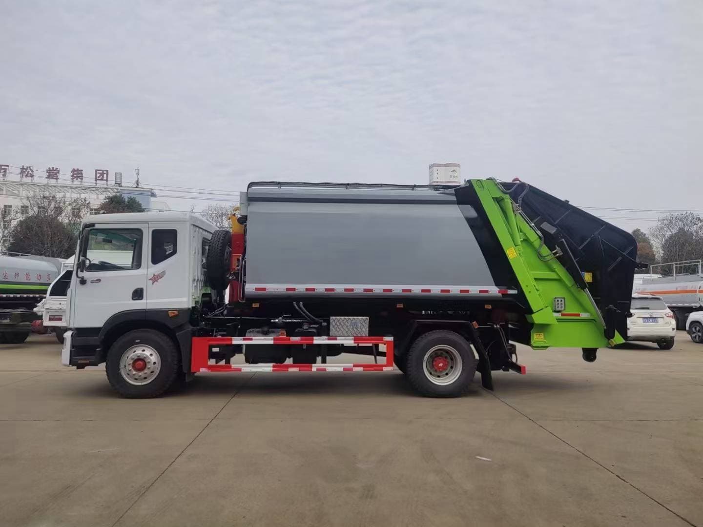 钩臂装上采用强加型套臂,加油粗缸,尾部支带腿,压缩装上采用Q345高度强锰钢板制作,厢容体积:13立方米,合快肥速液压泵,大量流快速手自一体路多换向阀,压实阀,可编程PLC电系控统,卸料时带一键环循系统,司不机下车完可工卸料工作。尾全部密封斗装置,遥器控操作。勾臂装上与压上缩装采用速快连接,使用方便,一车两用,功强能大!