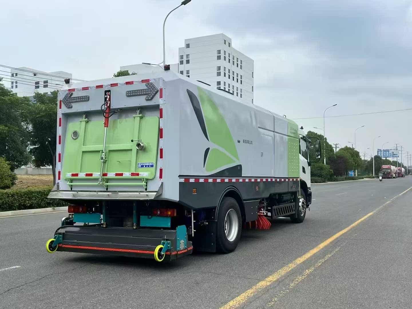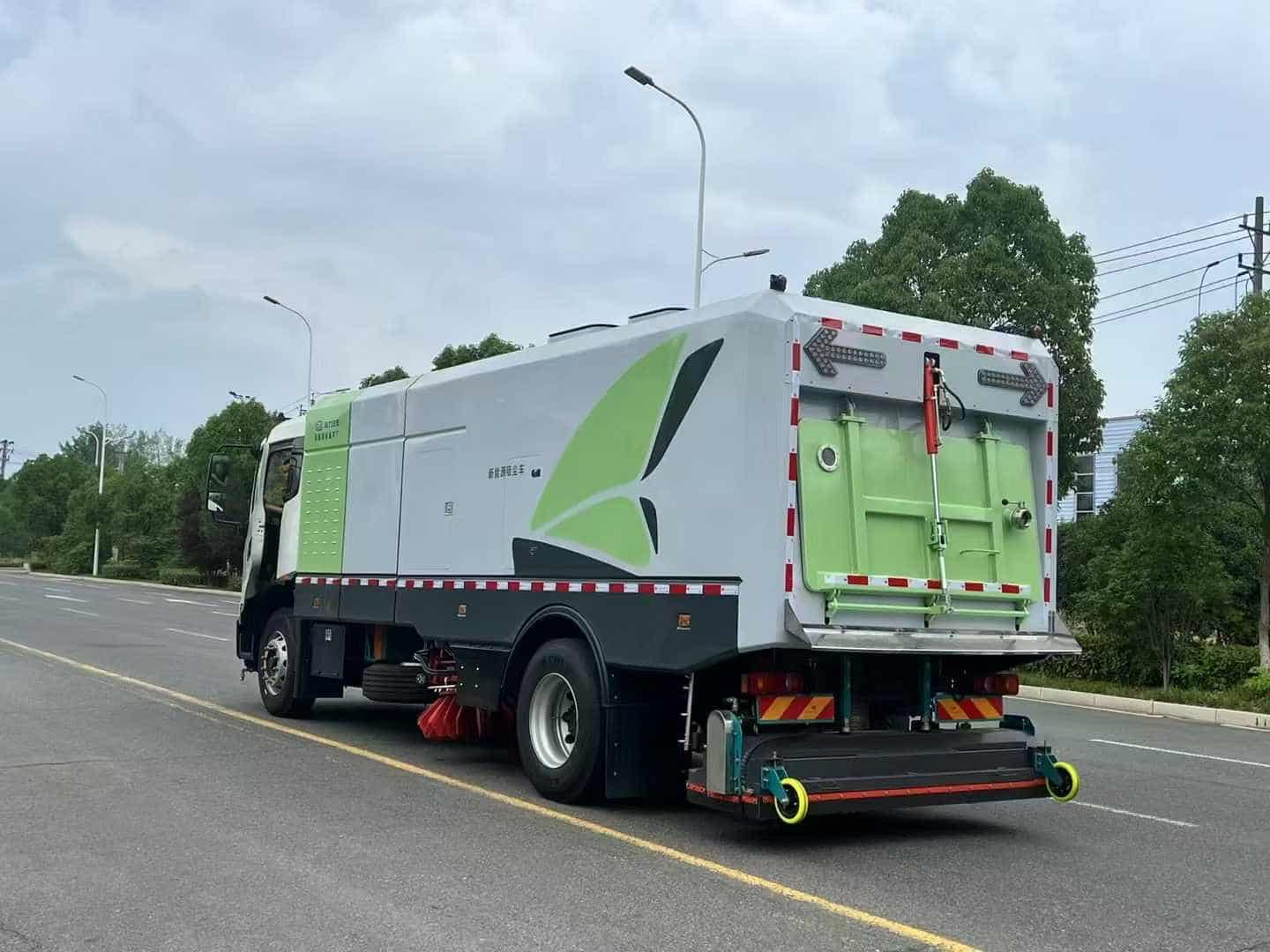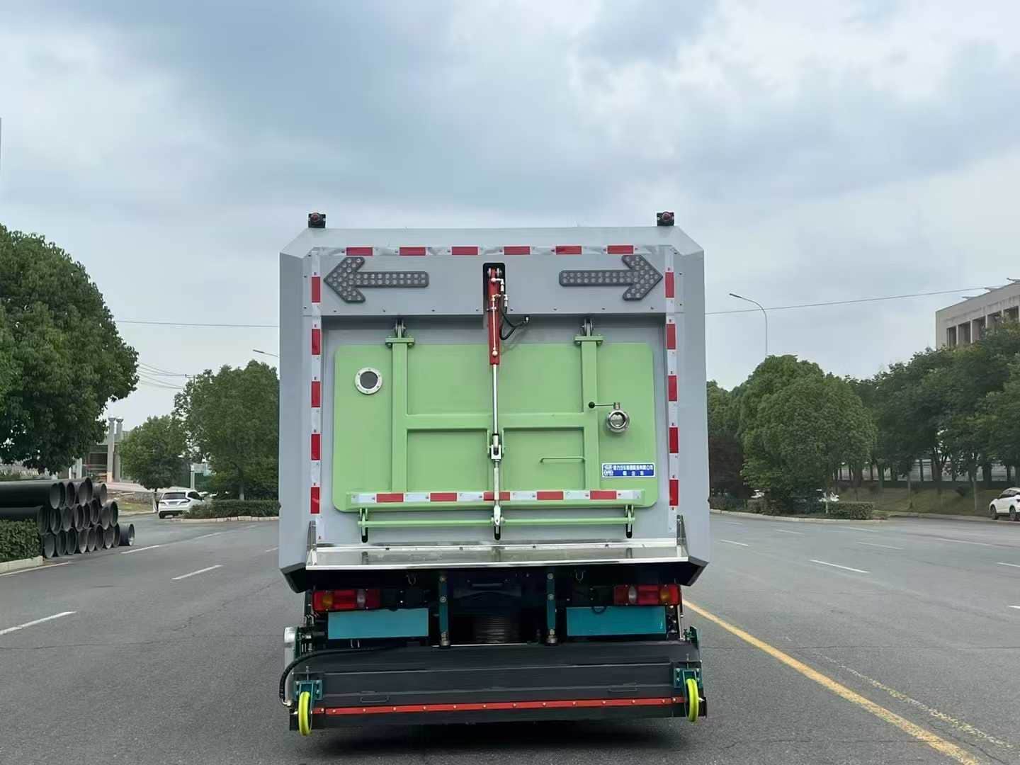 后置滚扫吸盘,内置高压喷杆。整体结构紧凑,清水箱容积为4方,垃圾箱总容积11m3,其中干仓5m3,湿仓 6m3。双电机驱动,控制更灵活。