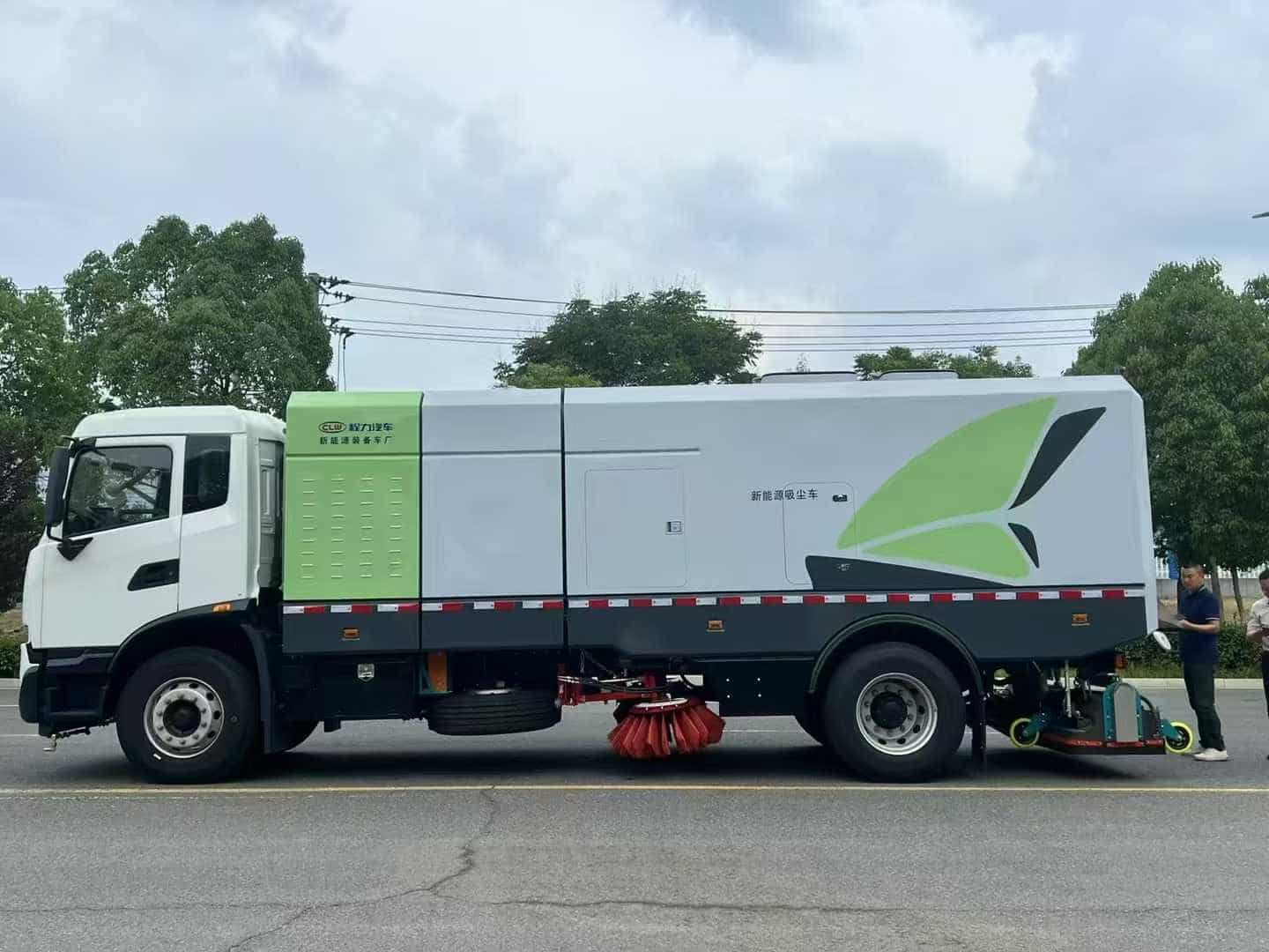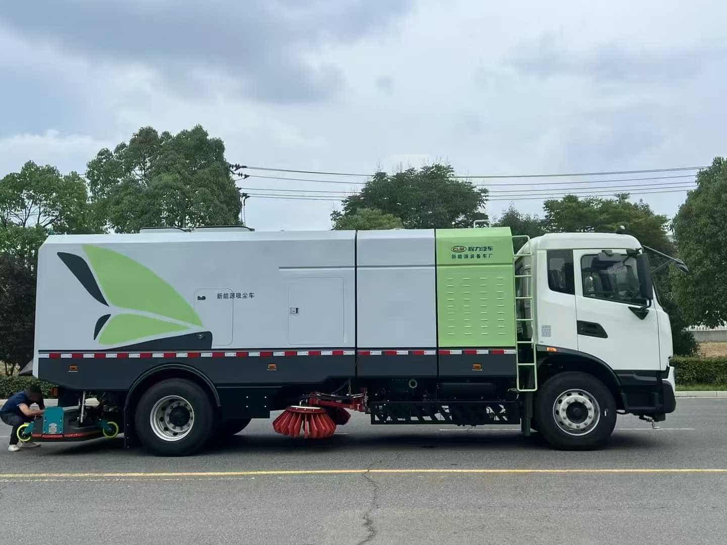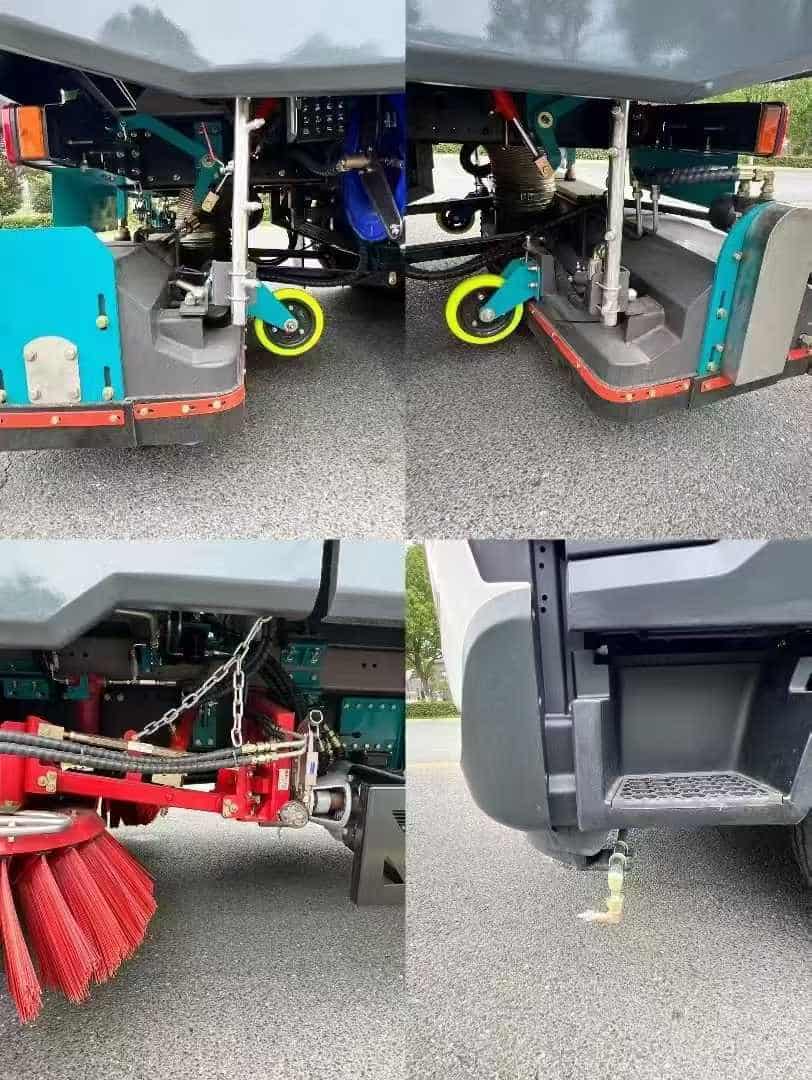 后置滚扫吸盘,内置高压喷杆。整体结构紧凑,清水箱容积为4方,垃圾箱总容积11m3,其中干仓5m3,湿仓 6m3。双电机驱动,控制更灵活。