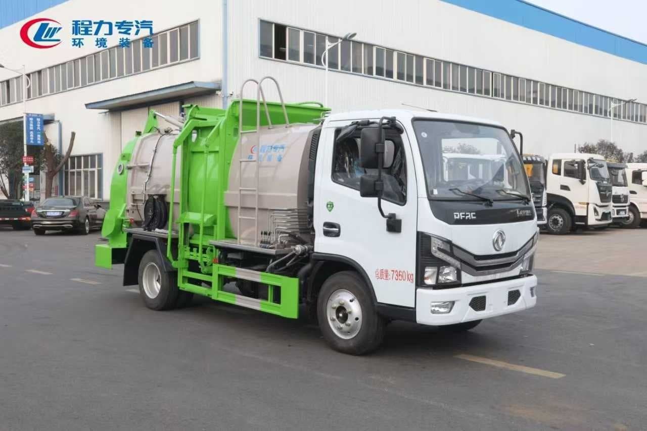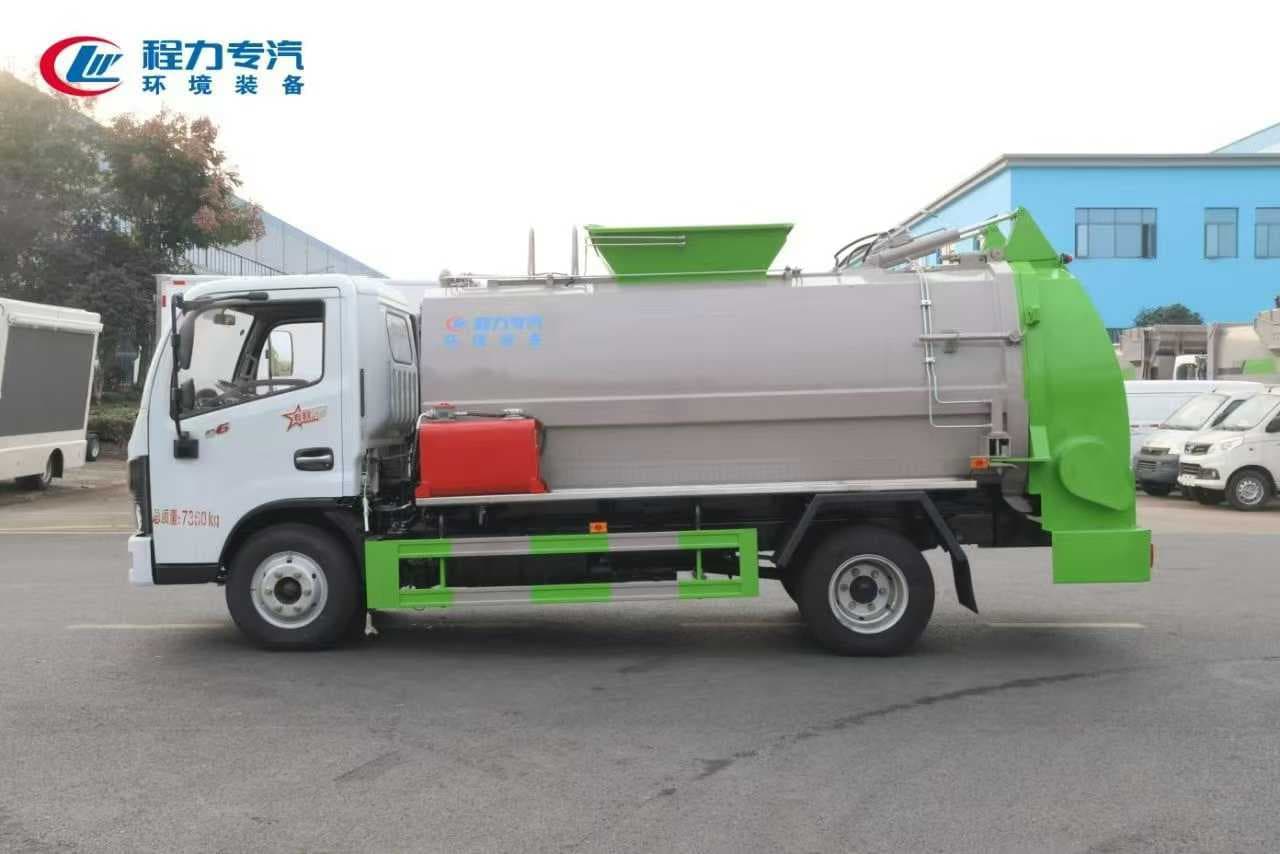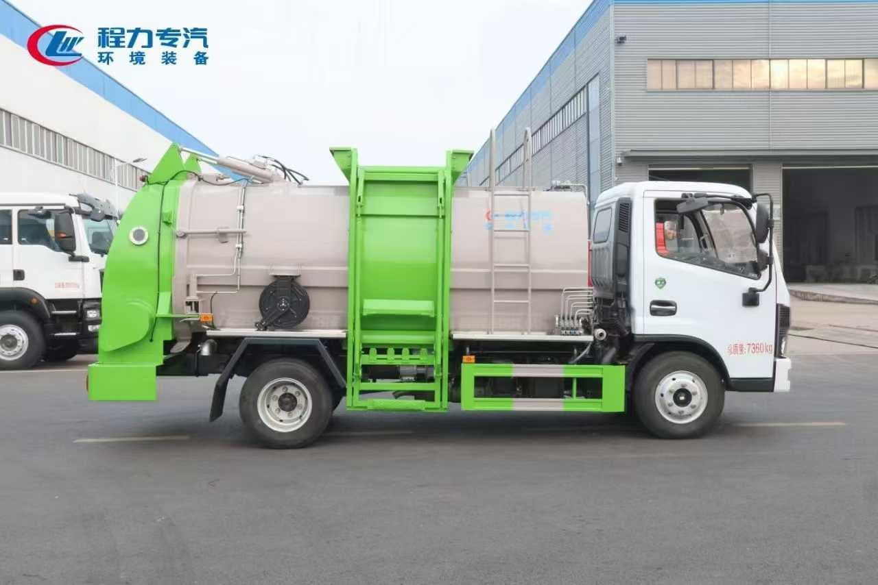 国六,3308轴距,玉柴155马力/全柴143马力,容积约7立方,厢体采用国标边三底四猛板制作,驾驶室电动操作一键功能,罐体右侧安装挂捅提升机构,推铲卸料带初步固液分离,可挂载120L/240L国标方形垃圾桶,带清洗功能,配清洗管清洗枪,选装200-300升清水箱,后门采用液压开启、液压关闭锁紧,夜间工作照明灯,尾部安装排污阀,防失误操作。