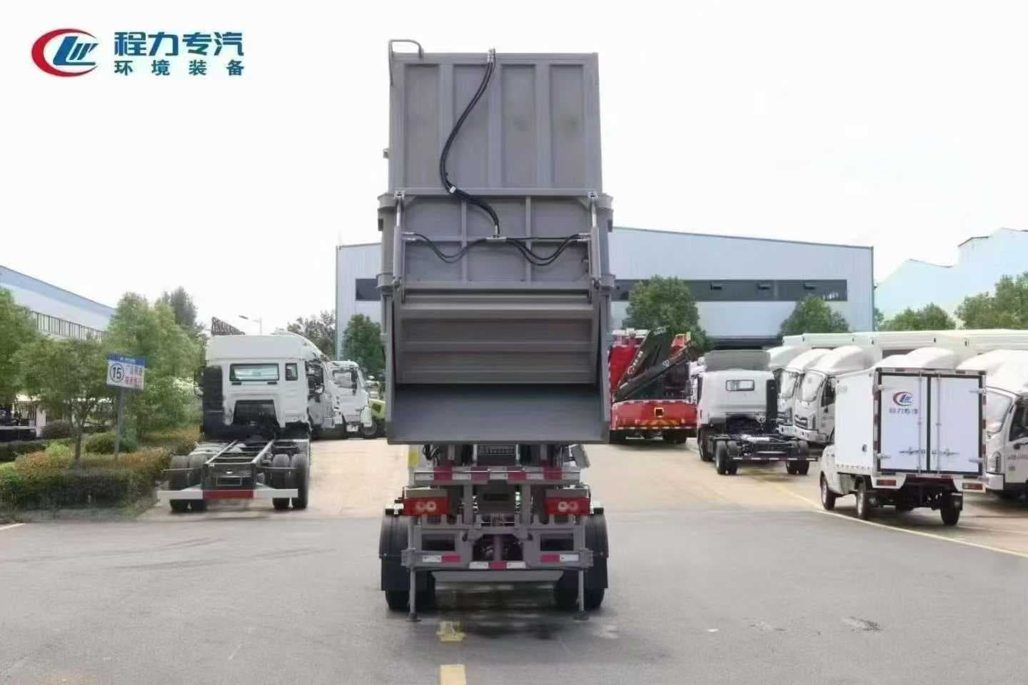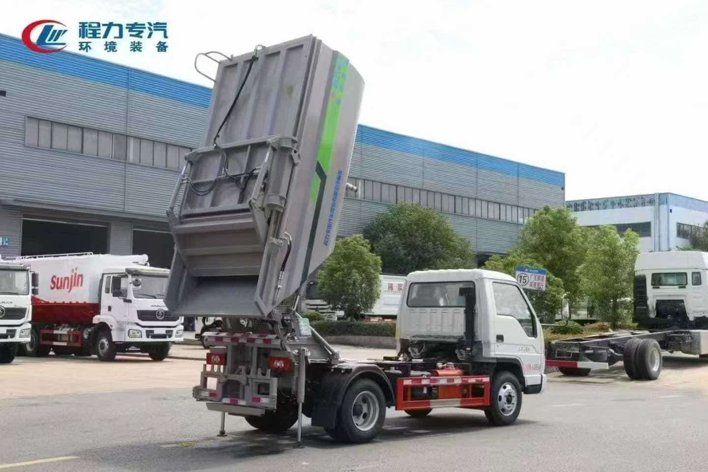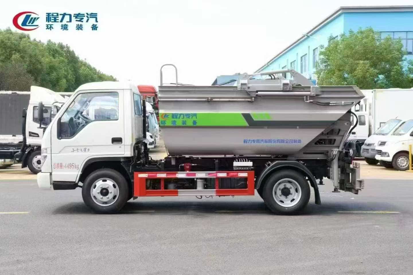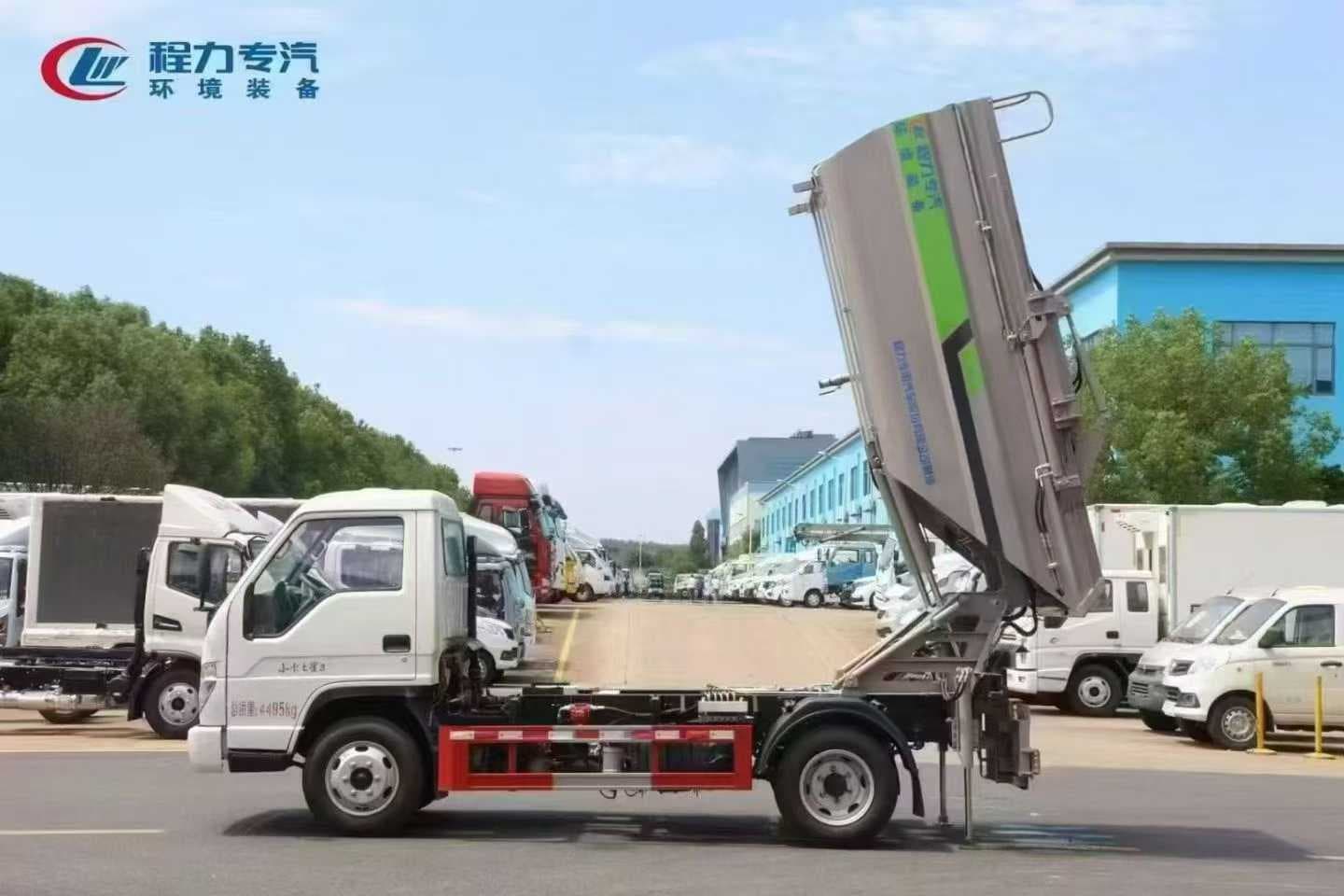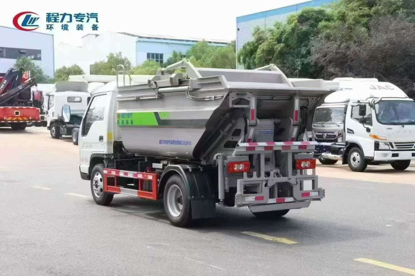 上装标配:上装标配无泄漏船型箱体结构,采用优质碳钢制作箱体,箱体容积 4.5 立方,船型箱体保证无泄漏,两条作业液压支腿保证卸料作业的平稳性与安全性,后翻转挂桶挂 120L-240L 垃圾桶,液压操作,带箱体排水口,带CAN电控系统(一键式操作),电控限位感应系统,带刮板、压缩滑板,国产液压油缸,扬州中梅多路阀,其他按公司标配标准制作。