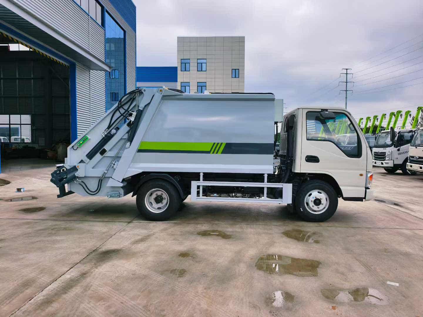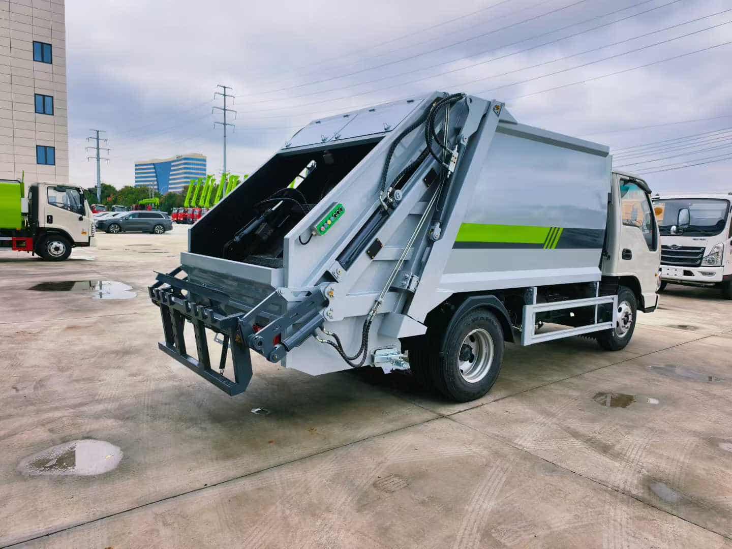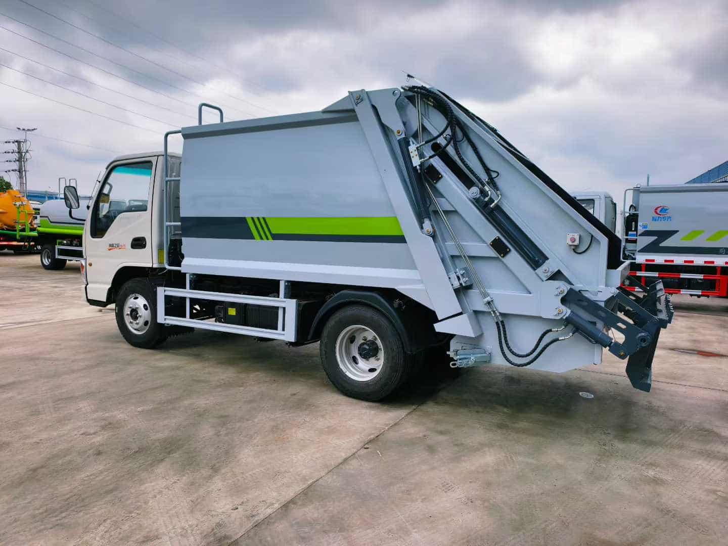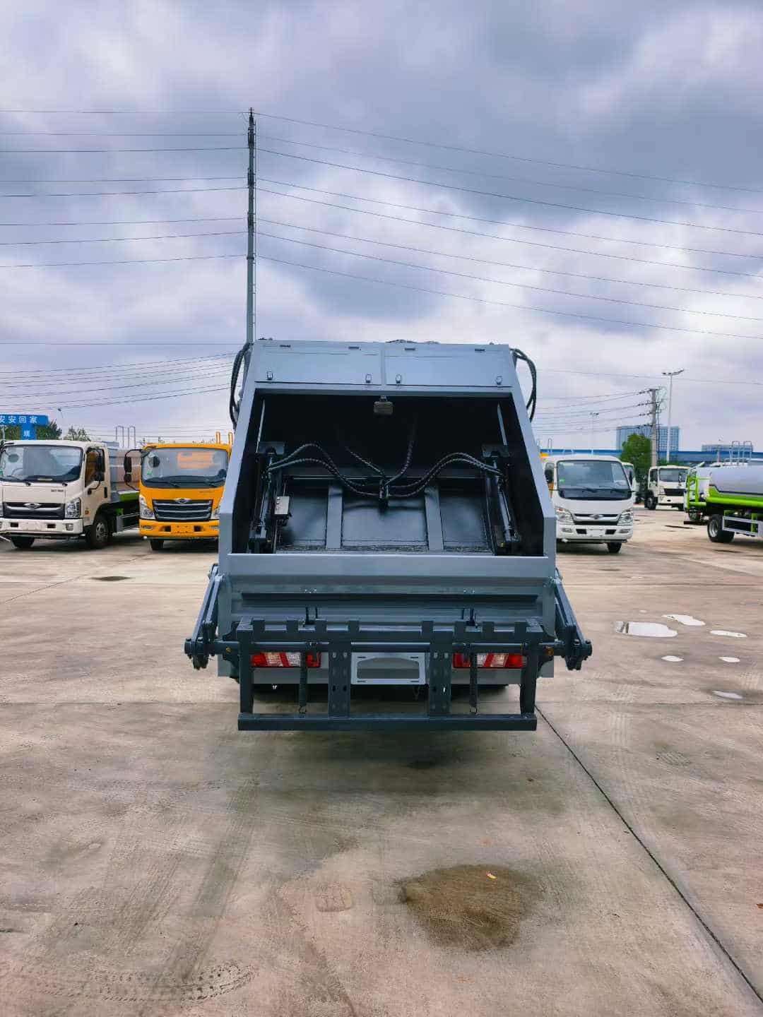 上装配置:整体上装采用T700高强板箱体,轻量化设计,大容量,上蓝牌,不超重,高度可选可进地下室高度。由厢体、装料机构、压缩机构、卸料机构、油泵、油缸、控制阀等组成的液压机构组成。装料机构由支架,连杆机构,凸轮,挂钩等组成,。国内知名品牌液压系统(安徽长源液压泵、中梅多路阀、压缩专用江苏定制油缸、浙江嘉善取力器);驾驶室内及车身外集中电控中联同款CAN总线控制系统;作业照明灯,标配无线遥控操作更方便。
