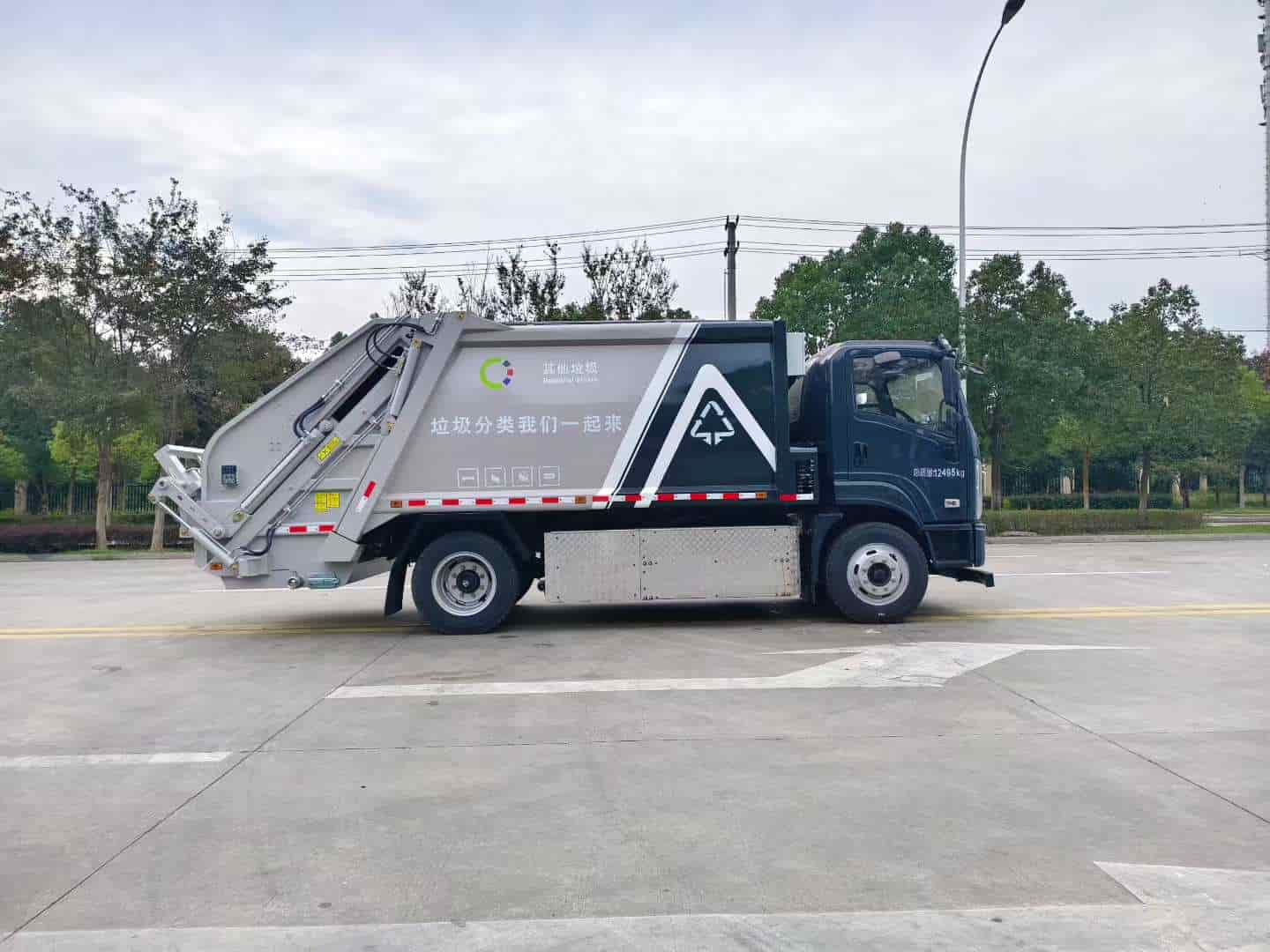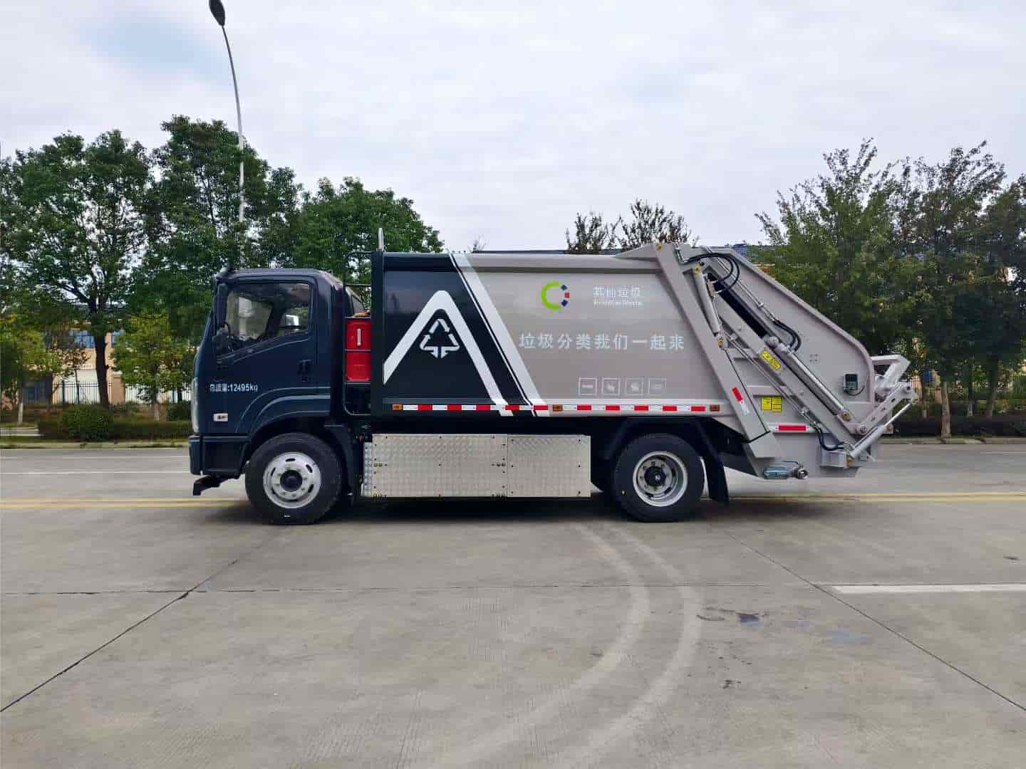 陕汽德创2120宽排半可翻转驾驶室(电动翻转),纯电驱动,宁德时代最新第三代磷酸铁锂电池,165度电,车辆总质量:12495kg,轴距3800mm,装载生活垃圾260-300桶(国产240L)。