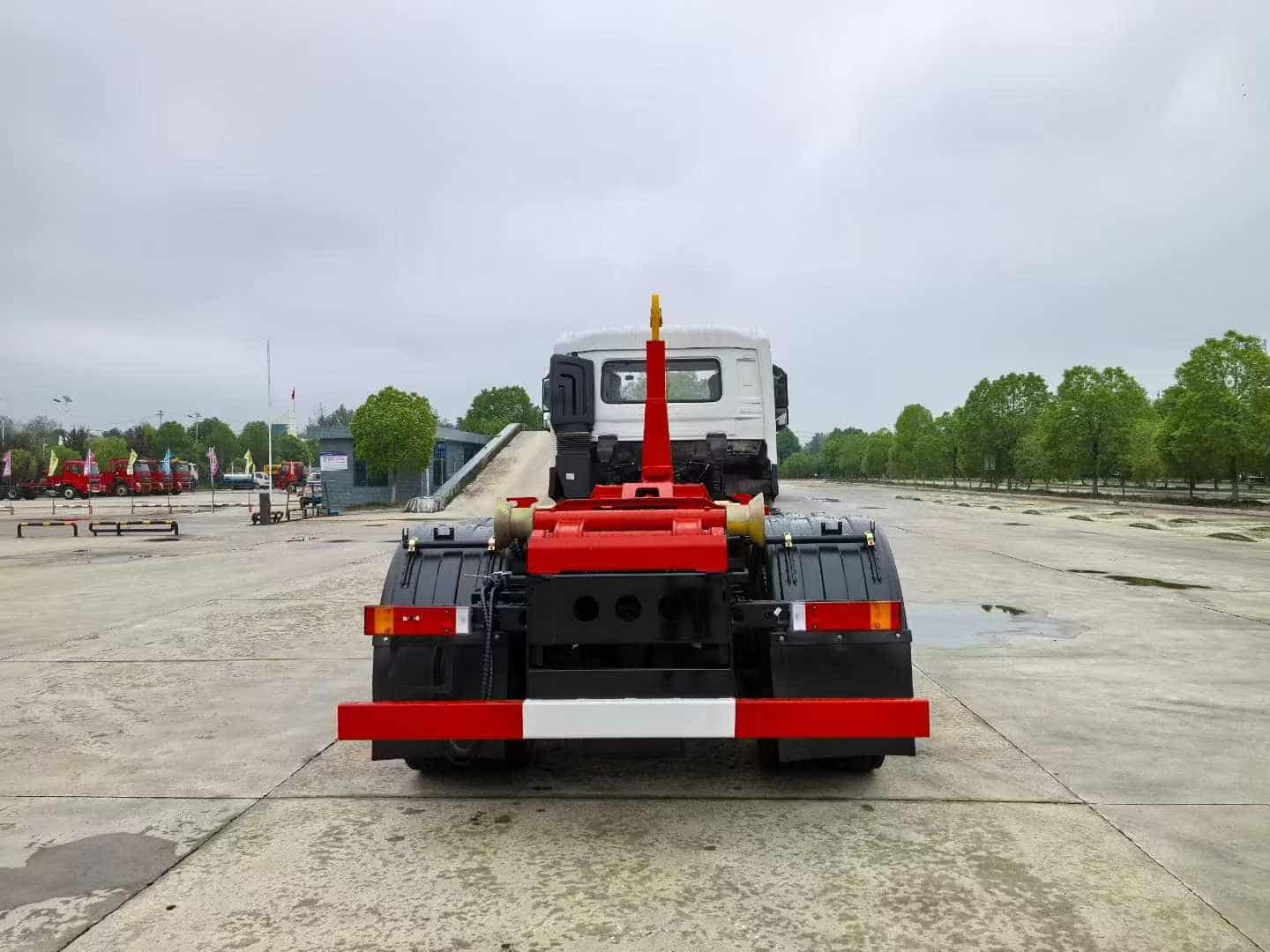 龙擎350马力,20吨上装:强度合金钢一体式主勾臂,加强型副梁,铸钢尾托轮,液压油缸为恒力油缸,后置液压滚轮支撑,国内品牌多路阀和齿轮泵,手电一体液压操控装置,液压完成上箱+下箱+锁紧+自卸等作业,实现一车配多箱的循环转运。