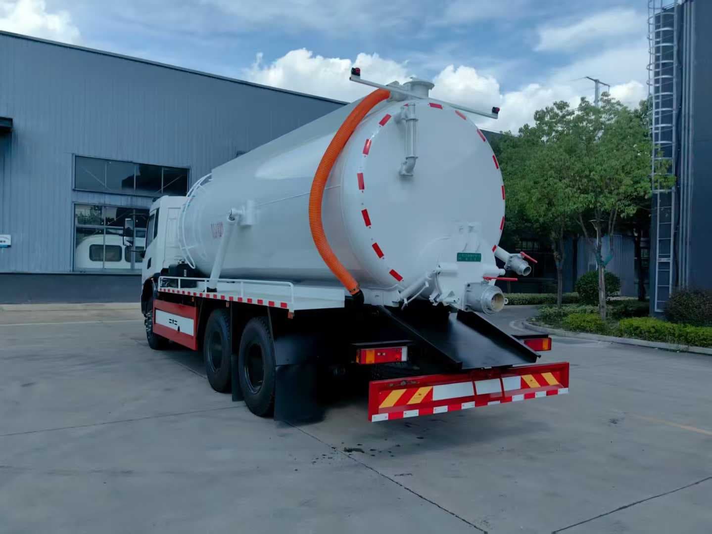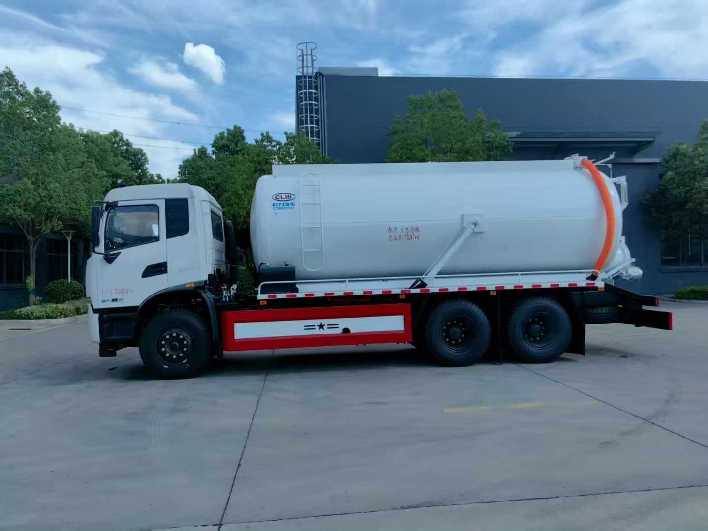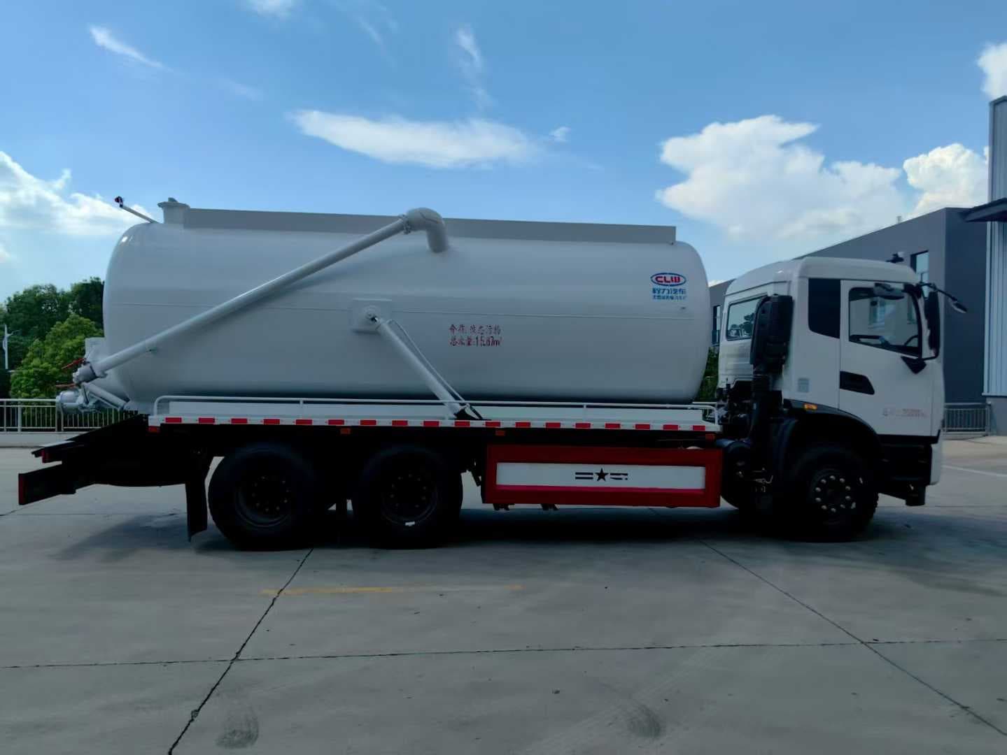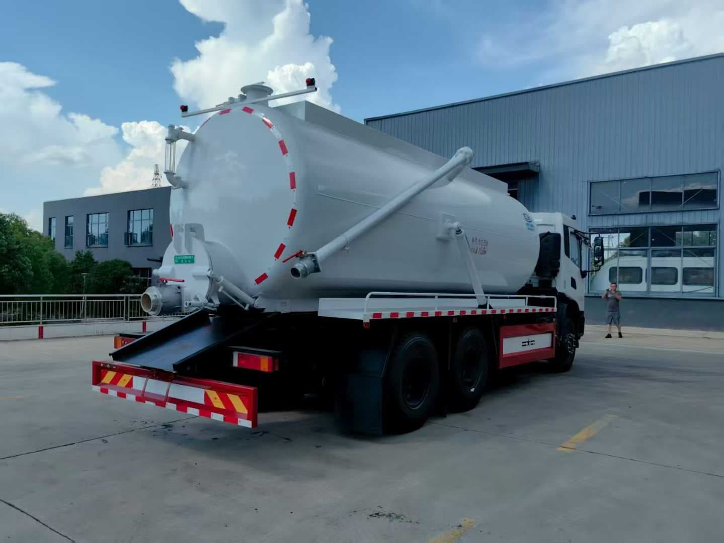 上装配置:罐体容积约20方,罐体尺寸:5700X2000,8m碳钢板材,选装安装204水环真空泵,后封头上一个800水泥盖放污,可液压开启,后封头一个6寸出口,一个100寸进口直通罐顶,加强型车架,重型自卸车设计,罐体带举升功能(选装前顶自卸),罐体尾部箭头灯,带一个视污窗口。带8米吸污管。其余厂内标配!