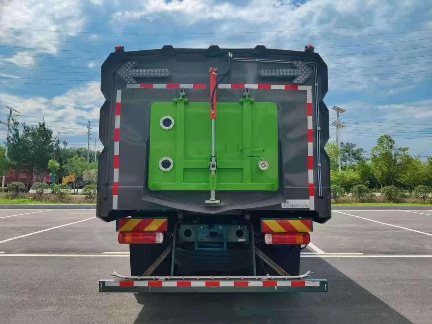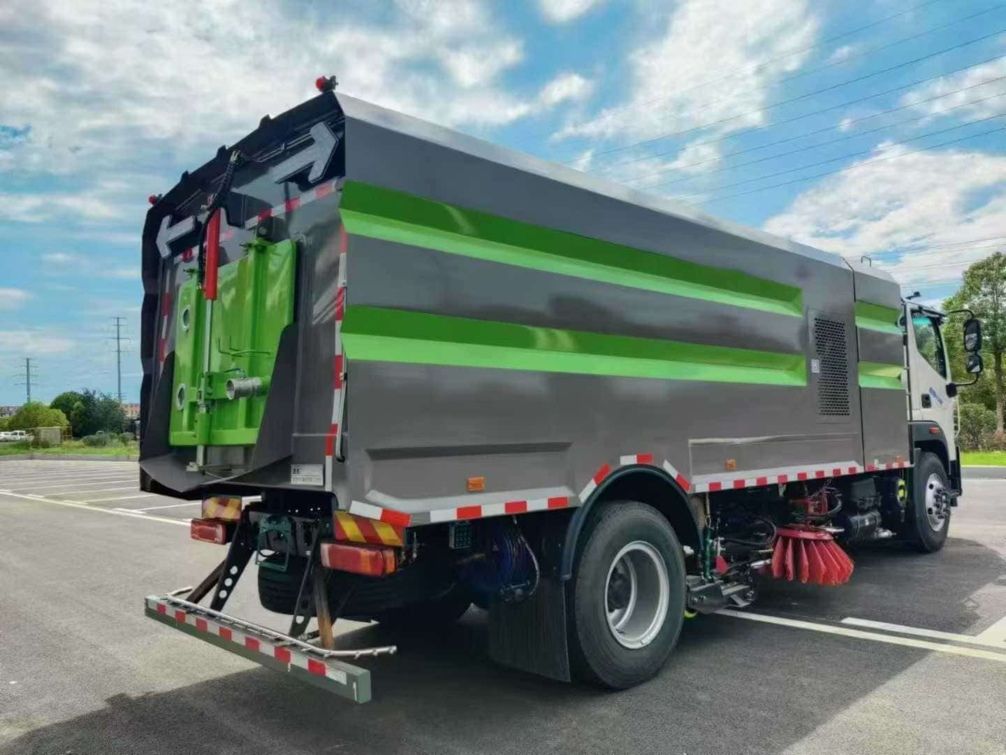 上装主要配置:副发动机、风机、高压水泵、清水箱约10立方、垃圾箱约7立方、左右立扫、带喷水杆的宽吸嘴、低压冲洗系统、扫盘降尘系统、液压系统、专用装置电控系统和副车架等改装而成,