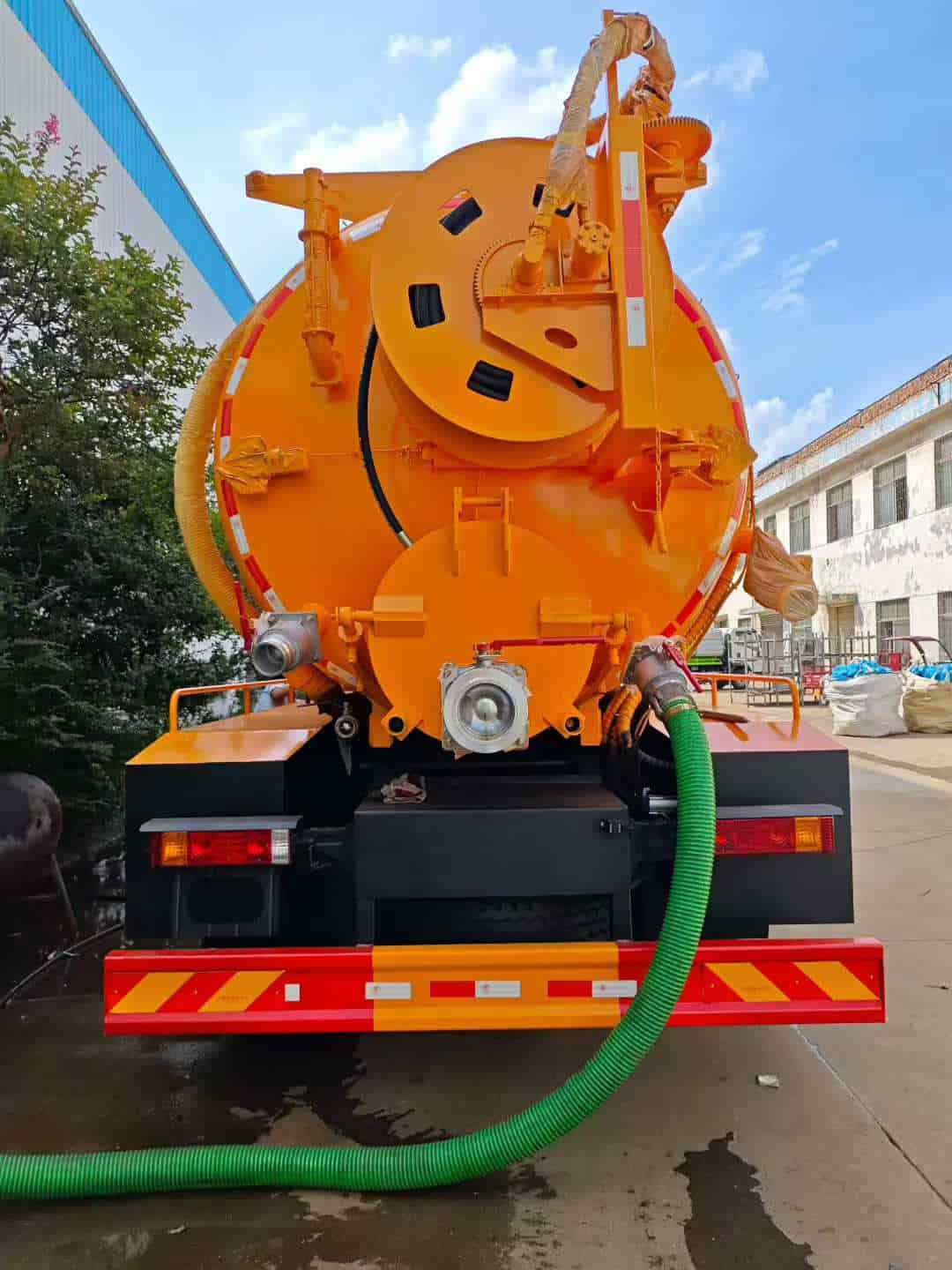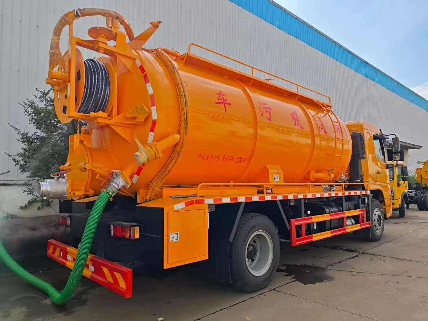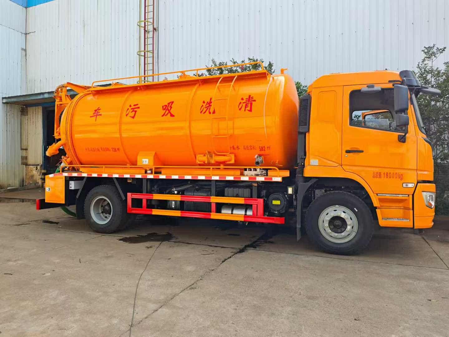 功能配置:污水约9方,清水约4.5方,罐体采用约8mm个厚碳钢板制作,亿丰2BE-204水循环泵,品浮280流量高压泵加过滤器,后封头8mm厚卷盘一套,配100米22号高压管,后盖开启,带600的快开,尾部一个150圆球阀,一个100球阀,右侧边一个100清水口,一个100进料口,,罐体顶部2个水泥罐口,大防溢阀,罐顶两侧加平台,顶部一个100的球阀互通,侧面一个100的球阀互通,小箭头灯,边灯带电,尾部LED工作灯。