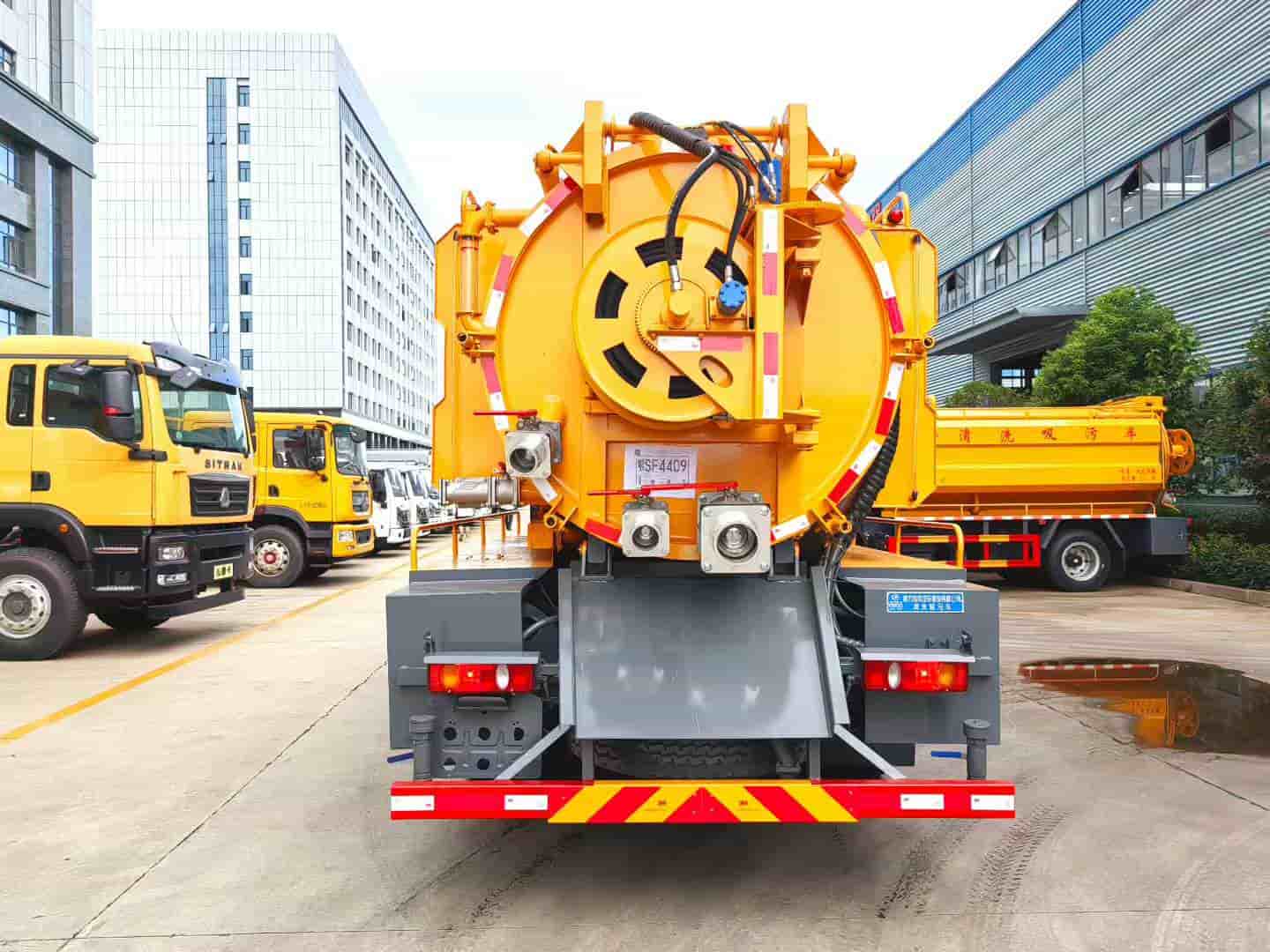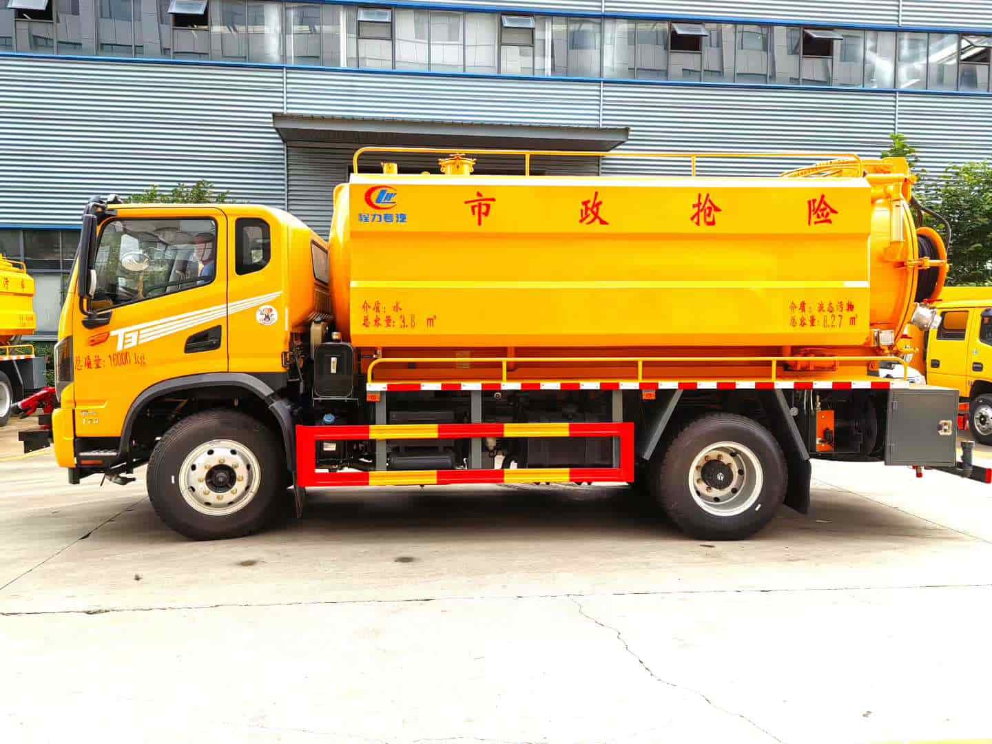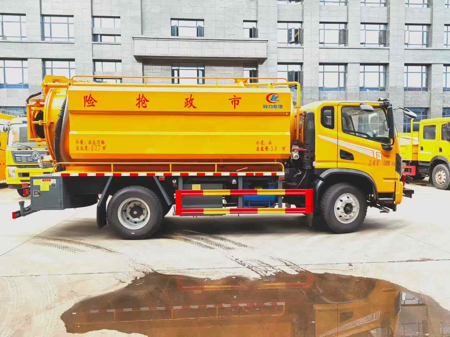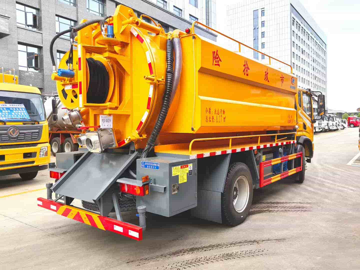 上装配置:严格按公告外形及尺寸制作,水箱4方,污罐9方,水箱采用4mm厚国标Q235碳钢板制作,高压采用品孚215流量新款高压泵,配液压马达回位卷盘及100米直径19高压管,10个标准喷头,吸污罐体采用6mm厚国标Q235碳钢板制作,SK-15水循环泵,视污管,防溢阀,罐体带举升,后盖液压开启,配1根8米吸污管,罐体后盖壹个150球阀带出口,100球阀进污口,气吹水,水污互通,卷盘液压左右摆动,装双头夹心加装渣浆泵一套,其他为清洗吸污车标配,加装取力器安装亿丰40/50洒水泵带可拆卸式前冲后洒,前冲预留电子炮接口。