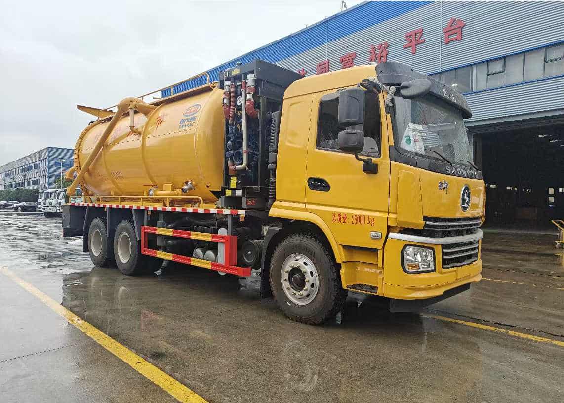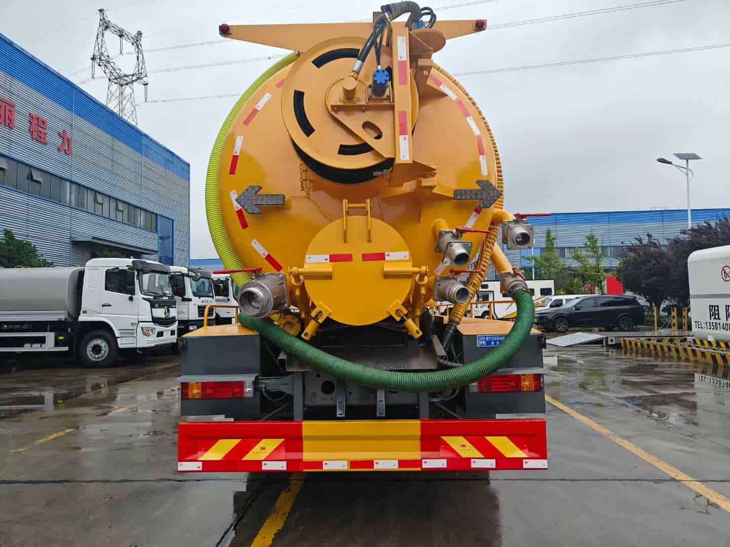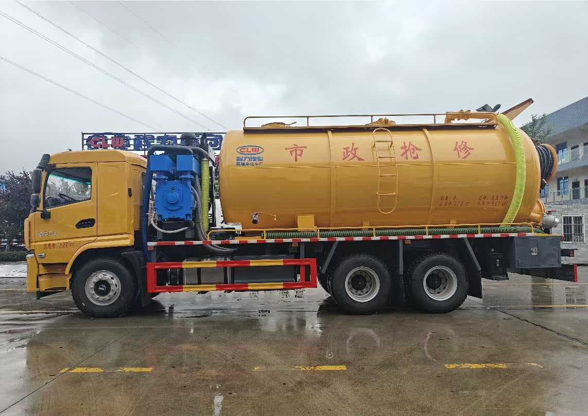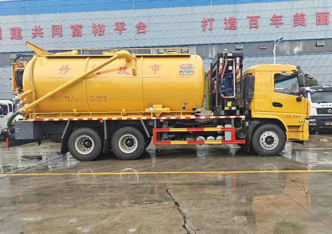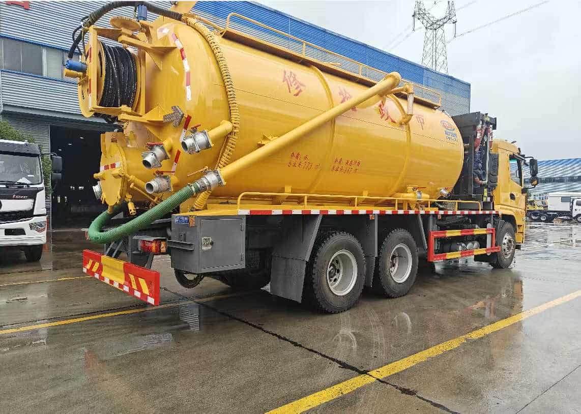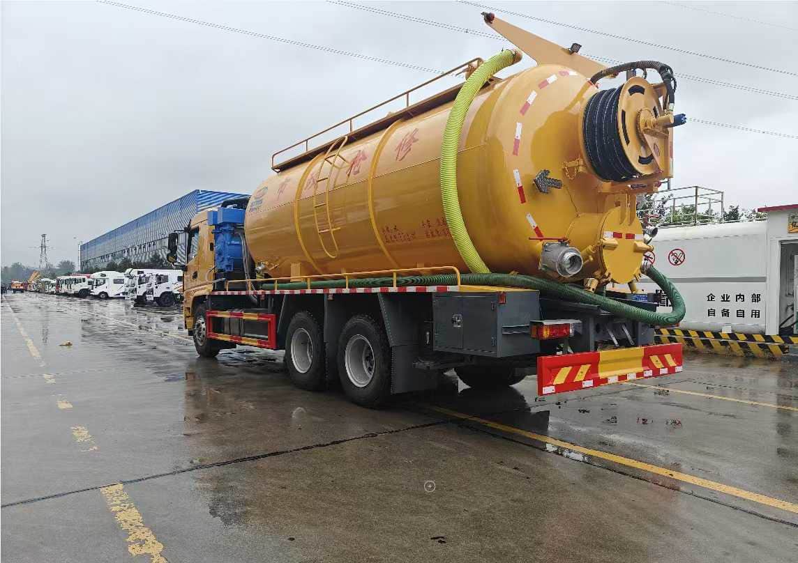 吸污罐:一个水泥罐口,罐内爬梯,罐体内部防浪板加固,水循环泵水箱为碳钢材质,水箱均在左侧;吸污罐厚700排污口液压打开,不开大盖,左侧一个150球阀排污口,右侧一个100铝合金球阀;右边一个100铝合金球阀;罐体尾部两侧工具箱,手动油门,压力表,防溢阀,照明灯,高压泵带气吹水。一根10米的吸污管带接头。带副发潍柴460马力,配258水循环泵
