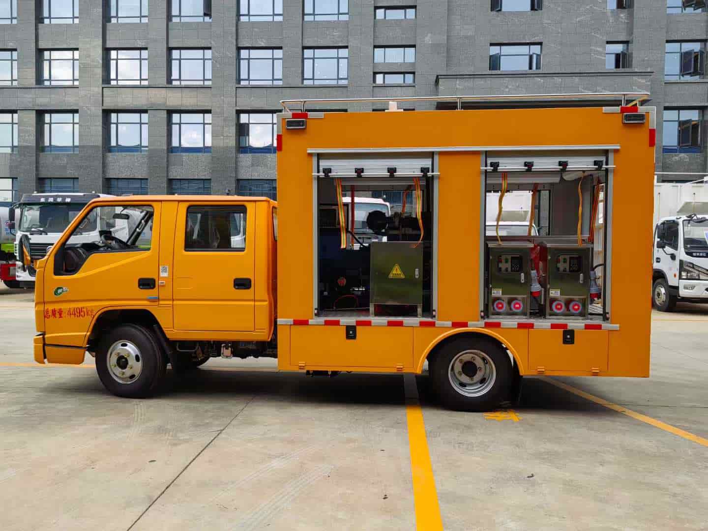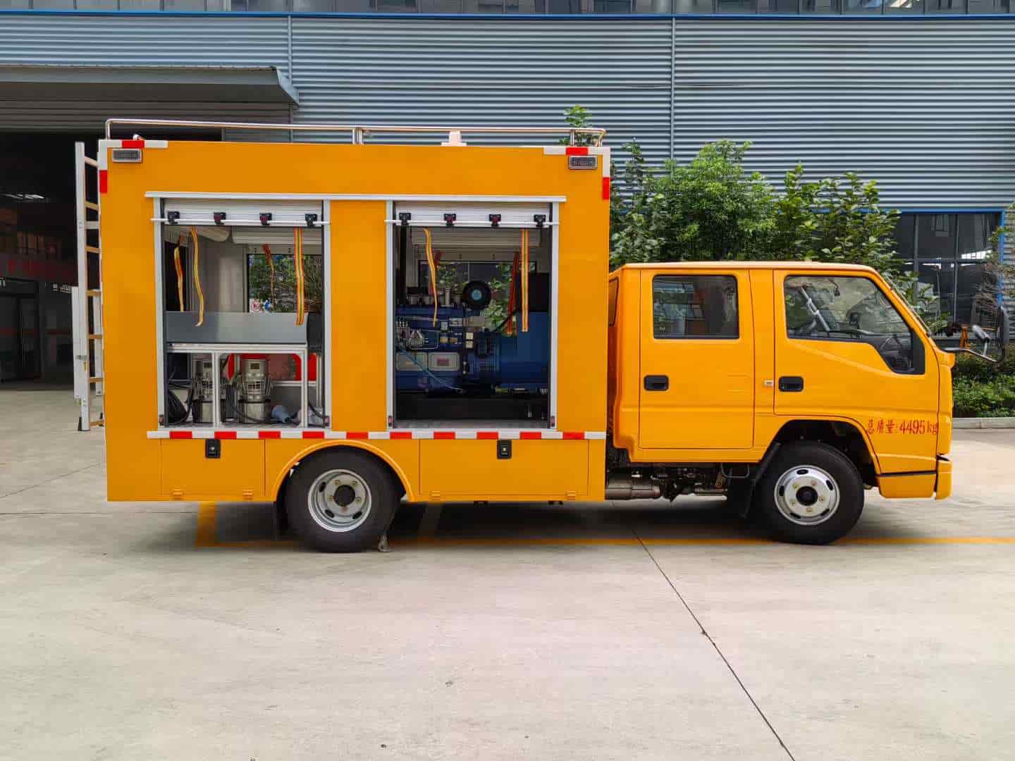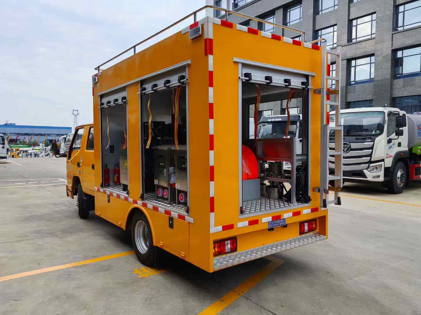 上装配置: 车箱为一体式全封闭车箱,车箱有隔音功能,厢体防火,阻燃,防雨,防尘,防锈,降噪,隔震,长期抗震结构,厢体外观按照公告外观制作,左右卷帘门,尾部是卷帘门,厢内安装LED作业灯,作业灯带独立开关,底板采用花纹板。配备康明斯50KW发电机组,2台功率22KW便携式超轻型高速潜水泵,单台水泵流量可达500m³/h,单泵配40米排水管(20米/根),水管直径 DN200mm,水管材质为涤纶长丝编织。配有升降照明灯,升降灯可通过无线和有线遥控两种方式控制,升降灯升降高度为1.2米,可水平旋转。带接地桩和接地电缆线,便携泵控制柜,潜水泵浮圈,配两只手提式干粉灭火器2只。其余为标配。