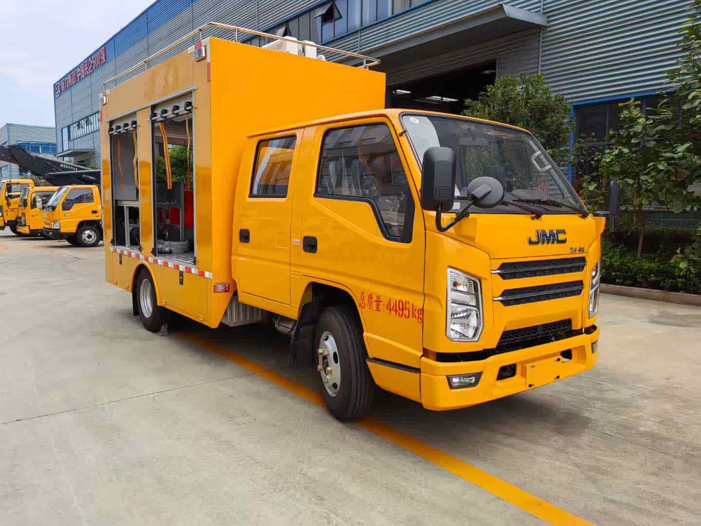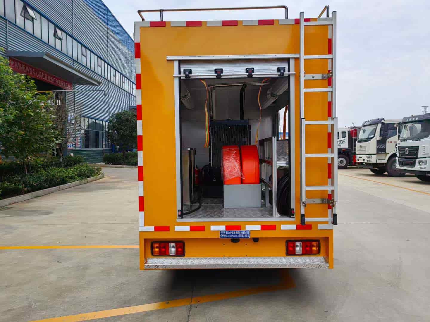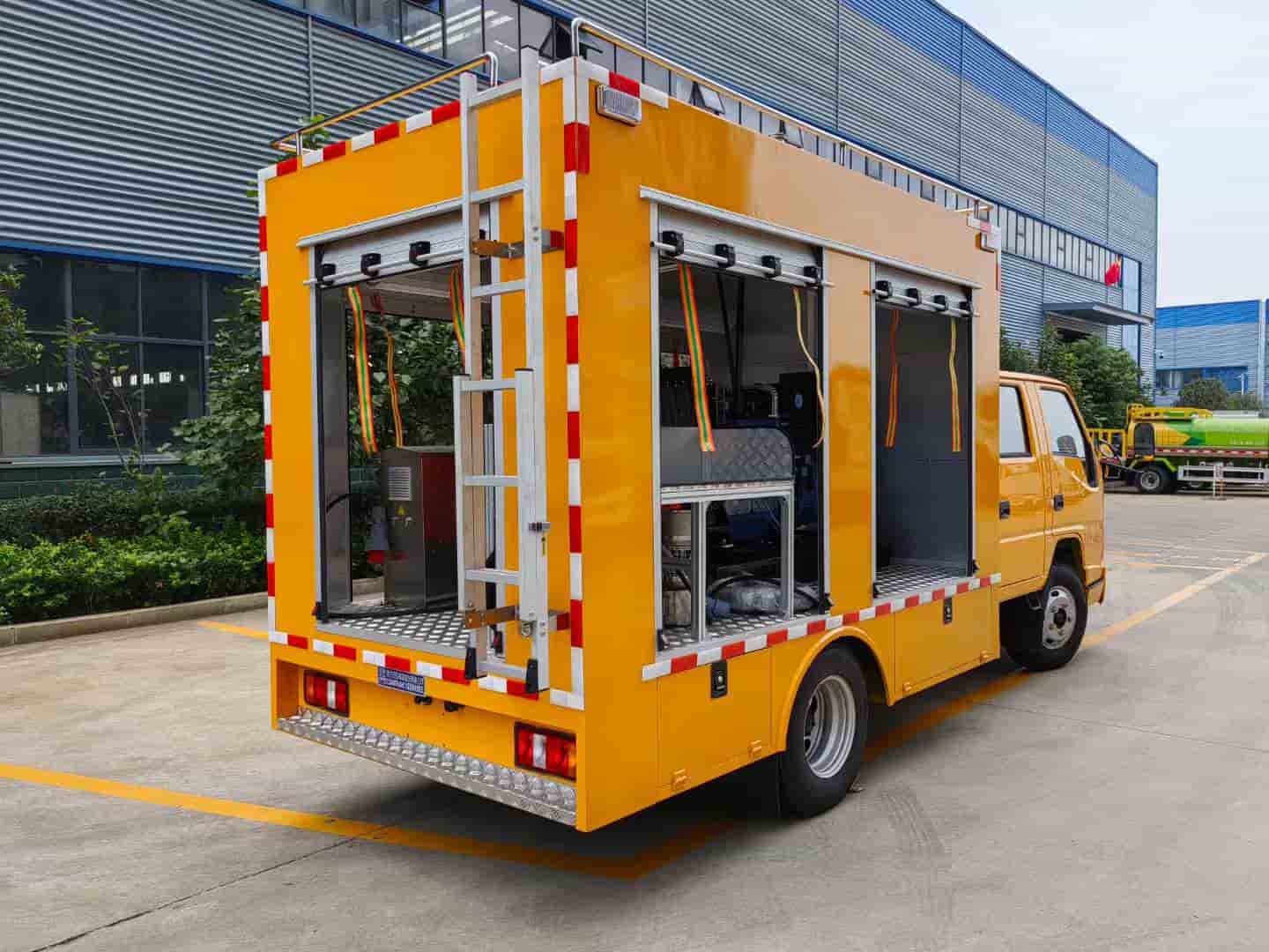 上装配置: 车箱为一体式全封闭车箱,车箱有隔音功能,厢体防火,阻燃,防雨,防尘,防锈,降噪,隔震,长期抗震结构,厢体外观按照公告外观制作,左右卷帘门,尾部是卷帘门,厢内安装LED作业灯,作业灯带独立开关,底板采用花纹板。配备康明斯50KW发电机组,2台功率22KW便携式超轻型高速潜水泵,单台水泵流量可达500m³/h,单泵配40米排水管(20米/根),水管直径 DN200mm,水管材质为涤纶长丝编织。配有升降照明灯,升降灯可通过无线和有线遥控两种方式控制,升降灯升降高度为1.2米,可水平旋转。带接地桩和接地电缆线,便携泵控制柜,潜水泵浮圈,配两只手提式干粉灭火器2只。其余为标配。