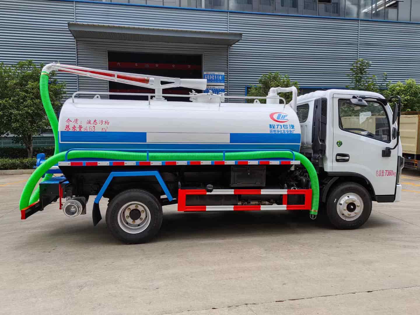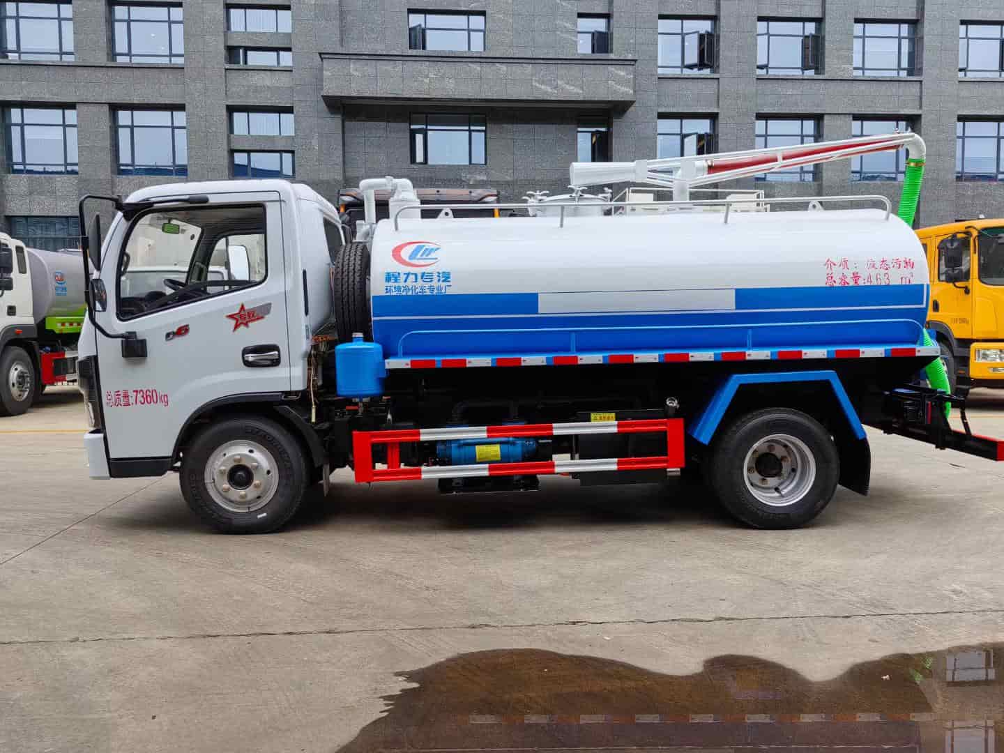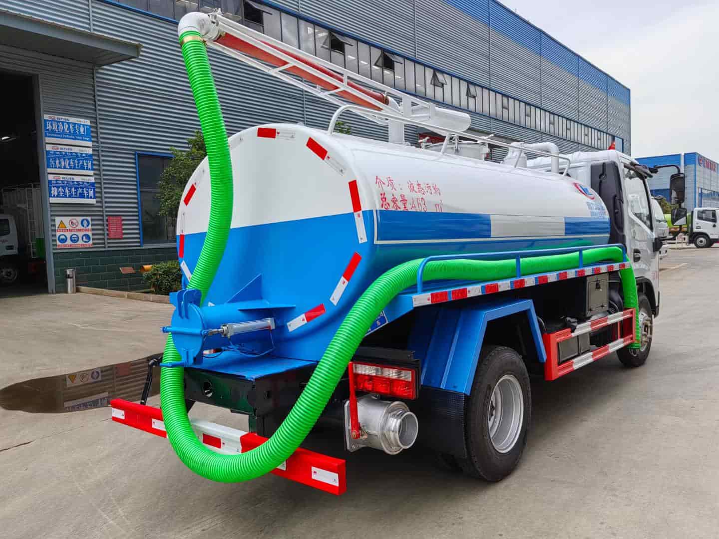 改装配置:罐体中间加装防浪板,容积5方,采用优质5毫米钢板制作,前后封头加强处理,罐体上面设计检查人孔,罐顶安装可旋转吸粪吊杆,尾部安装220毫米排污口。真空泵采用亿丰5吨油泵,带水汽分离器,防溢阀带视粪窗,一个自流口,洗手装置,吸粪管8米一根。