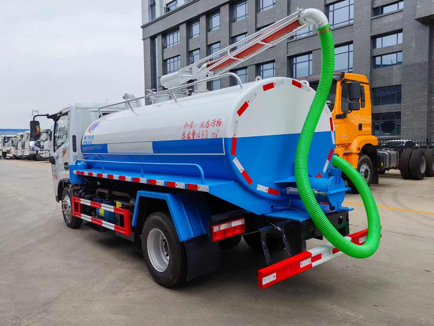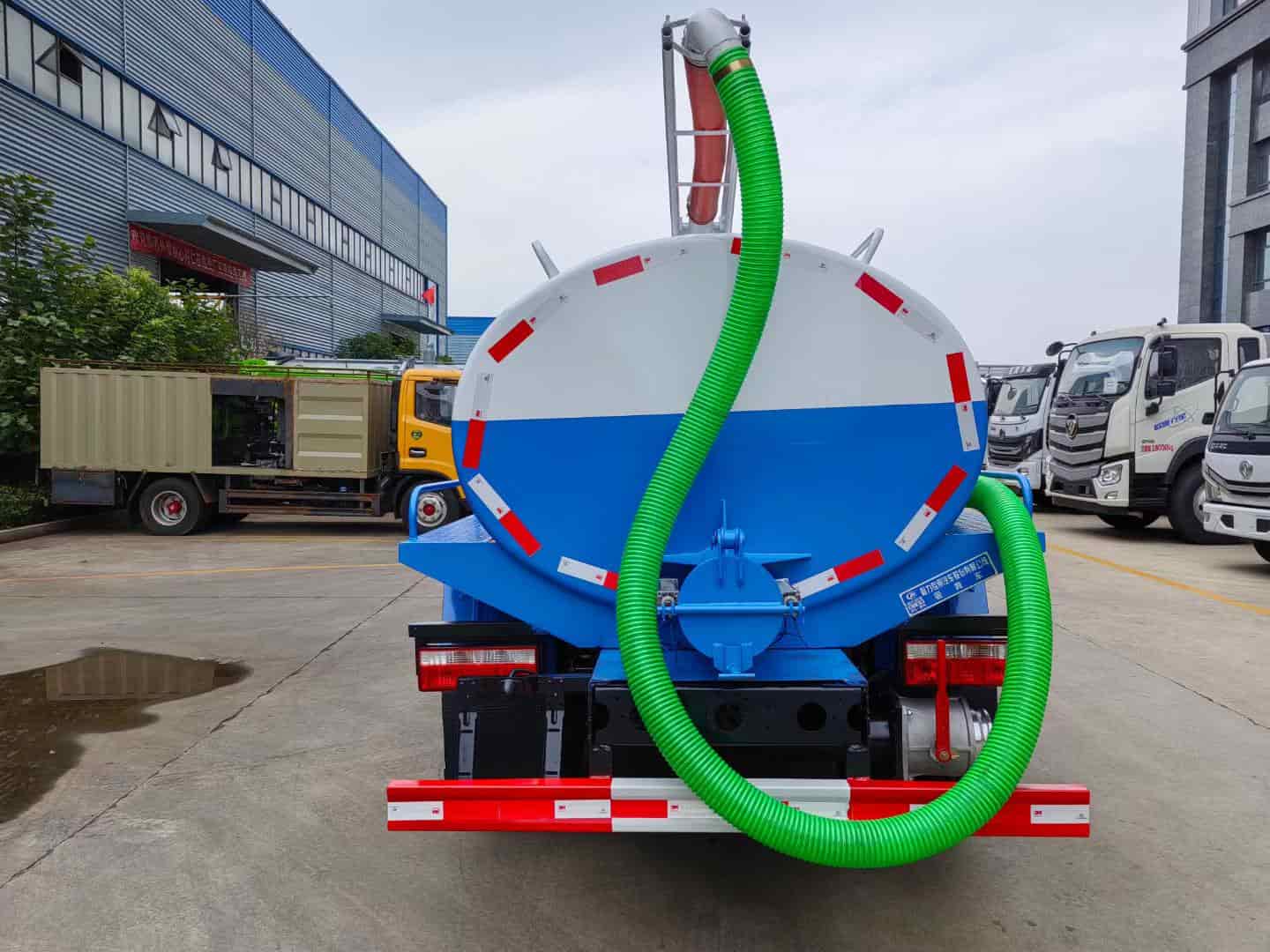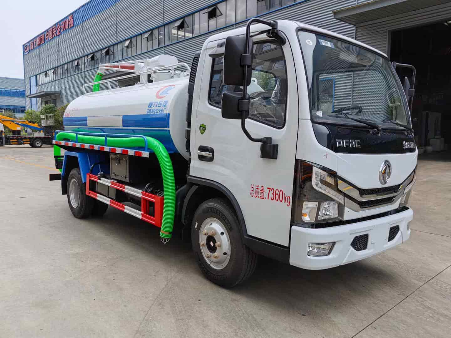 改装配置:罐体中间加装防浪板,容积5方,采用优质5毫米钢板制作,前后封头加强处理,罐体上面设计检查人孔,罐顶安装可旋转吸粪吊杆,尾部安装220毫米排污口。真空泵采用亿丰5吨油泵,带水汽分离器,防溢阀带视粪窗,一个自流口,洗手装置,吸粪管8米一根。