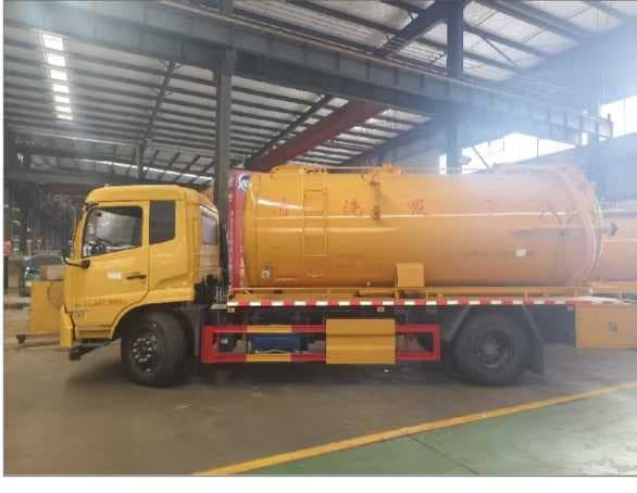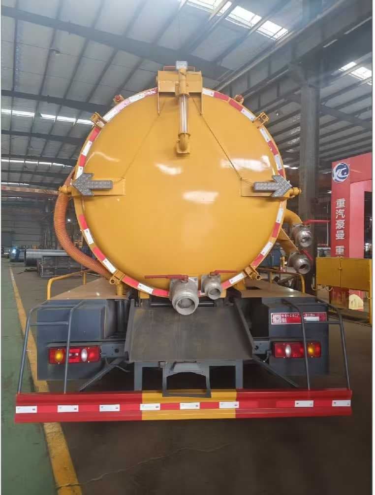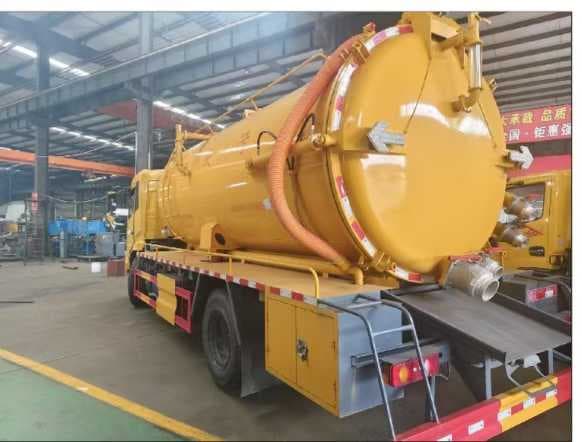 上装配置:污水罐与封头国标碳钢板6mm,封头与直缝采用自动焊,污水12方,清水3方普通罐口(尾部左后工具箱加装一个小清洗机,用于清洗车辆及罐体,带15米软管)带镀锌管爬梯装65消防加水65低位排水球阀,分仓用6mm封头,半圆形防浪板满焊,山东淄博红日2BE-204水循环泵,吸污泵水箱做最大内焊十字加强筋里面做防锈装65加水50排水球阀,黑金刚四通阀,新式快拆防溢阀用不锈钢过滤网,中置顶举升油缸加粗装液压限位阀和机械限位,后盖液压开启装4个锁紧丝,尾部一个150mm排污球阀,一个100mm自流球阀装最低,尾部右后一个100mm侧抽,侧抽上侧一个100mm清水球阀。一个150mm偷排球阀,电磁阀自动切断防溢阀,视污管装50球阀,洗手装置,工作爬梯,箭头灯,照明灯,其余标配、