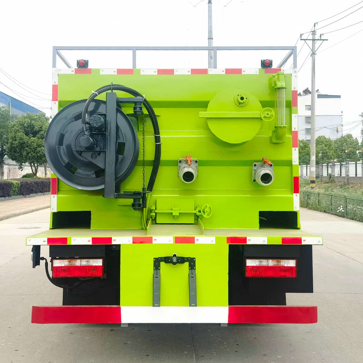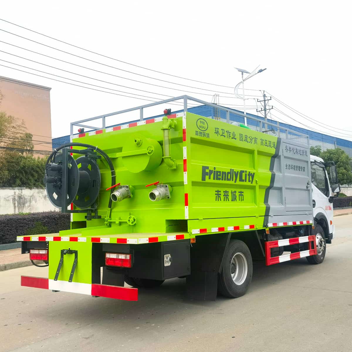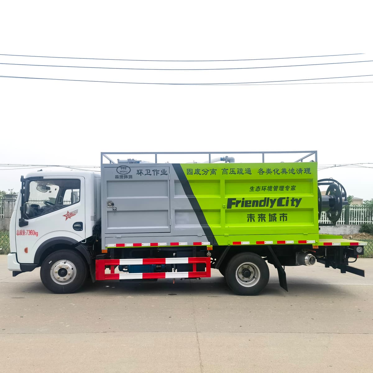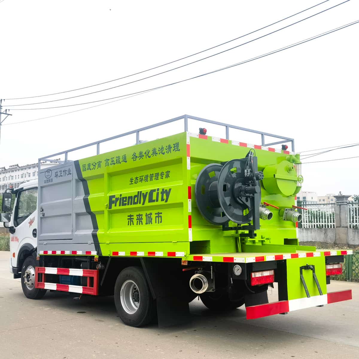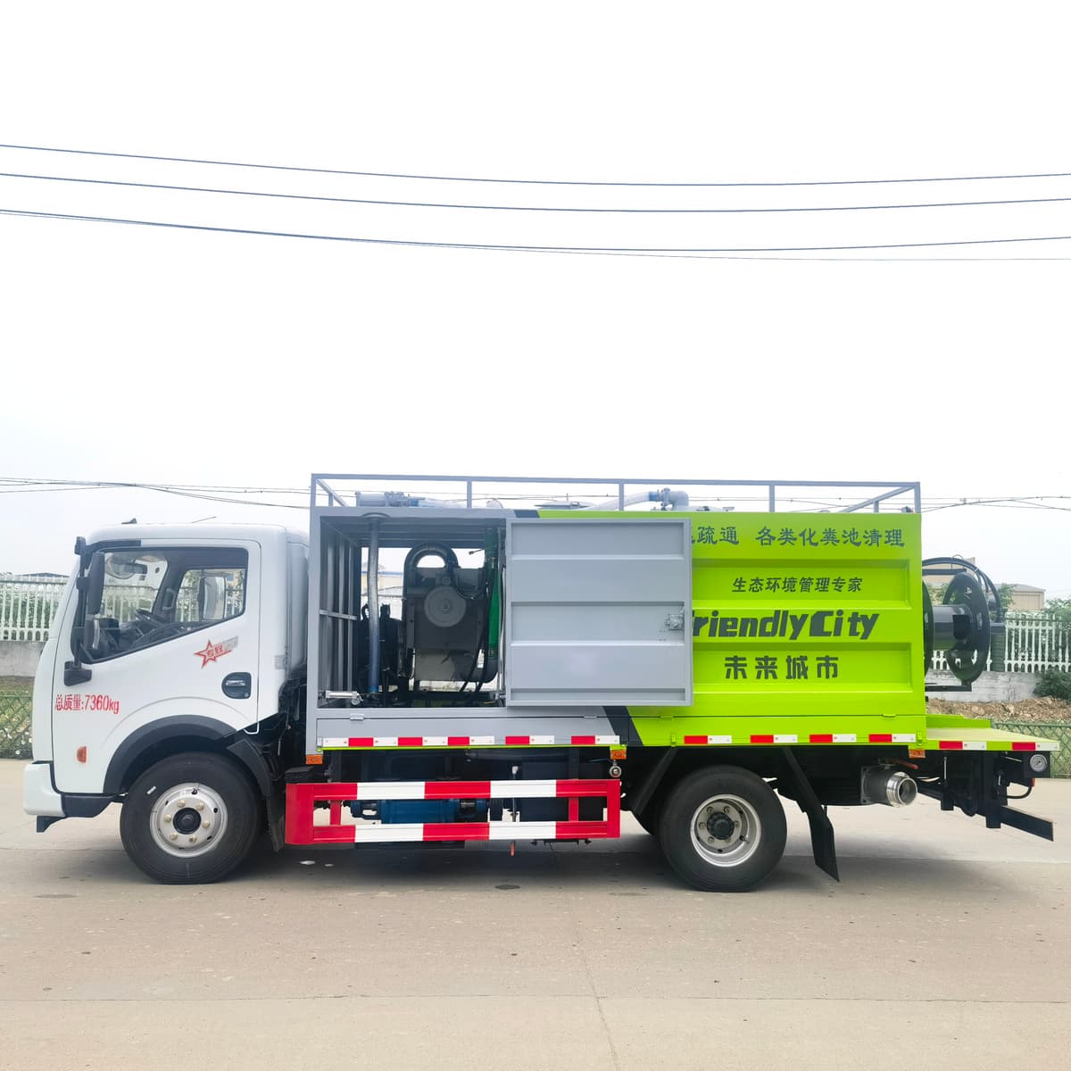 污水箱容积约5m³,采用6mm高强碳钢板制作,清水箱容积约3m³,采用4mm优质碳钢板制作,配备SK-9水环式真空泵,双耀215高压柱塞泵(可选择同级别品孚高压泵),SP-3型无堵塞自吸式排污泵,一体式铰刀式固渣分离滚筒(可选装前置独立分体式固渣分离机),液压卷盘,∅19型60米高压管,可选配液压渣浆泵,其它标配。