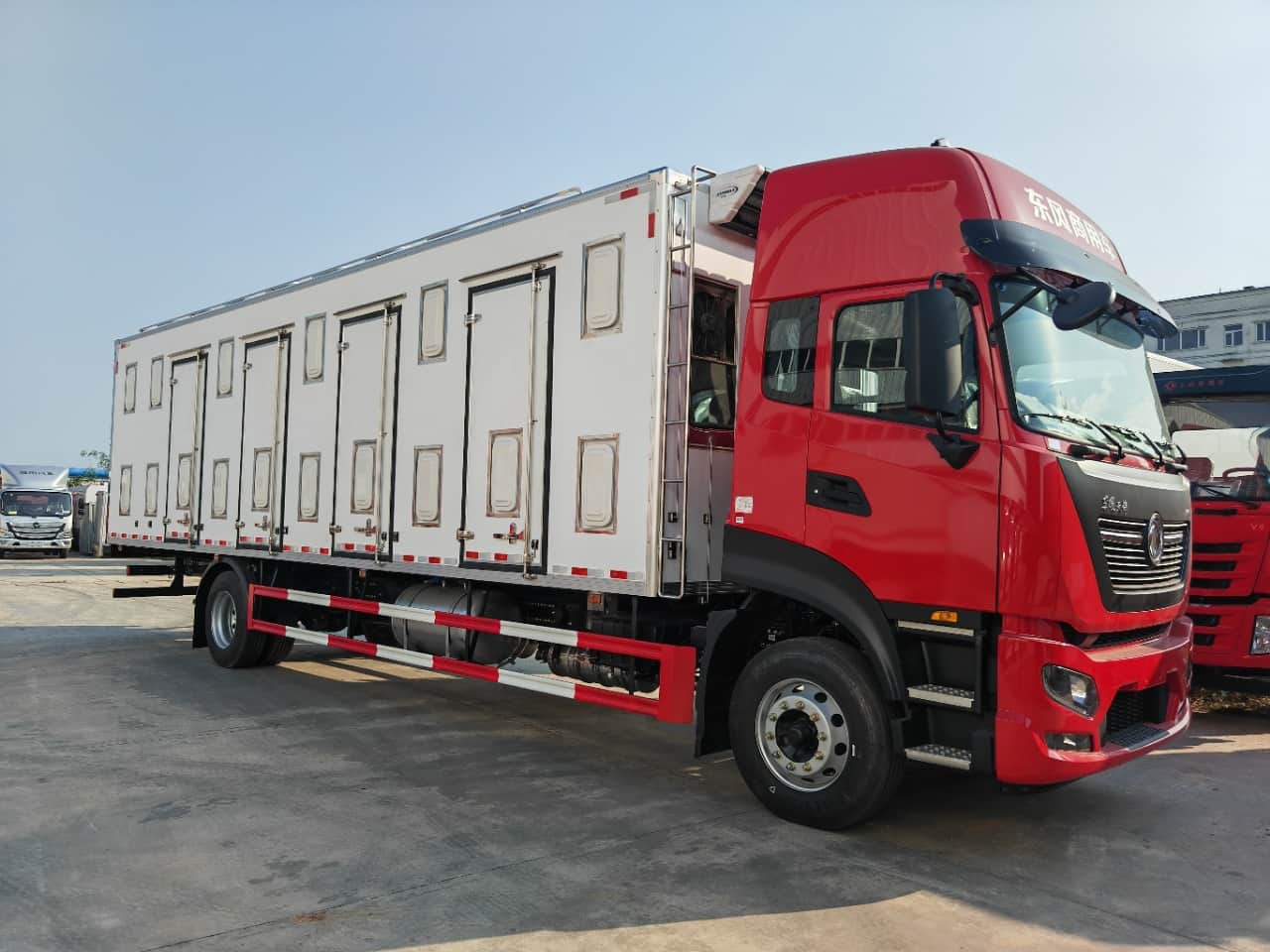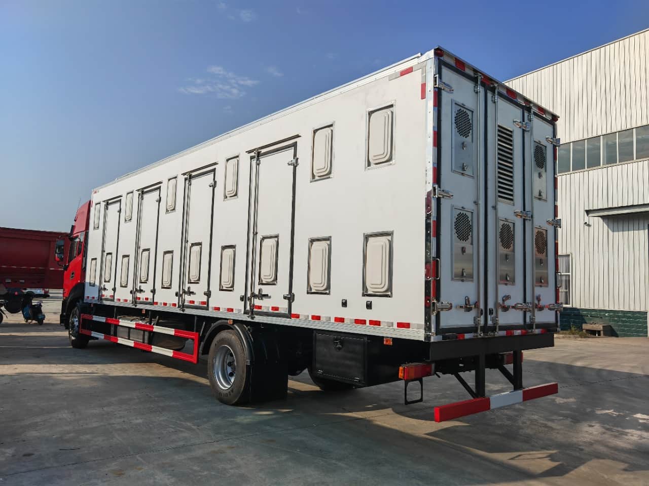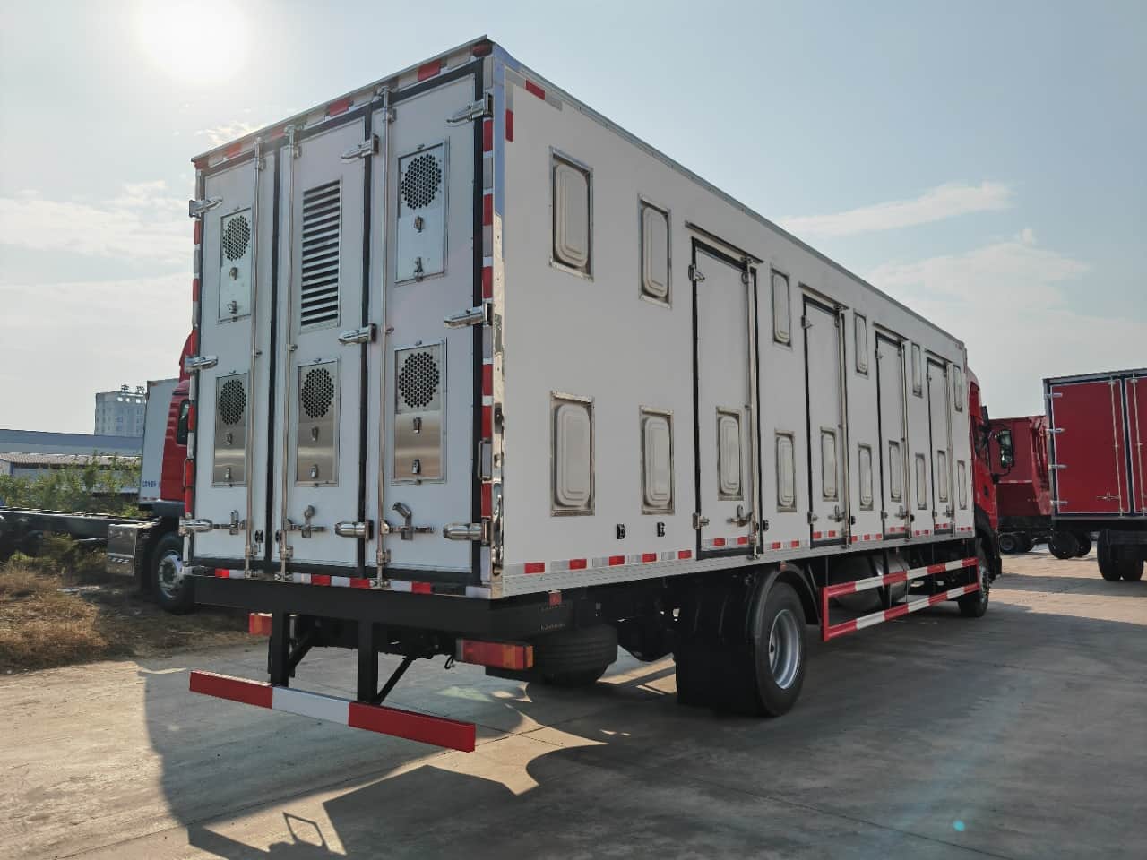 【上装配置】厢体采用内外玻璃钢,中间8cm保温板,厢体底板玻璃钢上面3条不锈钢通风道,尾门框不锈钢包边,不锈钢锁件,2个上车把手。厢体顶灯3个,厢体左右两侧上下两排内嵌式通风窗,左右两侧各4个单侧门,尾门3开(5个滑拉电动通风窗,一个百叶窗),厢体前板外左右上方2个滑拉窗电动通风扇,内2个风扇,避开冷机通风道,前板内冷机通风道加装2个风扇。厢体顶部9个电动天窗(向内吹风),顶部两侧各9个电动排气扇(向外抽风),厢体地板前部两个排水孔。驾驶室控制通风窗,加装温度显示。加装一层4段不锈钢田字格货架。底盘发电机改装加装大。