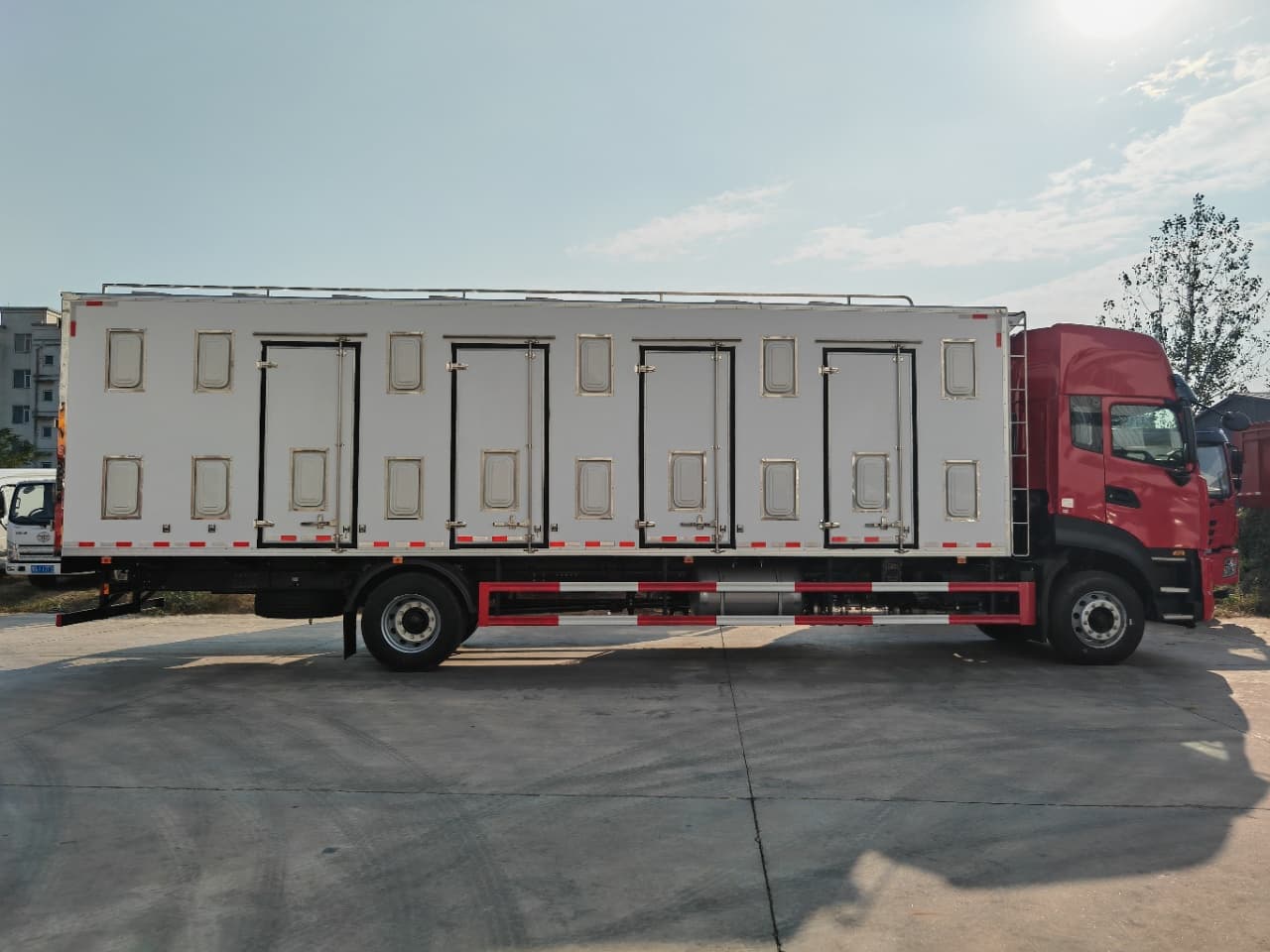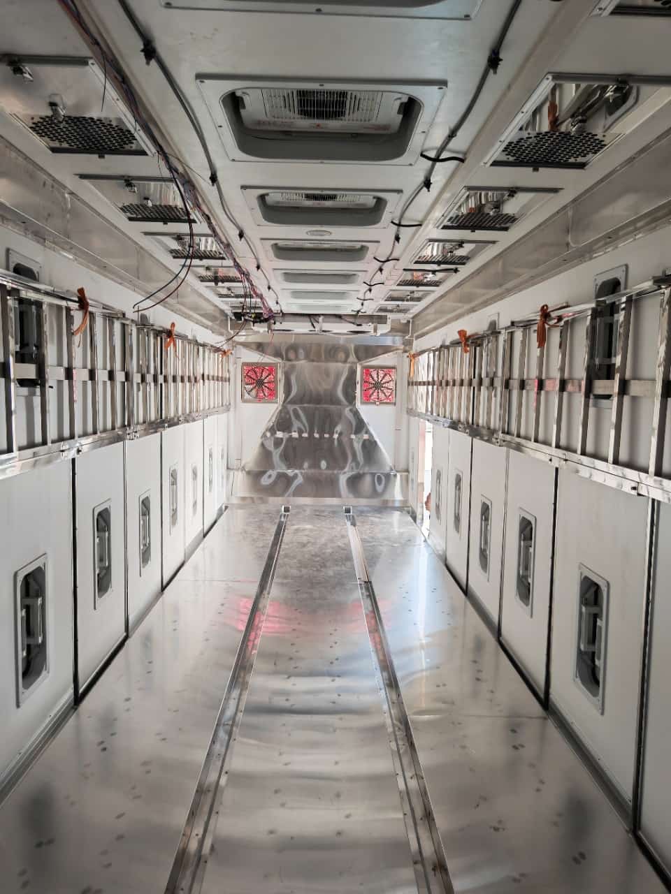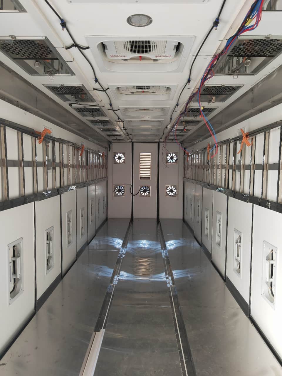 【上装配置】厢体采用内外玻璃钢,中间8cm保温板,厢体底板玻璃钢上面3条不锈钢通风道,尾门框不锈钢包边,不锈钢锁件,2个上车把手。厢体顶灯3个,厢体左右两侧上下两排内嵌式通风窗,左右两侧各4个单侧门,尾门3开(5个滑拉电动通风窗,一个百叶窗),厢体前板外左右上方2个滑拉窗电动通风扇,内2个风扇,避开冷机通风道,前板内冷机通风道加装2个风扇。厢体顶部9个电动天窗(向内吹风),顶部两侧各9个电动排气扇(向外抽风),厢体地板前部两个排水孔。驾驶室控制通风窗,加装温度显示。加装一层4段不锈钢田字格货架。底盘发电机改装加装大。
