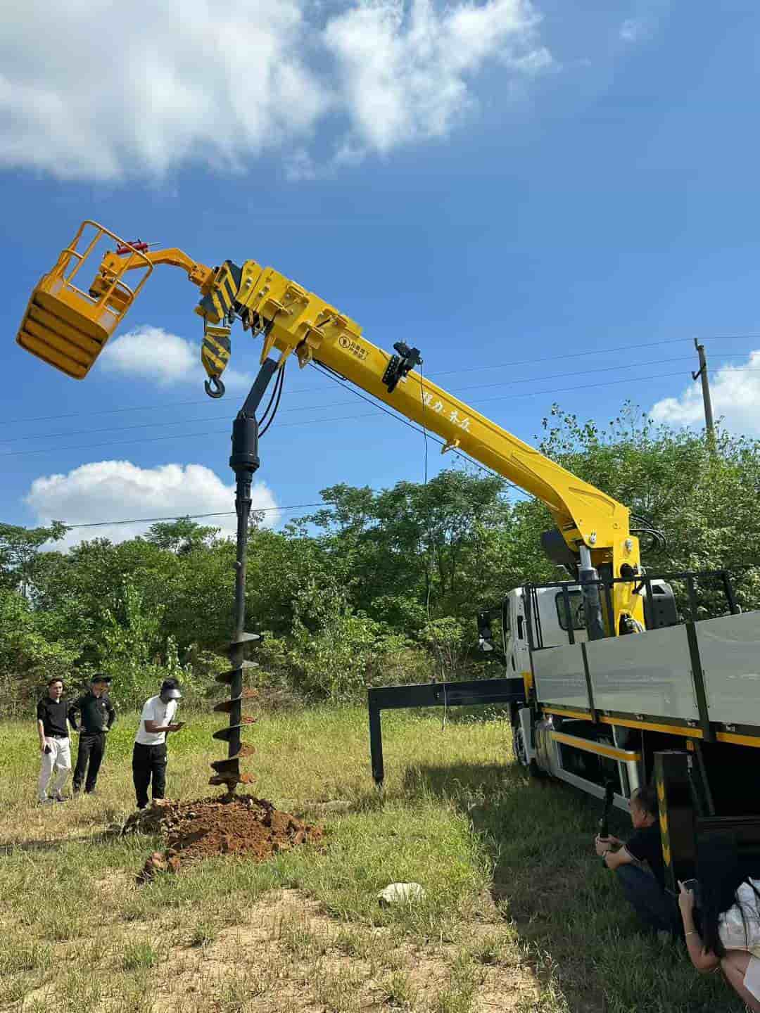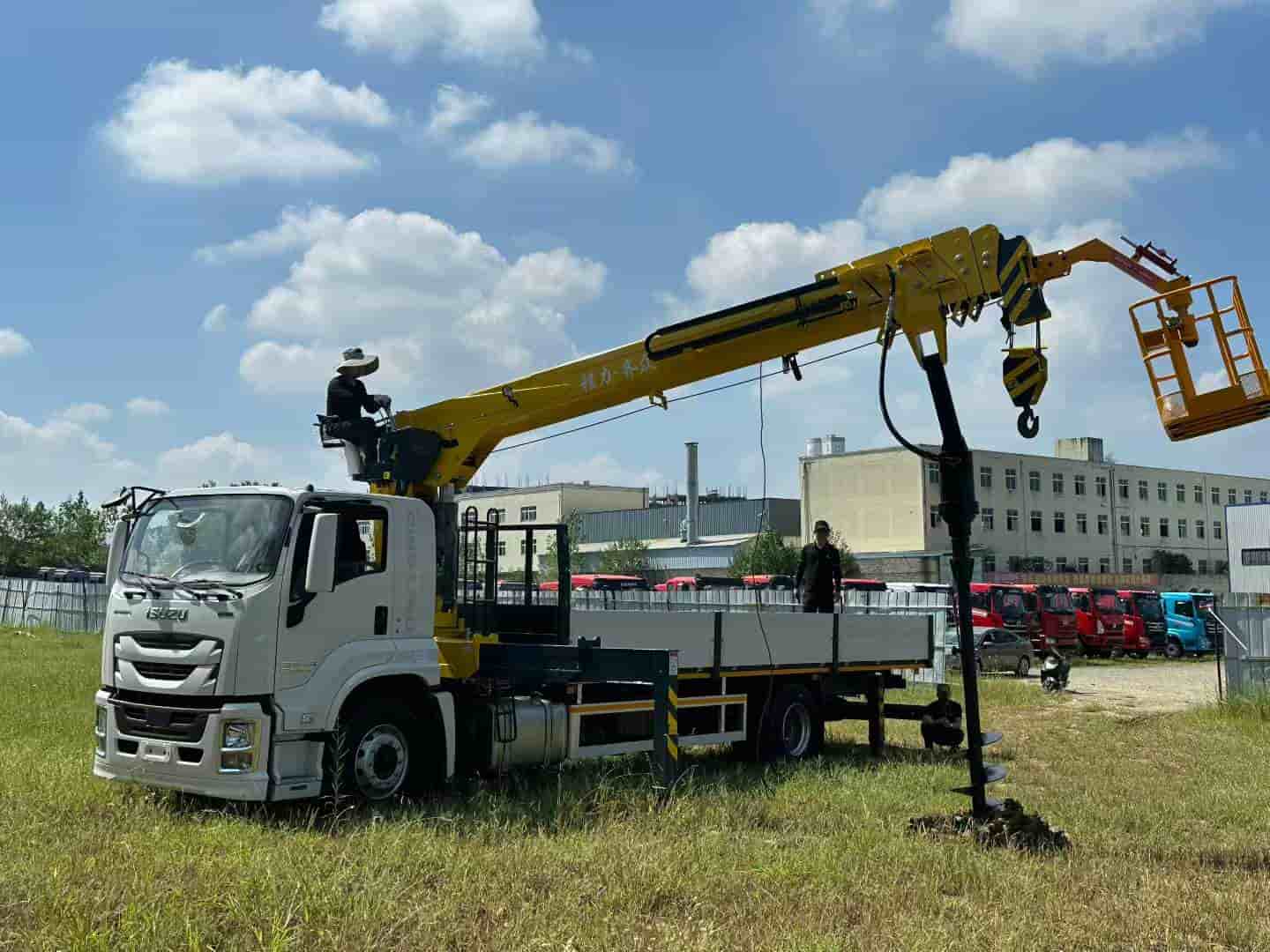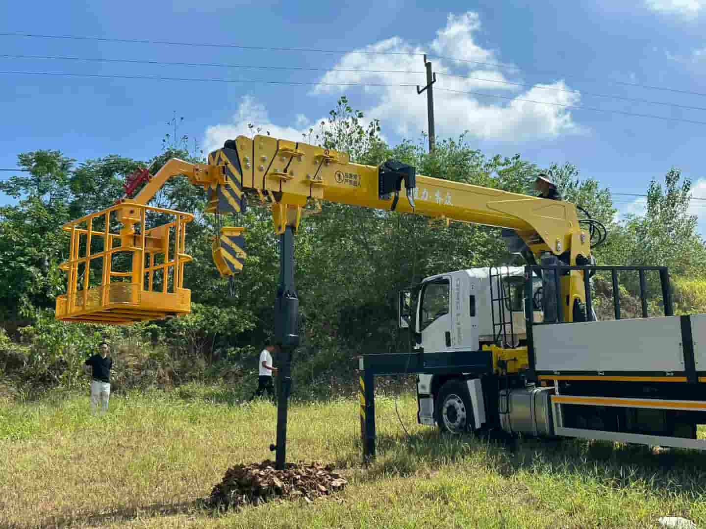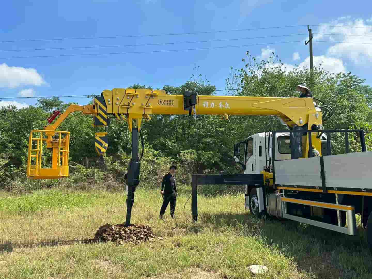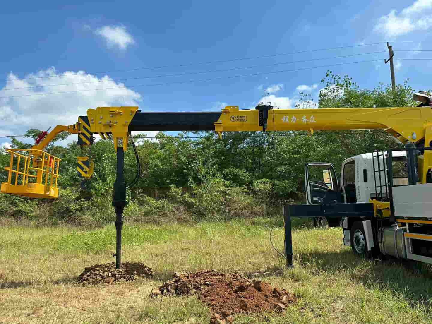 上装8吨五节臂,臂长19.5米,带2.2米深直径45cm的钻孔、加装高空吊栏,一车多用