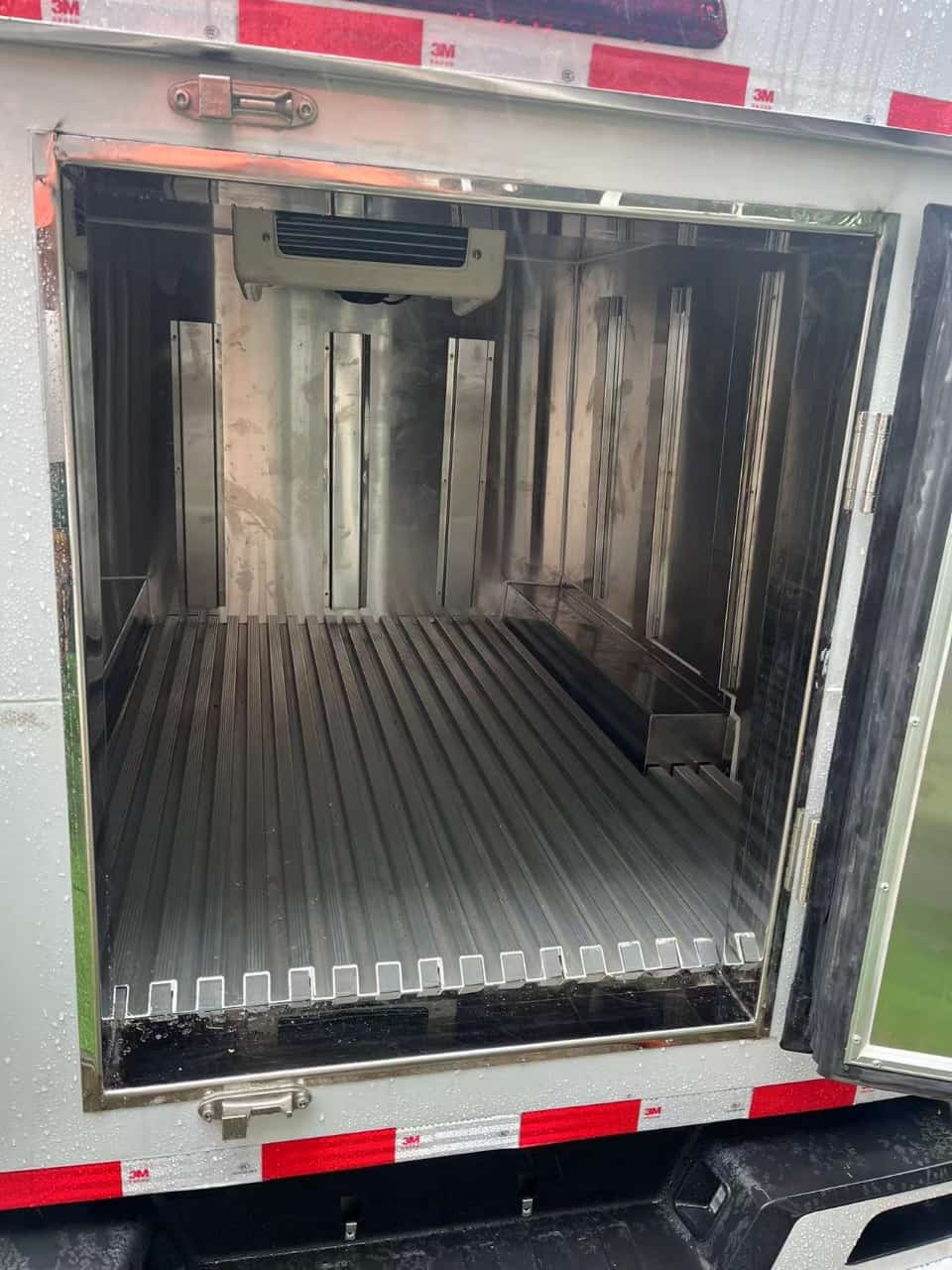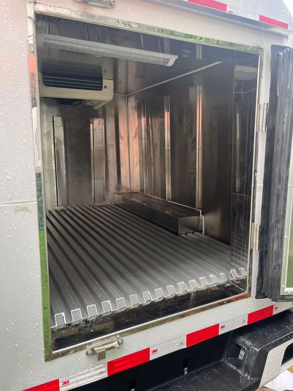 (2)厢板材质:内外壁板选用国内优质玻璃钢(不吸光、隔热性好、硬度强、抗氧化);中间保温层5公分为XPS挤塑聚苯板。地板采用铝花纹板,门边条采用迷宫式橡胶密封条。