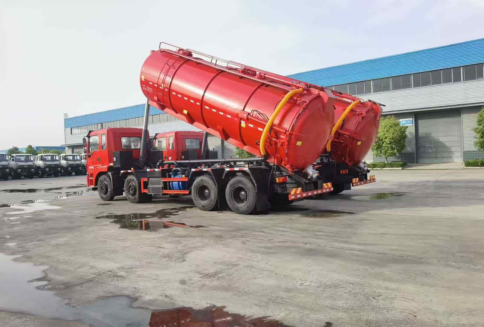 上装配置:罐体容积约22方,8m碳钢板材,选装安装SK204水环泵配,后封头液压打开。后封头可选装上一个800水泥盖放污,可液压开启,后封头一个6寸出口,一个100寸进口直通罐顶,罐内铺不锈钢板,加强型车架,自卸车设计,罐体尾部箭头灯,带一个视污窗口。带8米吸污管。其余厂内标配!