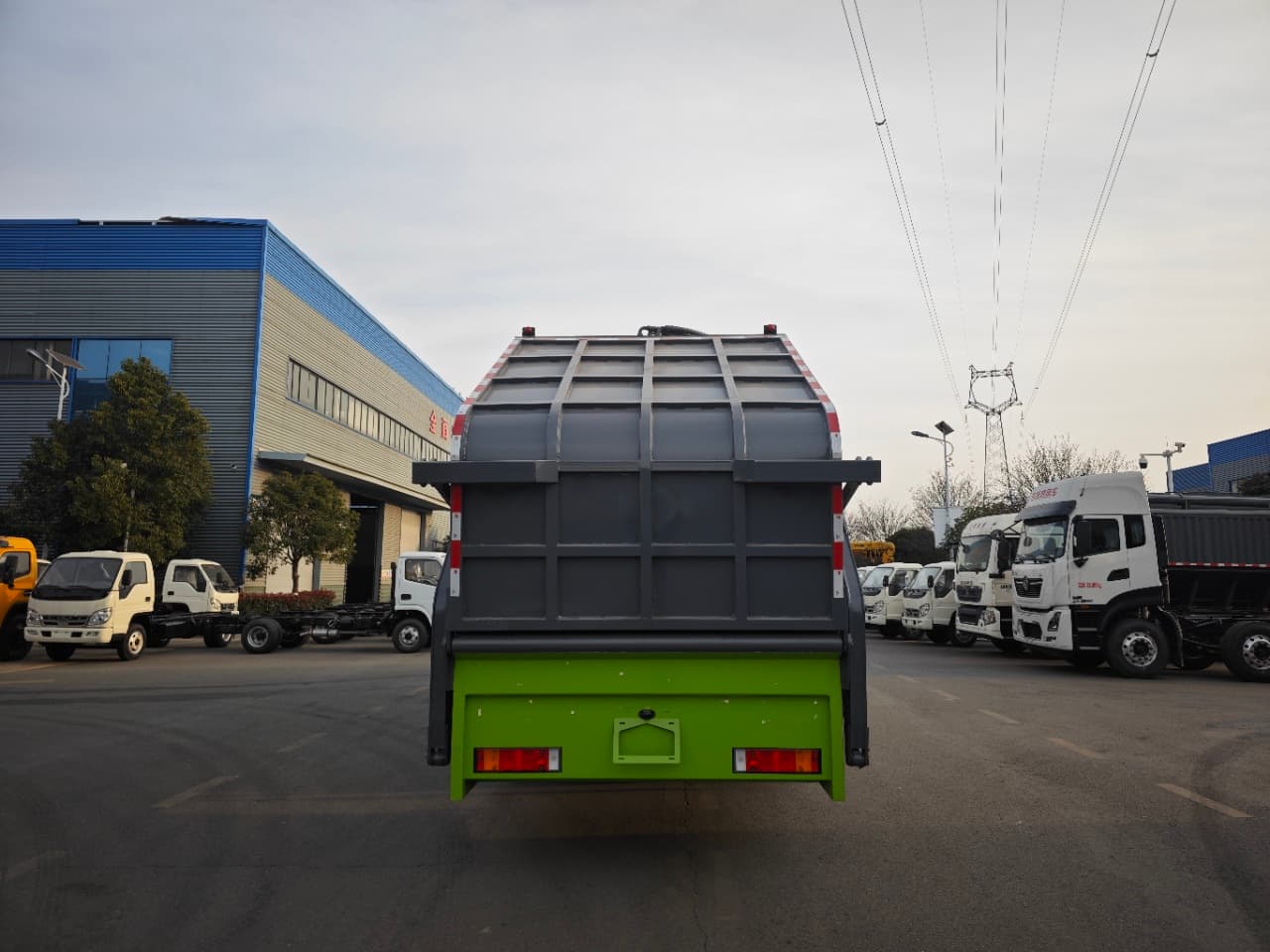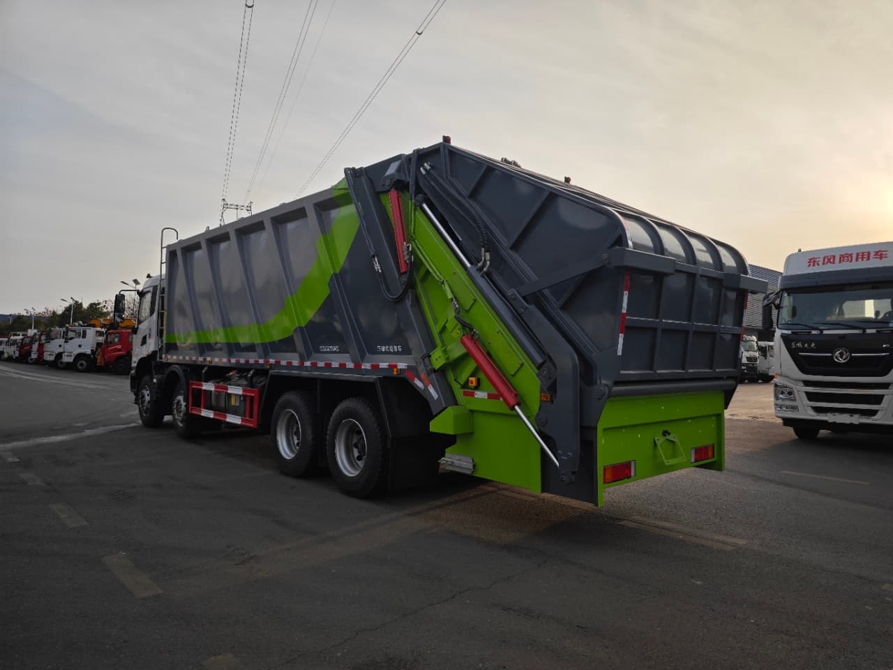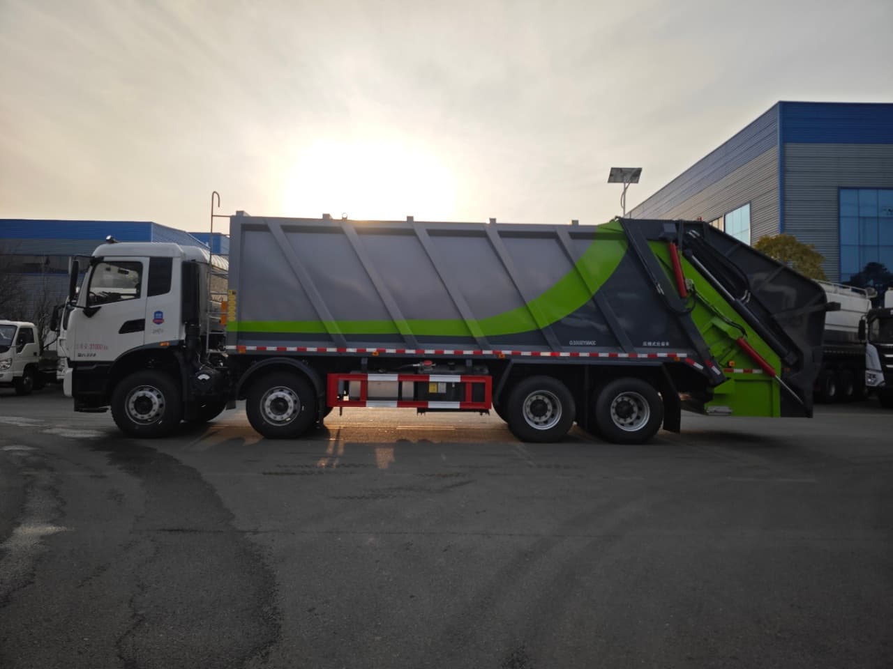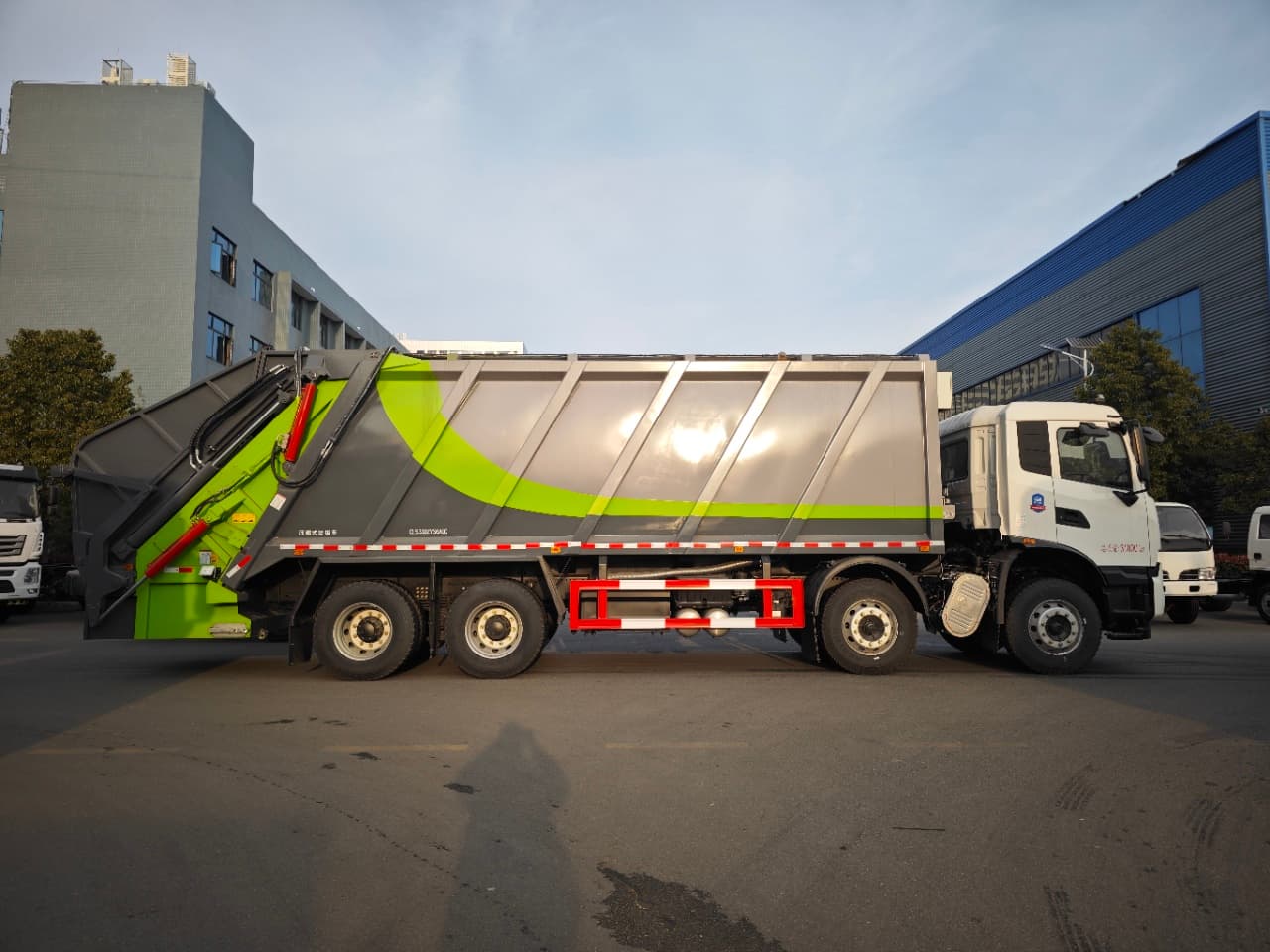 上装配置:箱体容积约33方,全车采用Q355高强度耐磨板,箱体边5底6制作,填充器边板6mm底10mm厚,滑板、滑道20mm厚,上装电液配置:取力器,双联泵,多路阀,平衡阀,压缩阀,截流阀,压油缸(所有油缸经过调质处理,带缓冲),高压油管,高压钢管,液压油箱带3次过虑虑网,所有油缸轴销经过淬火处理,增加硬度不易弯曲断裂, CAN勘总线智能屏一键操作系统,带无线遥控,系统程序可根据用户使用条件需求在智能屏上自行设置,可自行设置自动运行转换时间,油门控制大小,带自动故障检测,报警提示功能,其它标配。