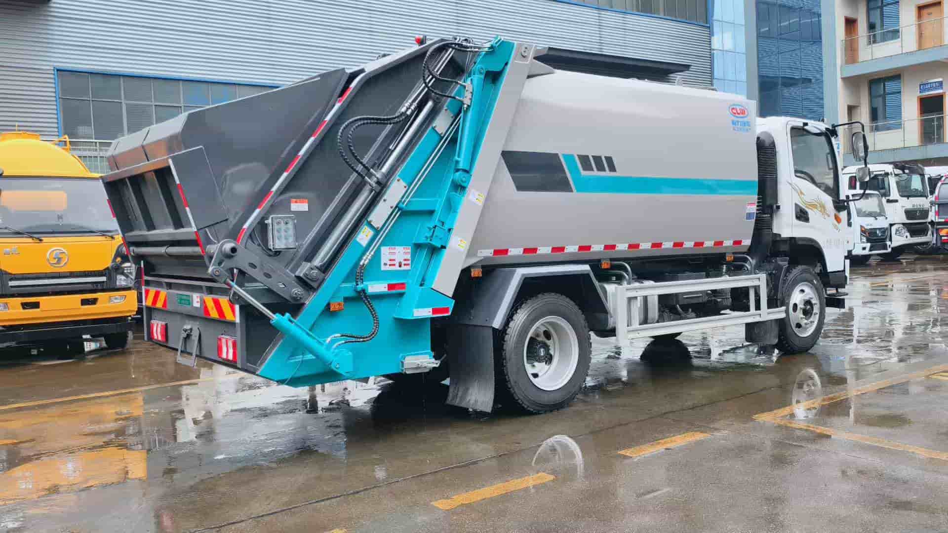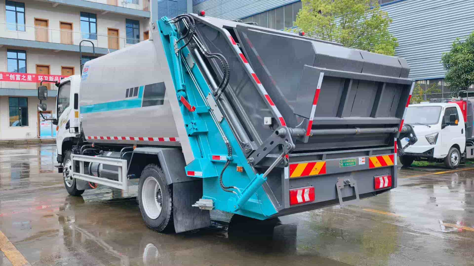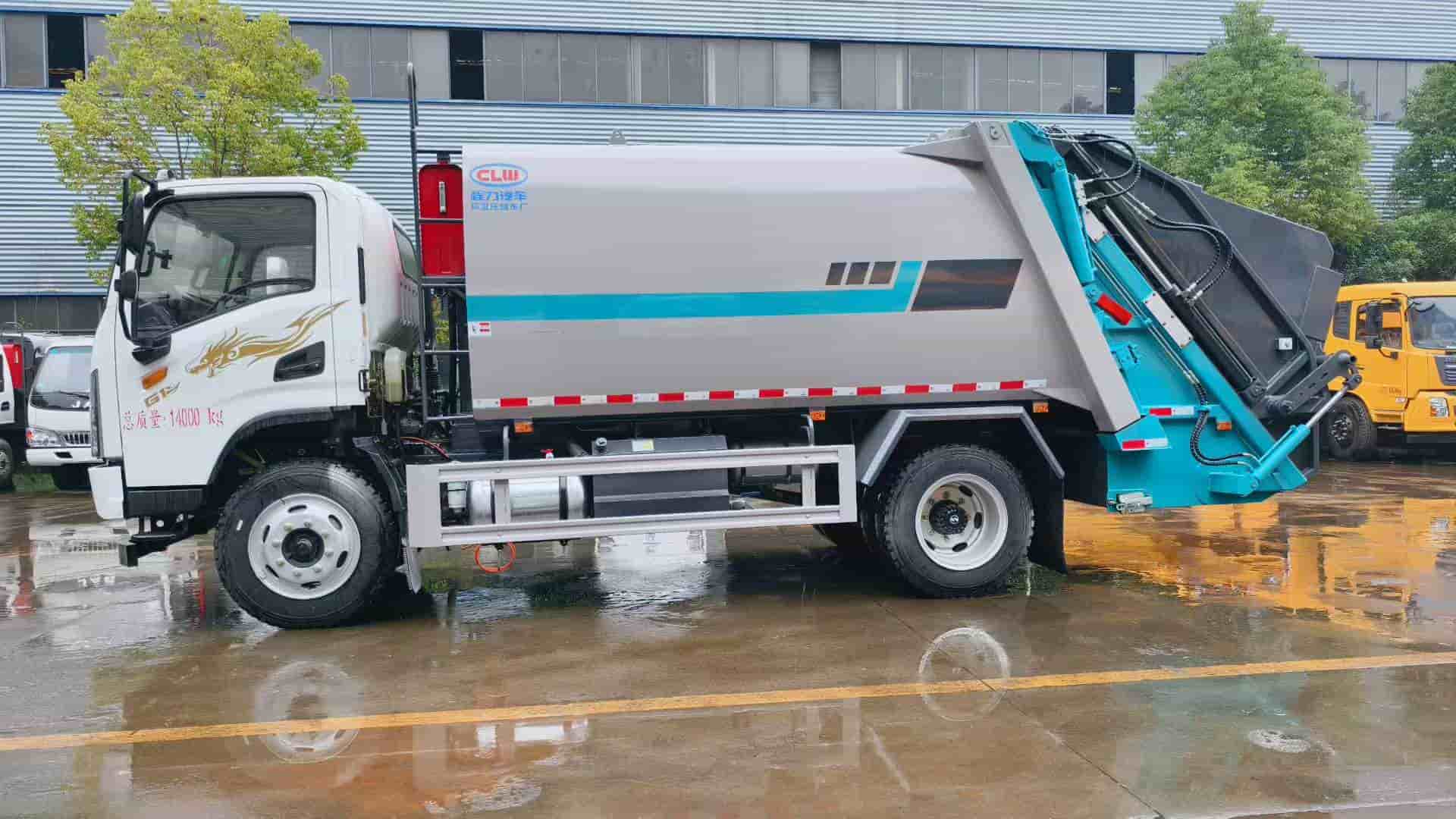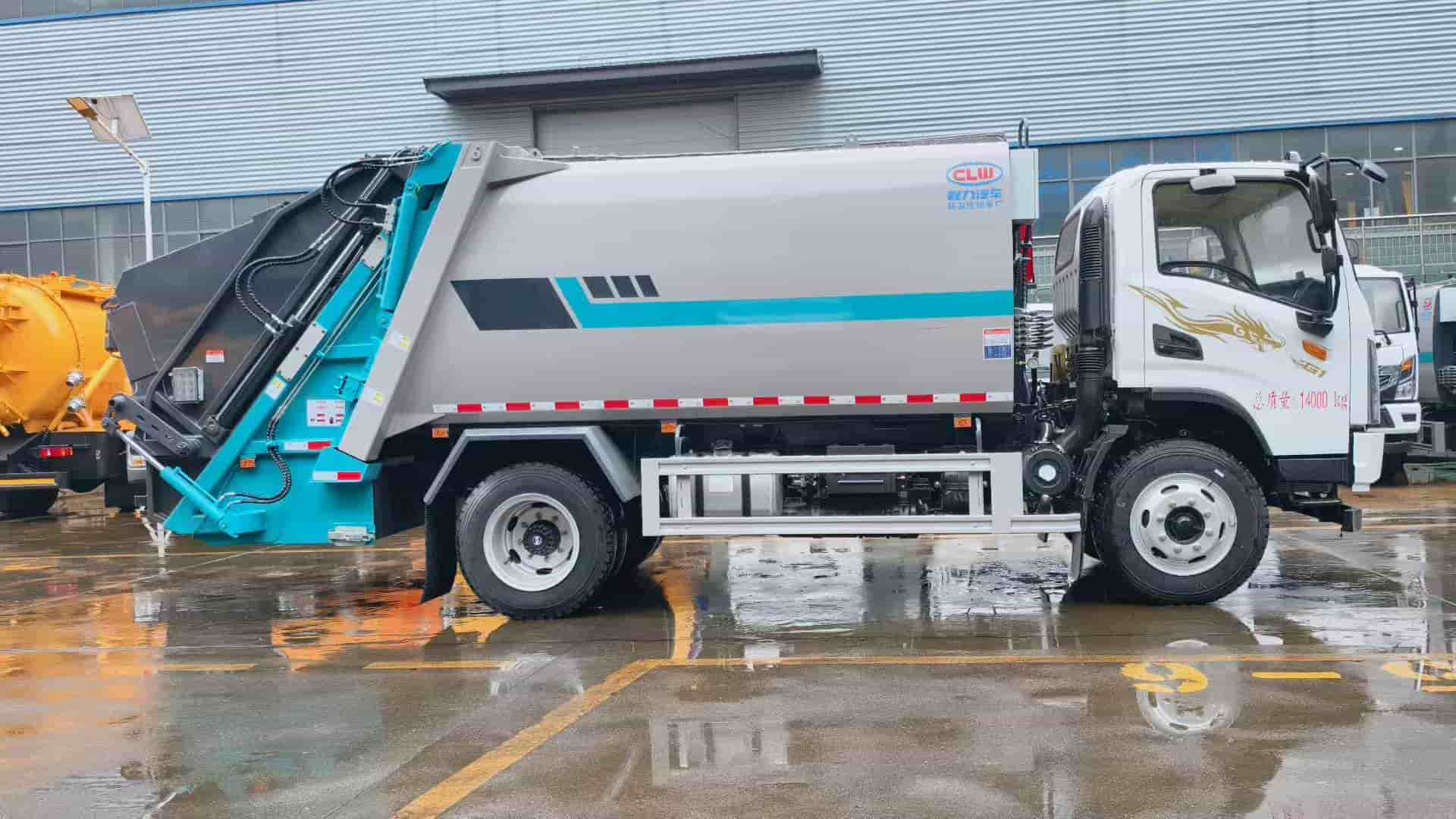 玉柴4.0排量180马力发动机,陕齿八档变速箱,3800轴距,825钢丝胎,尾部三角斗带挂桶翻转机构。