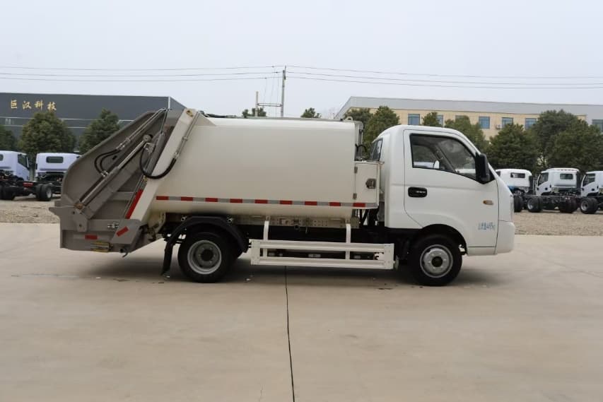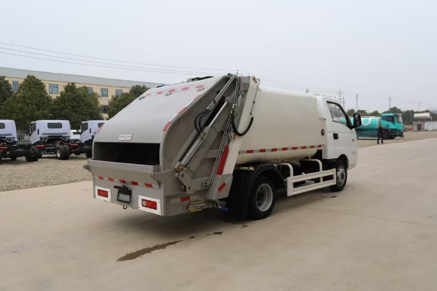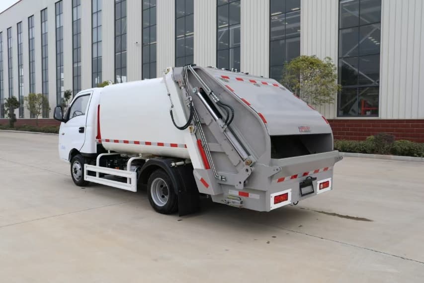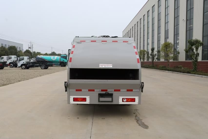 上装配置:涂装为最新工艺喷粉加烤漆,箱体容积为5立方米,弧形箱体,高强度钢制作,国产油缸、标配睿宸油泵,扬州中梅多路阀 ,后带翻桶架,可挂2只国标240L方塑料桶。